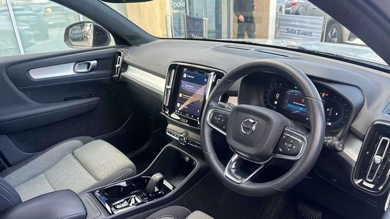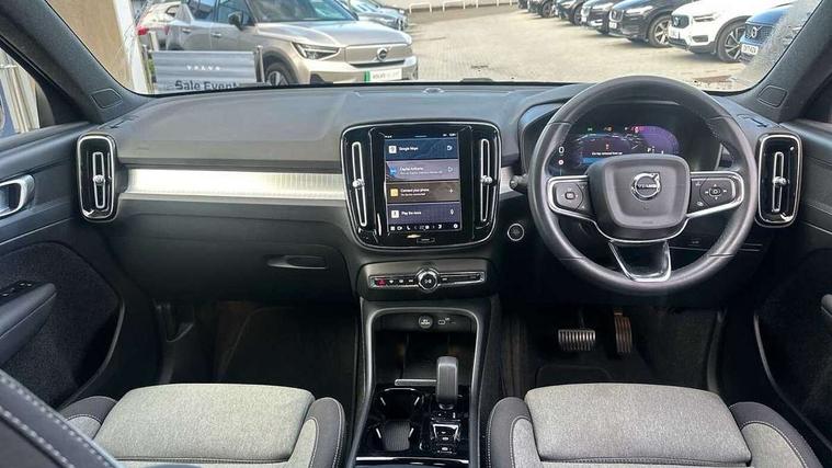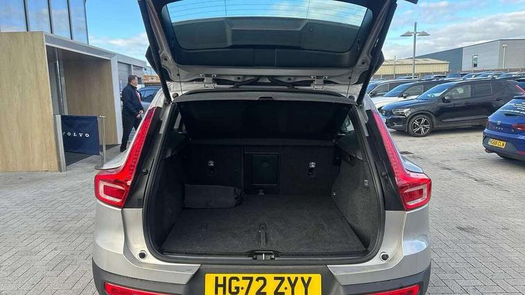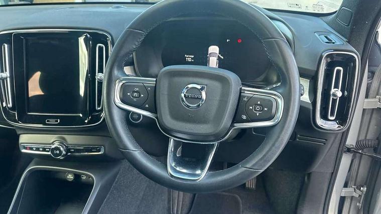 12.3" Progressive Driver Display, 9" centre console portrait touch screen, Adjustable steering wheel force, Bluetooth hands free telephone kit, Cruise control, Driver awareness - blind spot information system with steer assist, cross traffic alert with autobrake, rear collision warning and migitation, E-call, Front park assist, Google automatic services - Nav with google maps, apple carplay/android auto, voice recognition with google assistant, Hands free power tailgate, Lane keep assist with driver alert control, Oncoming Lane Mitigation, Rear park assist, Rear park assist camera, Speed limiter, Speed sensitive steering, Wireless/Inductive Mobile Phone Charging, Dynamic chassis, DAB Digital radio, High performance sound, 8 speakers/250W, front USB and 2 rear type C USB, Steering wheel mounted remote controls, Adaptive brake lights with high level LED brake lights, Auto dimming feature for exterior door mirrors, Auto dimming interior mirror, Automatic headlamp levelling, Automatic LED Headlights + Active high beam incorporating daytime running lights, Front aluminium tread plates, Front and rear electric windows, High gloss black front and rear skid plate, High gloss black mesh front grille with high gloss black surround, High gloss black window trim, Home safe and approach lighting, Integrated roof rails in high gloss black, LED front fog lights, Puddle lights, Rain sensor with automatic windscreen wiper activation, Rear side wing doors, Rear wiper, Roof antenna, Roof spoiler, Visible VIN plate, 12V socket in front tunnel console and luggage compartment, 2-Zone electronic climate control with CleanZone air quality system and pollen filter, 3 seat bench in 2nd row, 3 Spoke tailored steering wheel with chrome trim, 60/40 versatile split folding rear seat, A-pillar parking ticket holder, Ambient front door and instrumental panel lighting, Centre console cupholders and storage, Flexible load floor and grocery bag holder, Floor mats, Front door pocket and front cupholder illumination, Front footwell illumination, Front headrests, Front reading light and theatre lighting, Front seat cushion extensions, Front tunnel pocket, Glovebox bag hook, Heated front seats, Height adjustable passenger seat, Height/reach adjustable steering column, High gloss centre tunnel deco, Illuminated glovebox, Illuminated luggage compartment, Illuminated tailgate, Illuminated vanity mirrors, Integrated waste bin, Isofix attachments on outer rear seats, Load protection net, Multi directional lumbar support, Power driver seat with memory + exterior mirrors memory, Rear armrest / integral cup holders / storage tray, Rear headrests, Rear reading and courtesy lights, Single front passenger seat, Underfloor cargo storage, Climate pack without heated front seats - XC40, 3x3 point rear seatbelts, City safety with steering support with Pedestrian + cyclist + front collision warning with full auto brake and rear auto brake, Drivers knee airbag, Dual stage driver/passenger airbags, Electronic parking brake with auto hold, First aid kit, Front and outer rear seatbelt reminder and pretensioners, Front seats SIPS airbags, Hill descent control, Hill start assist, Inflatable curtain, Passenger airbag cut-off device, Power child locks on rear doors, Road sign information display, Run off Road Mitigation, Run off Road Protection, SIPS (Side Impact Protection System), Slippery road and hazard light alert, Stability and Traction Control with Spin control, Engine Drag Control and Corner Traction Control, Tyre pressure monitoring system, Vehicle deceleration control with Anti-lock Brake System, Electronic Brake Distribution and Emergency Brake Assist, Warning triangle, WHIPS whiplash protection system - front, Anti-theft alarm including immobiliser/volume sensor + level sensor, Key integrated remote control central locking + fuel flap with deadlocking system and auto open/close power windows, Keyless drive includes keyless entry and keyless start, Locking wheel nuts,