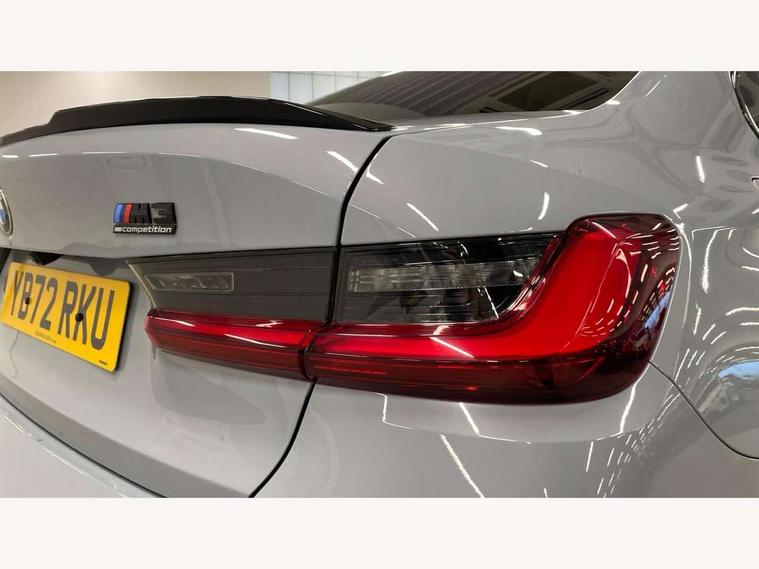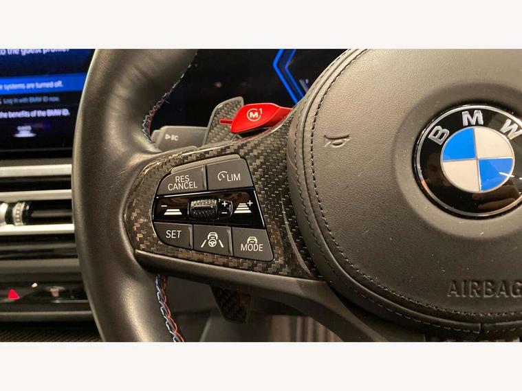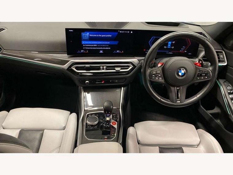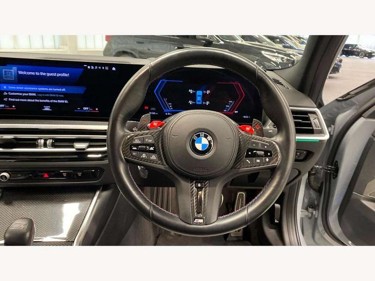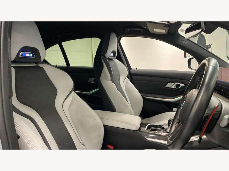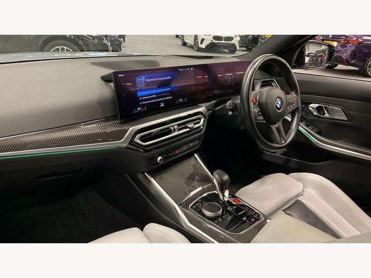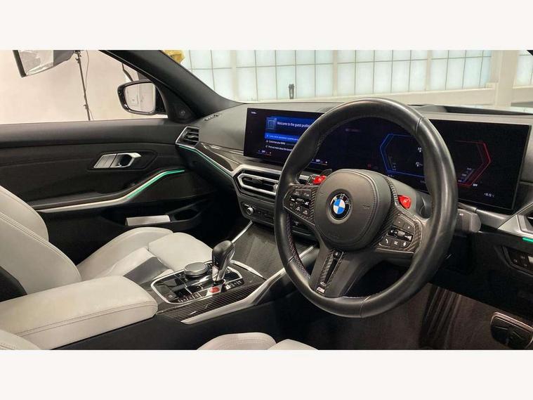 Active guard plus, Automatic start/stop system, Bluetooth functionality with Apple CarPlay/Android Auto, BMW iDrive controller on centre console, BMW legal emergency call, BMW Live Cockpit Professional sat nav system with 12.3" instrument display and high resolution control display, BMW Online services, BMW Teleservices, Brake pad wear indicator warning light, Condition based service, Connected drive services, Door/boot open warning light, Driving experience switch, Head up Display, Illuminated control elements, Instrument cluster with extended contents, Lights on warning, M drive buttons, Oil sensor for level and grade, warning by check control system, Oil temperature gauge, On board computer, On board diagnostics, Optimum shift indicator, Outside temperature display, Pull away assistant, Run flat indicator, Service interval indicator, Shifting point display, Speed limiter, Variable sport steering, Wi-Fi hotspot, Widescreen display, Adaptive M Sport suspension, Double joint spring strut front axle, M Drive Professional including track mode, laptimer, traction control & Drift analyser, M Sport differential, M steptronic sport transmission with drivelogic, Safety battery terminal clamp, 8 programmable favourite buttons, Auxiliary point for auxiliary devices, BMW professional radio/CD/MP3, DAB Digital radio, Harman/Kardon loudspeaker system, 3rd brake light, Acoustic glazing, Auto dimming driver's door mirror, Auto dimming rear view mirror, Automatic headlights + automatic windscreen wipers, Black chrome exhaust tailpipes, Black model designation badges, BMW emblem on engine compartment lid and tailgate, BMW high gloss shadow line with extended contents, BMW Individual shadowline lights, Body colour bumpers, Body colour door handles, Carbon fibre reinforced plastic (CFRP) roof with high gloss black roof aerial bulge and roof mouldings, Day time running light, Door mirror integrated indicators, Door sill finishers with aluminium inserts, Dynamic brake lights, Electric adjustable heated door mirrors, Electric folding door mirrors, Electric front and rear windows with one touch/convenient open/close function, Follow me home headlights, Front and rear apron plastic in body colour, Front and rear bumper system, Headlight beam throw control, Heat protection, sun protection glazing, Heated rear window with automatic switch off, Heated washer jets, High beam assistant, High gloss black frameless kidney grille with M badge, High gloss black lower bumper edges, side sills and diffuser edge binding, LED number plate light, LED tail lights with 3D L-shaped LED light design, M designation, M Sport entry door sill strips, Mirror glass aspheric on driver's side, convex on passenger side, Rear boot, Rear fog lights, Rear reflectors, Rear right M3 competition inscription, Rear side wing doors, Reversing light, Shark fin roof aerial, Strakes in front side panel, black matt/black high-gloss, with model badge, Visible VIN plate, Welcome lighting, 2 front cupholder in centre console with clamping elements and matt black inlay, 2 x 12 V Power sockets (luggage compartment and front centre console), 2 x USB Type C ports for charging and data transmission in front centre console, 2 x USB Type C ports for charging in rear centre console, 3 folding rear headrests, 3 seat bench in 2nd row, Ambient inside door handle light, Ambient lighting for instrument panel, Ambient lighting for storage compartment, Ambient lighting front and rear, Ambient lighting in door panels, Anthracite headlining, Battery in luggage compartment, Carbon fibre centre console incl. cover for cupholders and storage compartment, Carbon fibre decorative steering wheel finishers, Carbon fibre shift paddles, Carbon fibre strip in instrument panel on front passenger side, Centre console armrest with storage compartment, Compartment in front of cupholder, Driver/passenger sunvisors with illuminated vanity mirrors + covers, Dynamic ambient interior lighting, Electric front seats + driver memory, English handbook, Floor mats in velour, Folding rear centre armrest with 2 cupholders, Footwell lighting, Front and rear ambient footwell lighting, Front and rear door exit lights, Front door storage bins with bottle holder, Front interior light, Front isofix attachment + airbag deactivation, Front seat backrest width adjustment, Front seats lumbar support, Front/rear door armrests, Gearshift lever with embossed M badge, Heated front seats, Height adjustable front headrests, Interior mirror lighting, Isofix on 2nd row outer seats, Lockable/illuminated glovebox, Luggage compartment lighting, Manual 40:20:40 split folding rear seat with two tilt positions for backrest, Multifunction steering wheel, Rake/reach adjustable steering wheel, Single front passenger seat, Storage compartment in rear doors, Three zone automatic air conditioning, Through loading system, Toolkit located in luggage compartment, Wireless charging tray, Additional storage compartment pack - M3, Connected package professional - M3, High gloss shadowline exterior trim pack - M3, 3 point seatbelts on all seats, ABS/EBD, Automatic Stability Control (ASC), Brake energy regeneration, Brake fade compensation, Compound structure brake discs, Cornering brake control (CBC), Crash sensor, Driver/Front Passenger airbags, Dry braking, Dynamic brake control, Dynamic Stability Control with M Dynamic mode, Dynamic Traction Control - DTC, Electromechanical parking brake, Electronic differential lock control (EDLC), Front and rear head airbags, Front seat side impact airbags, Front seatbelt pretensioners + load limiters, Hill start assist, M Sport seat belts, Rear child proof door locks, Seatbelt warning, Side impact protection, Two tone horn, Tyre pressure sensor, Warning triangle and first aid kit, Centre lock switch, Closing system with central locking, Digital key, Electronic immobiliser, Thatcham cat 1 remote alarm, Vehicle Key with 4 buttons including the integrated key, Galvanic finish to control surroun