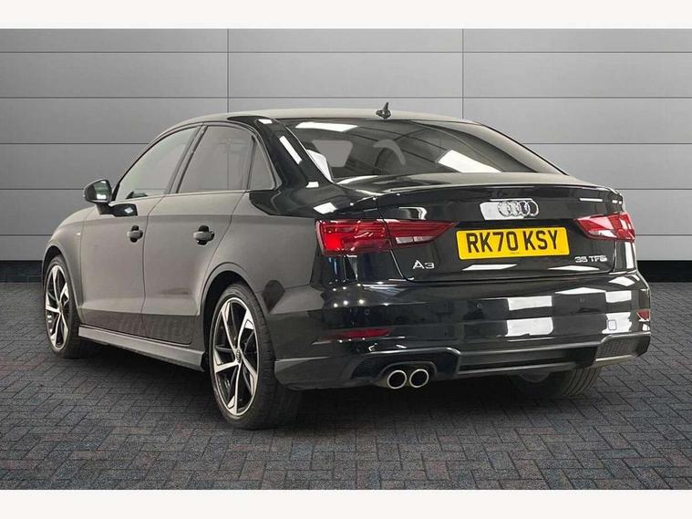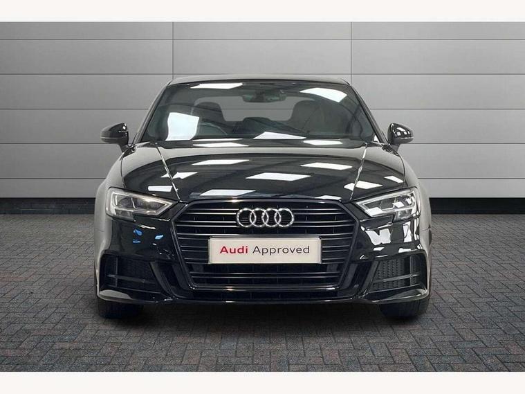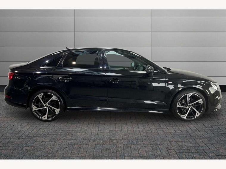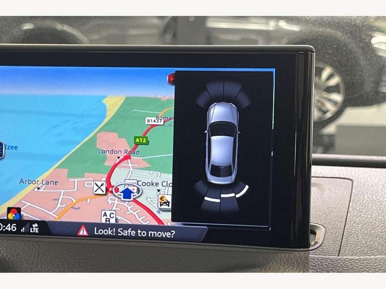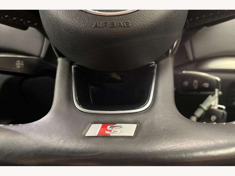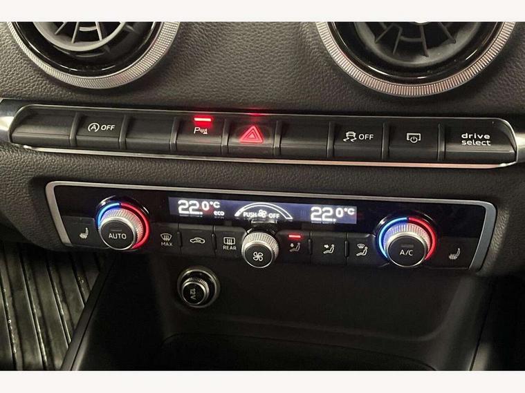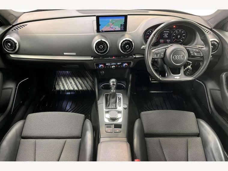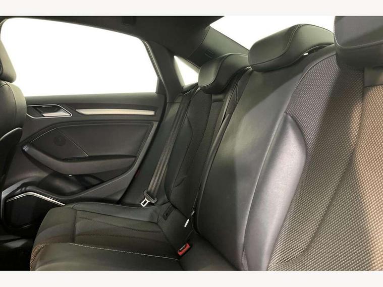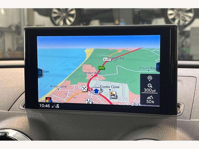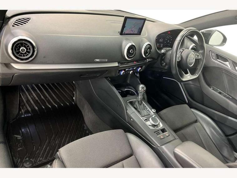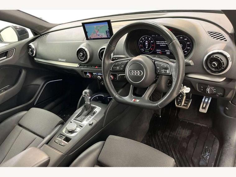 Audi connect, Audi drive select, Audi smartphone interface, Automatic start/stop system, Bluetooth interface, Colour driver's information system display, Electro-mechanical PAS, SD card based MMI navigation, Service indicator, Voice control system, Sports suspension, 2 USB interfaces and Aux-In jack, CD player, DAB Digital radio, MMI radio plus with 7" colour MMI screen and MMI controller, Two SDXC card slots, Auto dimming rear view mirror, Automatic lights and wipers, Black door mirrors, Body colour bumpers, Dual branch tailpipe, Electrically adjustable and heated door mirrors with integrated LED side indicators, Front and rear electric windows, Heated rear window, Heated windscreen washer jets, Model and engine designation badges at rear, Privacy glass - dark tinted rear and rear side windows from B-pillar backwards, S Line badges on the front wings, S Line body styling with high gloss dark chrome radiator grille and rear diffuser in platinum grey, S Line roof edge spoiler, Single chrome exhaust tailpipe, 3 adjustable rear headrests, 3 spoke flat bottomed high multi-function leather sport steering wheel with gearshift paddles, 4 lashing points to secure luggage, 60/40 split folding rear seat, Adjustable front centre armrest, Black cloth headlining, Driver/passenger sunvisors, Dual zone electronic climate control, Front and rear interior lights with delay, Front sport seats with S embossed logo, Front/rear floor mats, Height/depth adjustable steering column, Illuminated door sill trims with S logo, Illuminated glovebox, Illuminated luggage compartment, ISOFIX child seat mounting and Top Tether with front passenger airbag deactivation, Manual height adjustable front seats, Stainless steel pedals, Storage compartments in doors side trims, centre console and under front drivers seat, Black styling pack - A3/S3, LED interior light pack - A3/RS3, Non smoking pack - A3, Storage and luggage pack - A3/RS3, 3 point seatbelts on all seats, ABS/EBD, Active front headrests, Airbags - front driver/passenger, front & rear side, curtain, drivers knee, ASR, EDL, Electromechanical parking brake, ESC - Electronic Stability Control + traction control, Hill hold assist, Predictive pedestrian protection, Seatbelt warning, Tyre pressure warning, Warning triangle and first aid kit, Anti theft alarm, Anti-theft wheel bolts, Immobiliser, Remote control central locking, Aluminium air vent surrounds, Aluminium trim elements, Matt brushed aluminium inlays, 18" 5 arm trapezoid design sport alloy wheels in gloss anthracite black with diamond cut finish, Tool kit, Tyre repair kit,