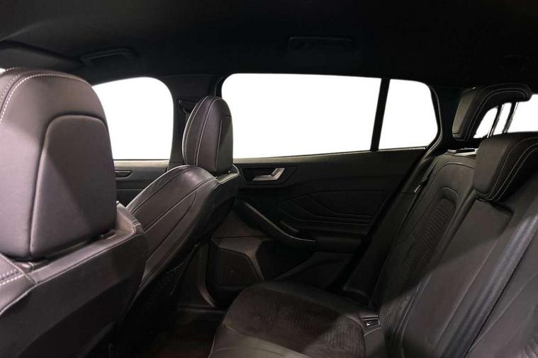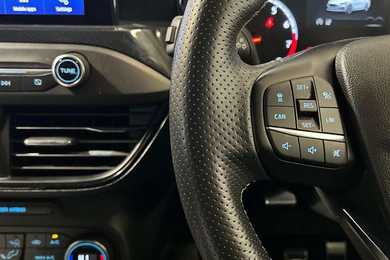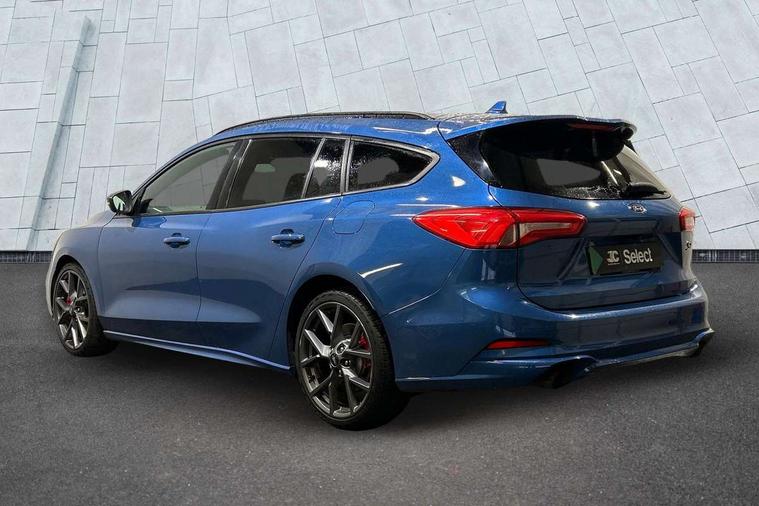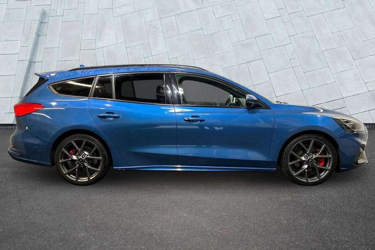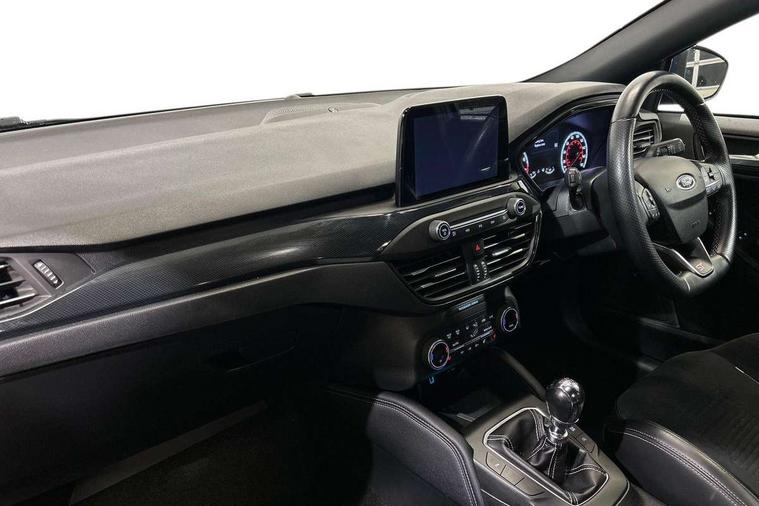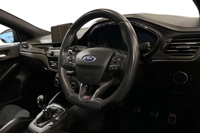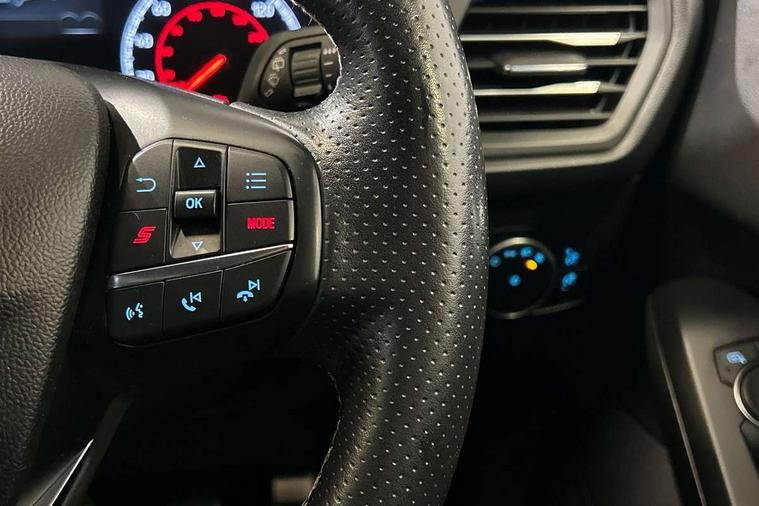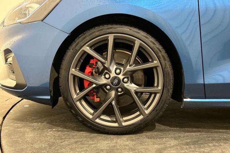 Bluetooth system, Digital clock, Easy fuel capless refuelling system, Eco mode, Ford pass connect, Front and rear parking sensors, Intelligent speed assist, Lane keeping aid with lane departure warning, PAS, Rear wide view camera, Selectable drive mode, Trip computer, Electronic limited slip differential, Unique ST sport suspension, 2 USB ports, Aux input, B&O Audio system with 360 degree sound, 10 speakers, 675 watts of total amplifier power and digital sound processor, 'Quickclear' heated windscreen/heated washer jets, Adaptive front lighting system with dynamic LED headlights, glare-free high beam and LED turn indicators, Auto dimming rear view mirror, Auto headlamps (on/off), Automatic rain sensing wipers, Body colour large rear spoiler, Body colour side skirt, Body coloured bumpers, Body coloured door handles, Body coloured electrically operated and heated door mirrors with side indicators, Electrically operated front and rear windows with one touch opening and closing, Front variable intermittent wipers with electric wash, Heated rear window, LED daytime running lamp, Polished twin tailpipe, Power folding door mirrors with puddle lights, Rear privacy glass, Roof rails, Scuff plates front, polished stainless steel with etched ST logo, ST upper and lower grille with full body styling kit and front and rear ST badge, Tailgate wash/wipe, Twin exhaust pipes, Unique door and instrument panel inserts, 2nd Load floor, 6 way power adjustable driver seat, 60/40 split back and cushion rear seats with 2 height adjustable headrests, Alloy finish pedals, Aluminium gear knob, Auto fold rear seats, Centre console with armrest, Dark headliner, Dual zone electronic air temperature control, Front and rear floor mats with metal grey stitching, Front passenger seat manual height and lumbar adjust, Heated front seats, Heated steering wheel, Height adjustable front headrests, Isofix child seat preparation, Reach + rake adjustable steering column, Rear centre headrest, Recaro part leather upholstery, Soft console knee pads with red stitching, Driver assistance pack with Adaptive Cruise Control - Focus, ABS+Electronic Brake force Distribution, Auto hold function, Driver airbag, Electronic parking brake, Electronic stability control, Front and rear seatbelt reminder, Front inertia reel height adjustable seatbelts with pre-tensioners, Front passenger airbag, Front side airbags, Hill start assist, Passenger airbag deactivate switch, Post collision braking, Pre collision assist with autonomous emergency braking and pedestrian/cyclist detection, Red brake calipers, Side curtain airbags, Three rear inertia reel lap/diagonal seatbelts, Tyre pressure monitoring system, Ford keyfree system with Keyless entry and keyless start/sleep mode key fob, MyKey system, Remote central locking & engine immobiliser, Thatcham category 1 alarm, Contrast stitching - Red, 19" 5x2 spoke alloy wheel with magnetite finish, Mini steel spare wheel,