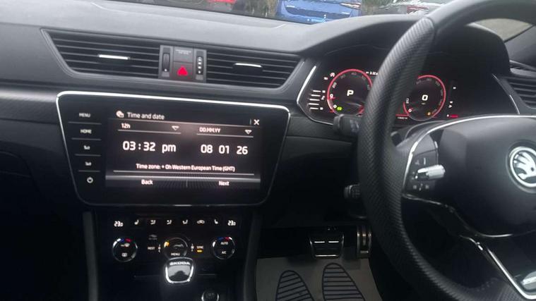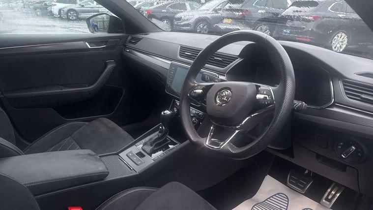 Bluetooth system, CareConnect and Emergency Call, Columbus HDD satellite 3D map navigation with 9.2" colour touch screen, web radio, integrated Wi-Fi, Driver fatigue sensor, Front assist with pedestrian protection, Progressive dynamic steering, Stop/start engine system and energy recovery, Virtual cockpit, Voice control system, Wireless smartlink apple carplay, SmartLink+ android auto, XDS+, 2 USB ports, Bolero radio with 8" touchscreen display, DAB Digital radio, 3rd brake light, Aero front windscreen wipers with intermittent function, Auto dimming rear view mirror, Black rear badge, Body colour door handles, Cornering front fog lights, Electrically adjustable heated and folding door mirrors with memory function, Front and rear electric windows, Full matrix LED headlights with AFS LED DRL integrated with headlight washer LED rear lights(High function), dynamic indicators and lighting animation, Gloss black exterior door mirrors with sports styling including front grill, side strip and window surrounds, Gloss black grille surround with gloss black rib elements, Gloss black rear spoiler (roof), Gloss black strip between rear lights, Light assistant (coming/leaving home/tunnel light), Privacy glass, Rain sensor, Rear exhaust diffuser styling elements, Rear side wing doors, Sportline badging, 12v power point in centre console, 3 seat bench in 2nd row, Black roof headlining, Black textile floor mats, Carbon optic interior elements, Electric auxiliary air heater, Front and rear footwell illumination, Front armrest with storage box, Height adjustable front and rear head restraints, Ice scraper, Illuminated and cooled glovebox, Interior lights with control switches, Isofix child seat fittings on outer rear seats, LED front and rear reading lights, Microsuede/leather upholstery with silver diamond stitching sports seats, One umbrella compartments in driver door with one umbrella in drivers door, Overhead glasses storage compartment, Rear centre armrest with cupholders, Removable parcel shelf, Single front passenger seat, Split folding rear seats, Storage compartment with cover in luggage compartment side panels, Ticket holder on A Pillar, LED package plus - Superb, 3 rear seatbelts, 7 airbags - Front, front side, curtain, driver's knee airbag with front passenger deactivation switch, Driver and passenger seatbelts with warning light, Electronic parking brake, ESC including ABS, EBV, MSR, ASR, EDS, HBA, DSR, RBS, CBC, multi-collision brake (MKB) and Auto hold, Hill start assist, Power operated child lock in rear doors, Tyre pressure monitor, Alarm with interior monitoring tilt sensor and back up horn, Electronic engine immobiliser, Keyless entry and start/stop, Remote central locking with SAFE system, Third remote key,