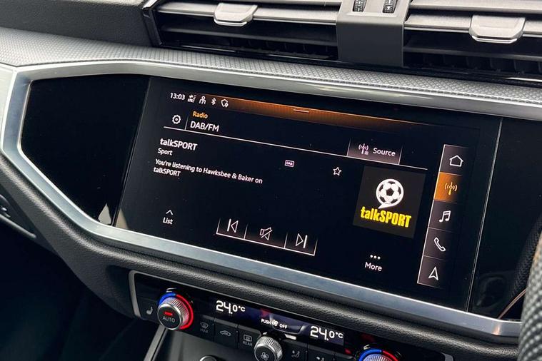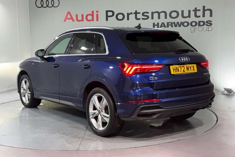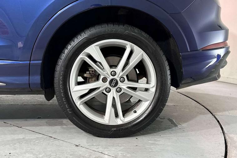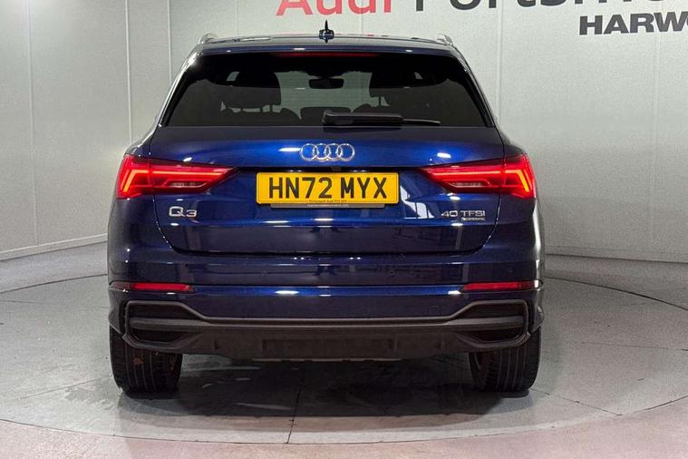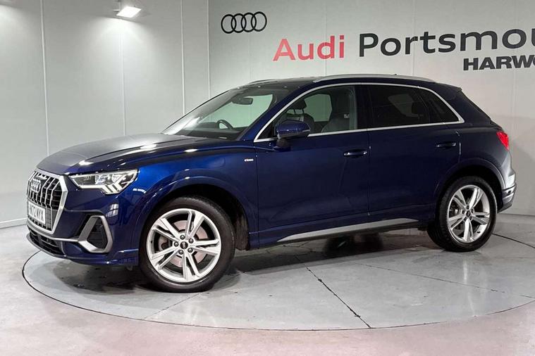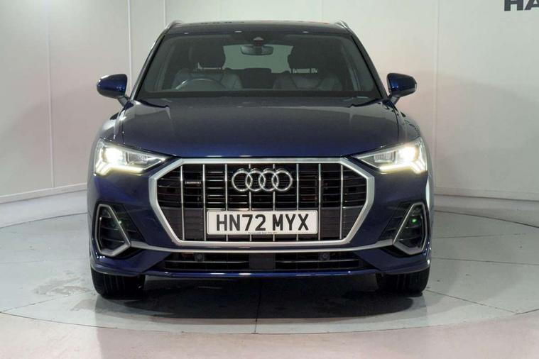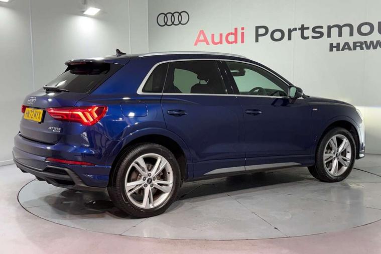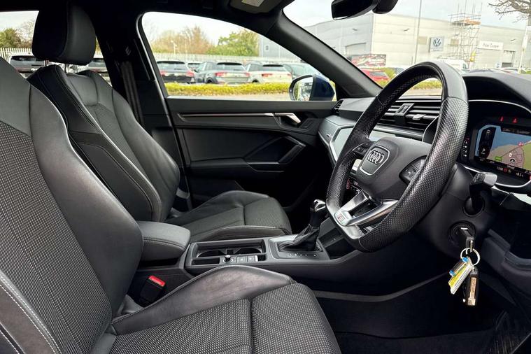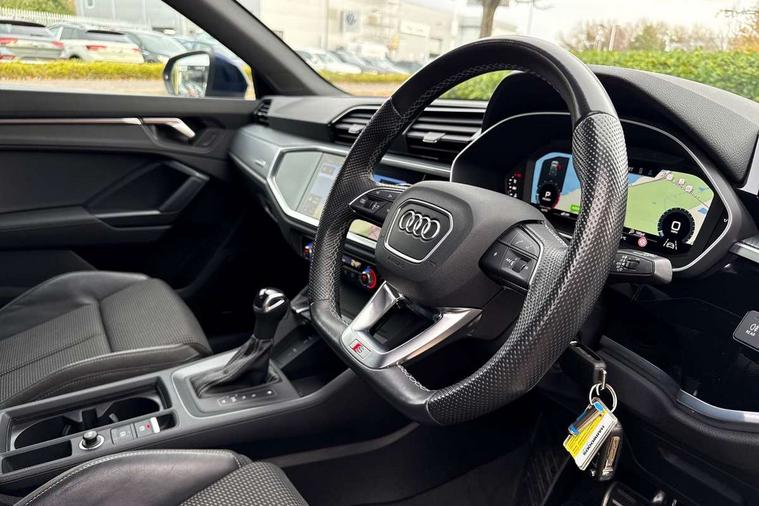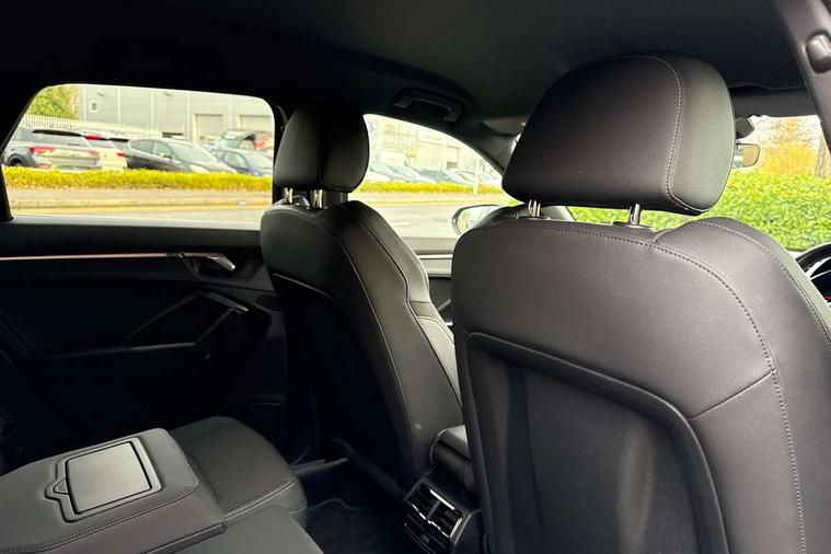 Amazon alexa Integration, Audi drive select, Audi lane departure warning, Audi Virtual Cockpit - 10.25" display, Bluetooth interface, Camera based traffic sign recognition, Legal emergency call, MMI Navigation Plus with high resolution 10.1 inch touchscreen colour display, Power operated tailgate, Progressive steering, Service interval indicator, Smartphone interface includes wireless Apple carplay/Android Auto, Start stop system with recuperation, Voice control system with natural language interaction, Sports suspension, 2 USB-C ports with charge and data functions, 6 passive loudspeakers, DAB digital radio module, Acoustic windscreen, Aluminium roof rails, Aluminium window trim, Auto dimming frameless rear view mirror, Body colour front spoiler blade, Body coloured bumpers, Electrically folding, adjustable and heated door mirrors with integrated LED side indicators and kerb view function for passenger side, Front and rear electric windows, Front fog lights, Front side air inlets in matt platinum grey, Grille vertical bars in aluminium silver/Matt, High gloss black finish B and C pillars, LED Dynamic rear indicators, LED headlights with LED daytime running lights, LED rear lights, LED third brake light, Privacy glass dark tinted rear and rear-side windows (from B-pillar backwards), Rain and light sensors, Rear diffuser grille in grained matt black, Rear diffuser strip in matt titanium black, Rear side wing doors, Rear wiper, S line badges on front wings, S Line front and rear bumpers, Side skirt insert in matt Platinium grey, Titanium black radiator grille, Variable front intermittent wipers, 12V socket in rear centre console, 3 seat bench in 2nd row, 40:20:40 folding with manual adjustment for 60:40 forwards/backwards position and backrest angle, Adjustable rear seat bench/backrest with centre armrest and cupholder, Black cloth headlining, Dual zone electronic climate control, Front and rear black floor mats with contrast stitching in rock grey, Front and rear headrests, Front and rear roof module including reading lights, Front centre armrest, Glove compartment lighting, Height and reach adjustable steering wheel, Illuminated door sill trims with S logo, ISOFIX child seat mounting for front passenger with airbag deactivation and outer rear seat including top tether attachment point for outer rear seats, Luggage compartment light, Manual front seats with height adjustment, Perforated leather gearknob, Single front passenger seat, Stainless steel luggage compartment sill finisher, Stainless steel pedals, Ambient lighting pack - Q3, Non smoking pack - Q3, 3x3 point rear seatbelts, 6 airbags - Driver, front passenger, curtain and side windows, Audi pre-sense front with pedestrain and cyclist recognition, Electrically operated child locks on rear doors, Electromechanical parking brake, Electronic stabilisation control including ABS, ASR and EDL, Front seatbelt reminder, Hill descent control, Hill hold assist, Pre sense basic, Seatbelt monitoring, Tyre pressure warning, Warning triangle and first aid kit, Anti theft alarm, Anti theft wheel bolts, Immobiliser, Remote central locking, Dark matt brushed aluminium inlay, Detail dashboard around MMI touch colour display in glass look, black with surround in aluminium look, Leatherette door armrest,