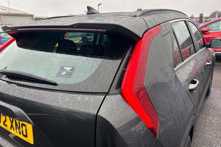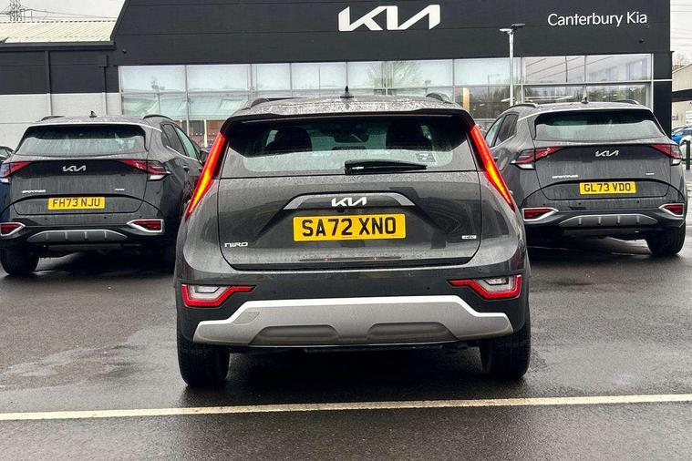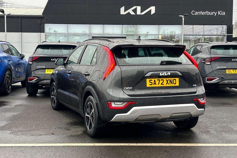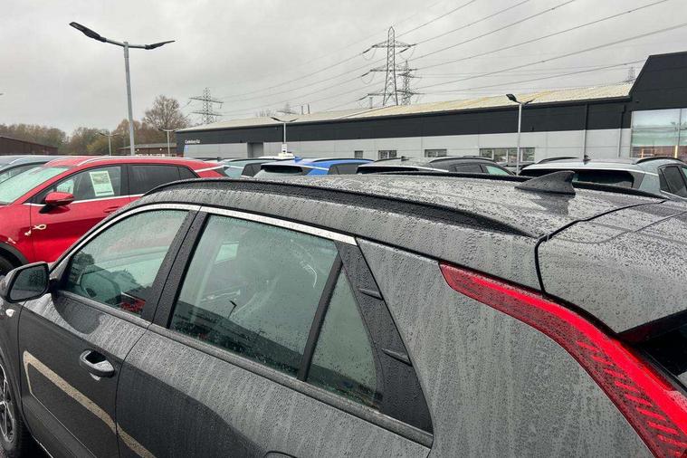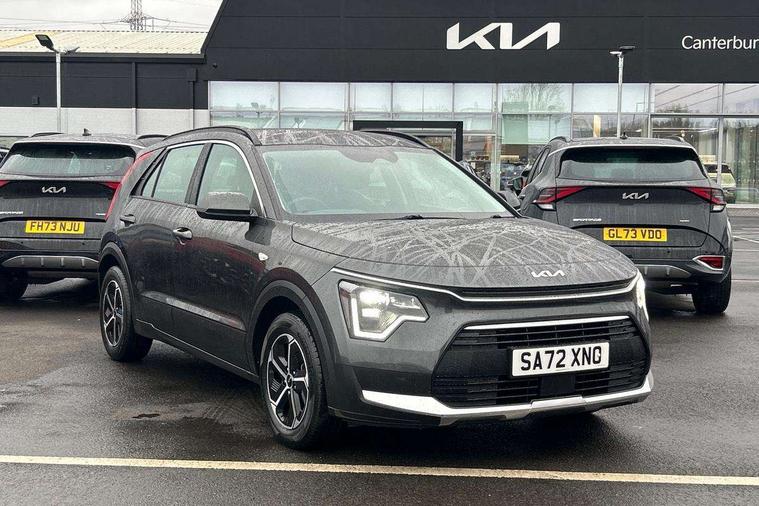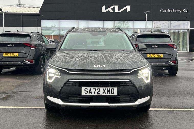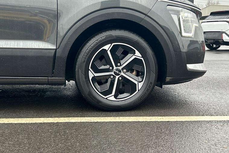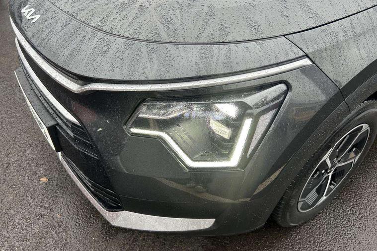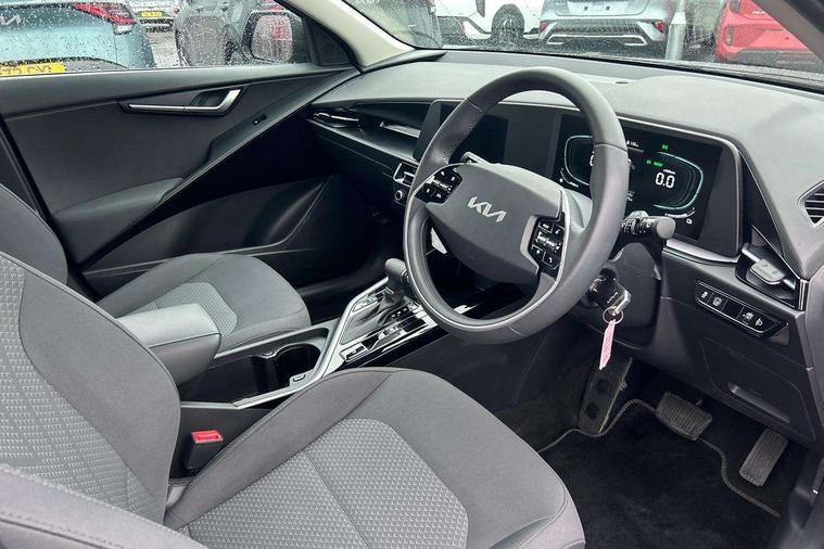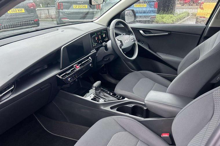 4.2" supervision colour cluster display, 8" touch screen, Adaptive smart cruise control function (SCC) with stop and go, Apple car play/Android Auto with voice control, Drive mode select (Eco, sport), E-call, Emergency stop signalling system, Forward Collision-Avoidance Assist (FCA) 1.5 - City/Pedestrian/Cyclist/Junction turning, Lane Following Assist (LFA), Lane keep assist, Motor driven power steering, Rear parking sensors, Reversing camera with dynamic guide lines, Speed limit assist, Tailgate, Trip computer with distance/fuel consumption/average speed, Sports H-Matic Automatic, 'Shark fin' mobile antenna, 2 type C USB ports on front seats, 2 USB ports in centre console including 1 type C, 6 speakers, Bluetooth with music streaming, DAB Digital radio, Steering wheel mounted controls, Acoustic windshield, All round electric windows with drivers auto up/down function, Auto dimming rear view mirror, Automatic defog system, Automatic headlight control system, Black beltline mouldings, Black embossed cladding, Body colour bumpers, Body colour door mirrors, Body colour exterior door handles, Dual LED headlights (low and high projection), Electric heated door mirrors, Front and rear silver skid plates, Heated rear window with timer, LED daytime running lights, LED rear combination lights, LED third brake light, Manual folding door mirrors, Rain sensor, Rear fog lights, Rear side wing doors, Rear spoiler, Rear wiper, Roof rails, Solar glass rear windows and tailgate, Solar glass windscreen, Welcome and follow-me home light functionality, Windscreen Washer Level Warning, 12V socket in front, 12V socket in luggage compartment, 3 seat bench in 2nd row, 60/40 split/folding 2nd row of seats, All-round height adjustable headrests, Artificial leather centre console storage box, Artificial leather steering wheel, Bulb type overhead console lamp with sunglasses case, Centre console cupholder, Cloth upholstery, Driver seat manual adjustment, Driver/passenger sunvisors with illuminated vanity mirrors, Dual zone automatic air conditioning, Front and rear door storage, H-Matic gear selection, Illuminated glovebox, Interior door lock/unlock function, ISOFIX Child seat top tethers and anchor fixings, Luggage area lamp, Luggage area load cover, Luggage board, Metal paint interior door handles, Passenger seat height adjuster, Rear armrest, Seatback pocket - driver, Single front passenger seat, Tilt/telescopic adjustable steering wheel, Towing pack - Niro, 3 point seatbelts on all seats, ABS, Automatic unlocking of doors in case of impact, Centre side front airbags, Curtain and side airbags, Drivers knee airbag, Dual shell horn, Electric parking brake with auto hold function, Electronic stability control, Front passenger airbag deactivation, Height adjustable front seatbelts, Hill start assist control (HAC), Manual rear child locks, Rear seat alert system, Traction control, Tyre pressure monitoring system, Alarm system and engine immobiliser, Deadlocks, Locking wheel nuts, Remote central door locking with fold away key, Visible vehicle identification number, Warranty - 7 Years/ 100, 000 miles, Graphite paint centre fascia, 16" alloy wheels, Tyre mobility kit,