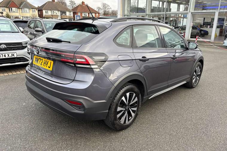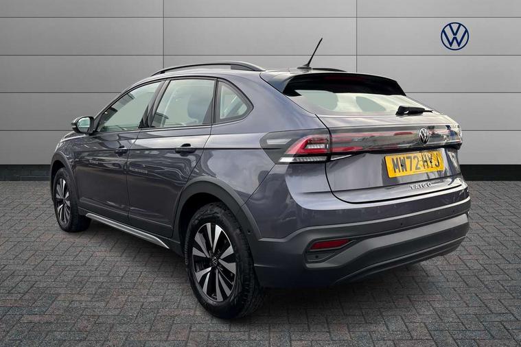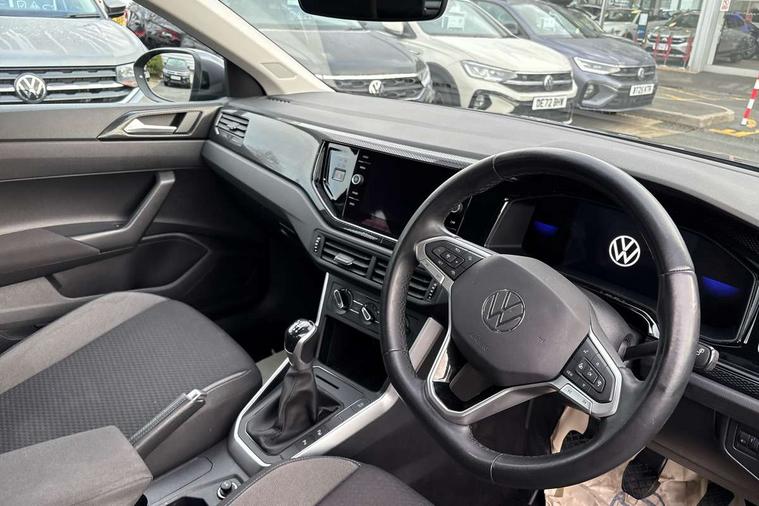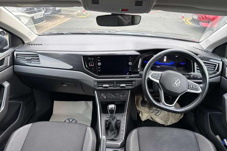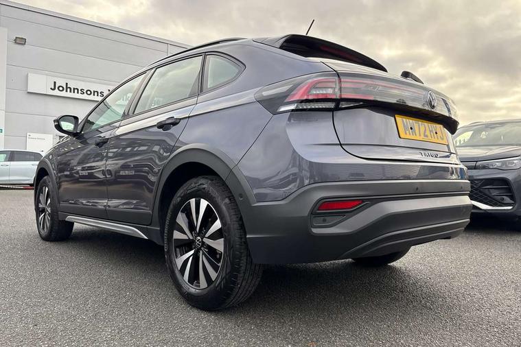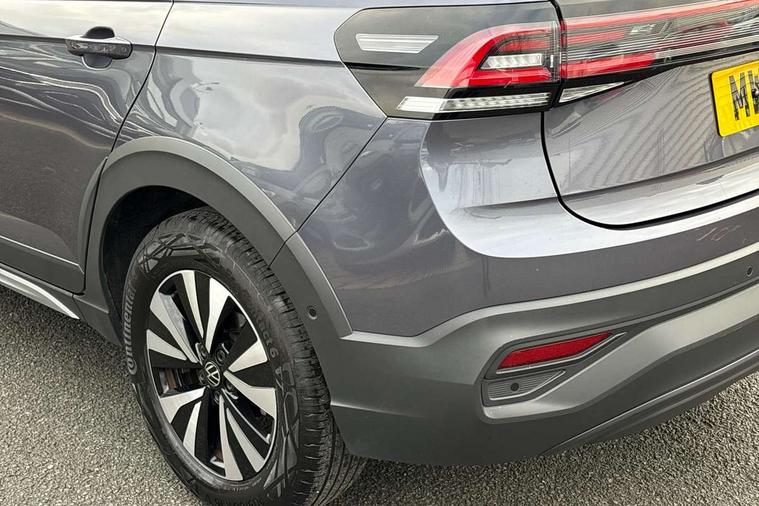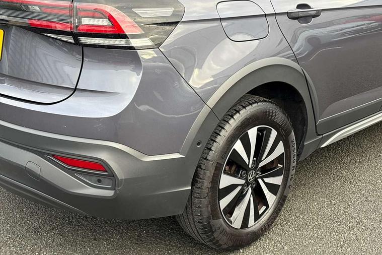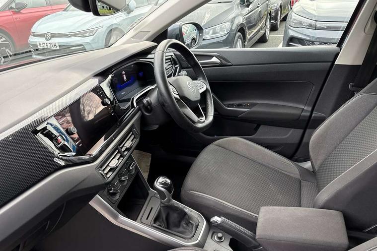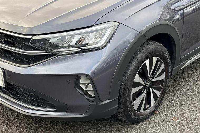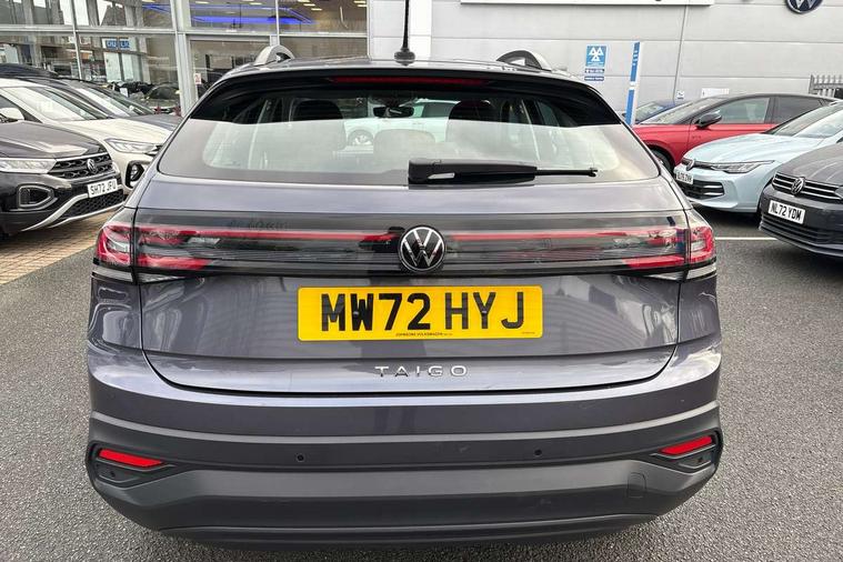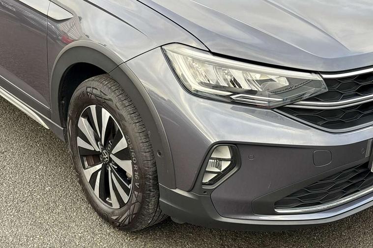 Driver alert system, e-Call (emergency call), Power Steering, Travel assist including emergency assist, Washer fluid level indicator, Wireless Charging including Bluetooth, Start-stop system with battery regeneration (recuperation - energy recovery during braking), WeConnect plus, Ambient lighting with logo projection, Aspherical driver's exterior mirror, Auto headlights, Body coloured bumpers, Body coloured exterior mirror housings and door handles, Electric windows, External USB type C socket and charging sockets, Front fog lamps with cornering function, Headlight range control, Heat insulating glass windscreen, LED headlamps, LED rear combination lamp, LED third brake light, Left convex exterior mirror, Power folding adjustable/heated exterior mirrors and front passenger exterior mirror lowering function, Rear fog light on one side, reversing light on both sides, Rear side wing doors, Rear wash/wipe with intermittent wipe setting, 'Slash/ Austin' Cloth upholstery, 12V socket in centre console, 2 front reading lights, 3 rear head restraints, 3 seat bench in 2nd row, Black carpets, Child seat anchor for child seat system i-Size, 2x top tether and child seat anchor in front on front passenger side, Door and side trim panels in titan black, Driver and front passenger seat height adjustment, Front centre armrest, Handbrake lever handle in leather, Height and reach adjustable steering wheel, Leather trimmed gear knob, Leather wrapped multifunction steering wheel, Luggage compartment floor, Luggage compartment light, Lumbar support for driver's and front passengers seat, Seat covers in titanium black, Single front passenger seat, Split folding backrest with centre armrest and unsplit rear seat bench, Storage compartment under front seats, Sun visors with illuminated vanity mirrors, Chrome Package - Taigo, Drivers assistance pack - Taigo, Light and Sight pack including High beam assist - Taigo, 2 x 3-point seatbelts/outer rear seats with ECE label, 3-point seat belts in front with pretensioner and height adjustment, 3-point seatbelt for centre rear seat, Driver and front passenger airbags with front passenger airbag de-activation, front side and curtain airbags, Driver and front passenger safety-optimised head restraints, Electronic stability control, Extended and predictive pedestrian/ cyclist protection, Front and rear disc brakes, Front curtain and side airbags with center airbag, Hill start assist, Manual rear child locks, Single tone horn, Tyre pressure loss indicator, Anti-theft alarm system with interior monitoring, backup horn, and towing protection, Anti-theft wheel bolts, Lava stone black gloss/matt decorative inserts in dash and front door panels, Low rolling resistance tyres,