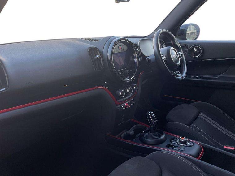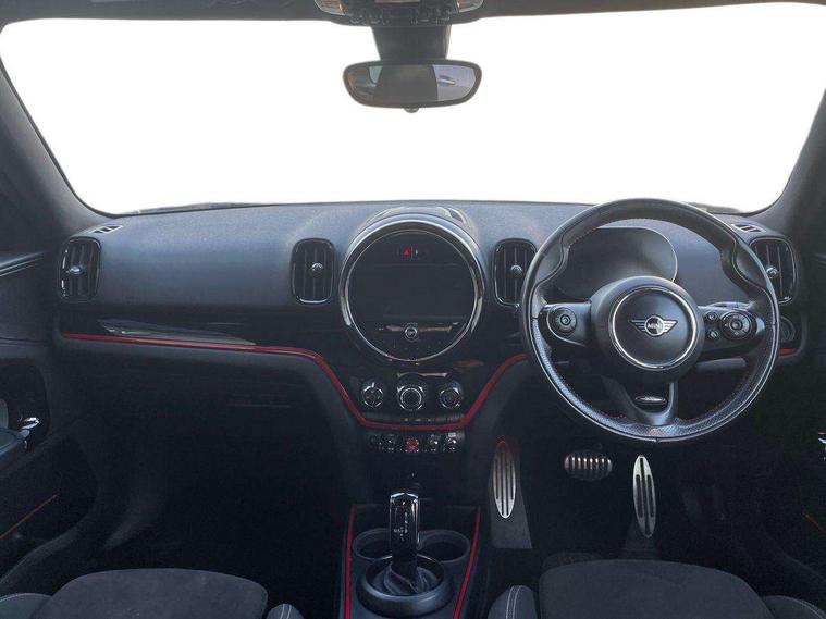 Active Guard incl speed limiting and lane departure functions with auto steering, and front collision warning with brake intervention, Automatic start/stop function with brake energy recuperation, Digital cockpit, Electro-mechanical speed dependant steering assistance, Instrument cluster, MINI Driving Modes - centre toggle switch to control driving setting (sport, mid and green), Mini E-call, MINI TeleServices, On board computer, Rear parking distance control, Double Vanos system, Fully variable valve control, High precision injection, Performance Control, Steptronic transmission with double clutch, FM tuner and DAB digital radio, Body colour fuel filler cap, Day time driving lights, Door sill strips, Dynamic brake lights, Electric windows, Heated rear window, Heated windscreen washer jets, John Cooper Works - aerodynamic kit (front and rear apron, spoiler), front and rear sport bumpers and part-painted side sills with door sill finishers, John Cooper Works Logo, John Cooper Works rear spoiler, LED fog lights, LED Headlights, Left exhaust tailpipe with chrome finisher, Model logo, Model logo on Tailgate, Radiator grille, Rain sensor with auto headlights, Rear fog lights, Rear window wiper, Side scuttle panel with integrated indicator, Split rear doors, Sun/heat protection glass, White indicator lenses, 12V Accessory socket in centre console, 360L luggage compartment capacity, 4 lashing eyes in luggage compartment, 40:20:40 split folding rear seats, Anthracite headlining with grab handles and clothes hooks, Chrome interior highlights, Colour line - Carbon black, Cupholders, English handbook, Front headrests, Glove compartment, Height and length steering column adjustment, Interior lighting with 12 basic colours selectable via toggle switch in roof, Isofix rear child seat preparation, John Cooper Works perforated leather steering wheel with contrast stitching in chilli red and John Cooper Works logo, Leather gearshift lever and handbrake gaiters, LED reading lights, vanity mirror lights, front foot well light and spotlight on front seats, Manual air conditioning, Multifunction steering wheel, Passenger seat height adjuster, Rear headrests, Storage compartments in doors, Sunvisors with vanity mirrors, Excitement pack - Countryman, Navigation pack - Countryman, 2 tone horn, 3 point seatbelts on all seats, 6 Airbags - front, side, head and seat belt tensioners, Anti-lock braking system (ABS), DSC - Dynamic Stability Control, Electronic handbrake, Front and rear disc brakes, Hill start assist, Tyre pressure monitoring system, Alarm system with tilt sensor, monitoring doors, bonnet interior and tailgate, Auto drive away locking, Deadlocking function, Electronic vehicle immobiliser, Locking wheel bolts, Start/stop toggle with keyless go, Tool kit,