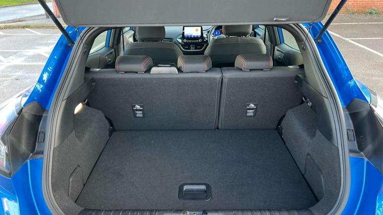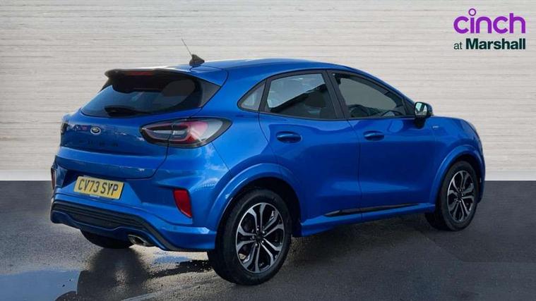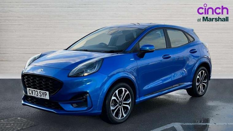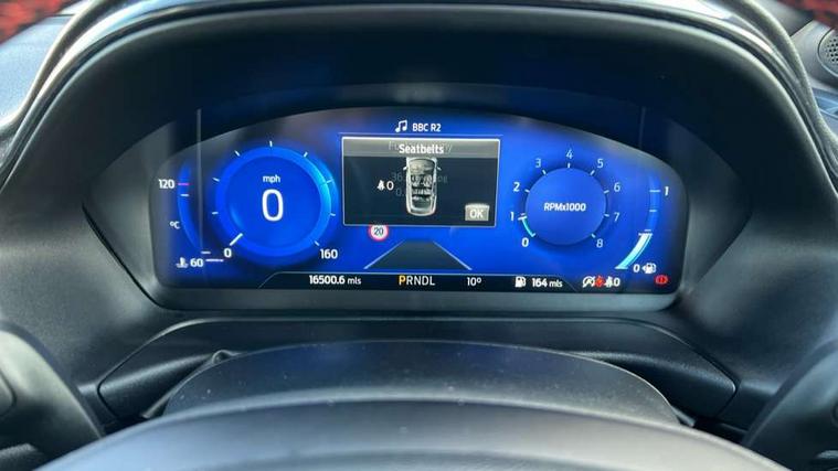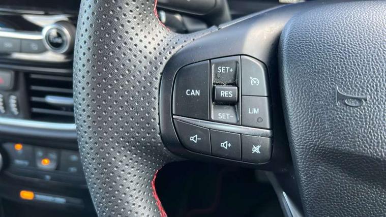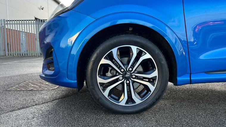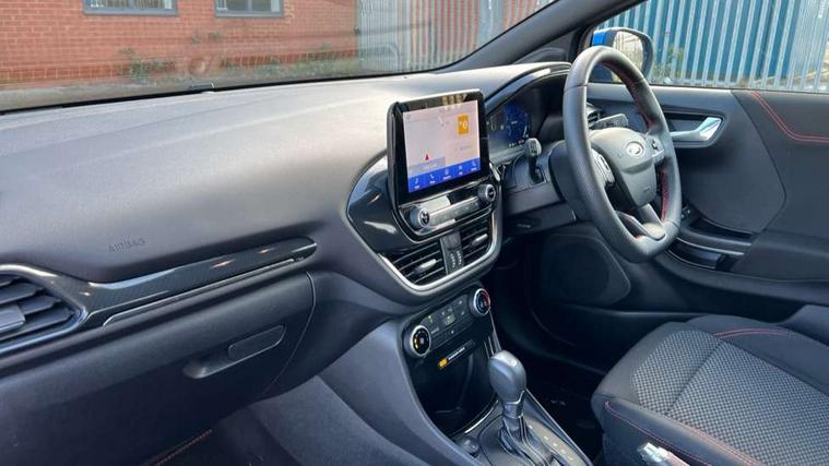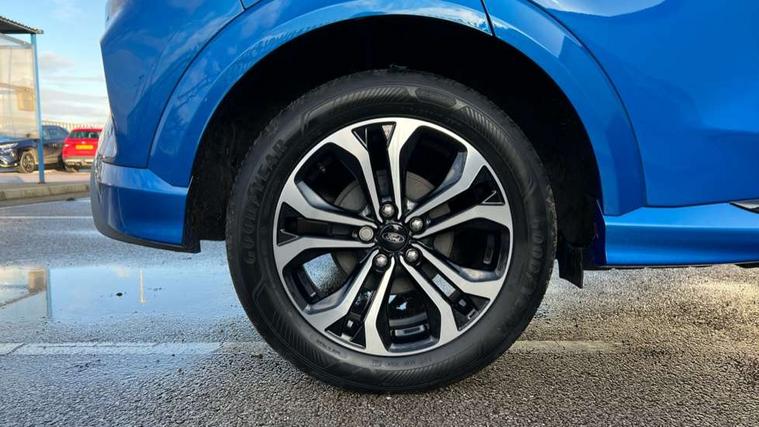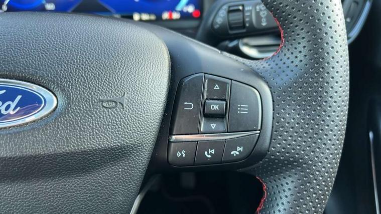 Driver impairment monitor, Emergency call service, Ford easy fuel, Full digital 12.3" instrument cluster, Lane keeping aid with lane departure warning, Power assist steering, Power start button, Rear parking sensor, Selectable drive modes(Normal, Eco, Sport, Slippery and Trail), Speed sign recognition, Sport suspension, Automatic headlights with auto high beam, Automatic rain sensing wipers, LED rear lamps, Power foldable heated door mirrors with puddle lamps, Projector headlamps with LED day time running lights and front fog lamps, Quickclear heated windscreen, Rear side wing doors, Rear wiper, ST-Line body styling kit with unique grille and large body colour rear spoiler, Third brake light, 3 seat bench in 2nd row, Centre console with armrest and stowage, Ford megabox extended bootspace, Front and rear head restraints, Front floor mats, Manual 2 way passenger seat adjustment, Manual 4 way driver seat adjust with lumbar adjustment, Single front passenger seat, ST- Line cloth trim with red stitching, ST-Line flat bottomed sensico leather steering wheel with leather handbrake and aluminium gear knob, Ford SYNC 3 navigation pack - Puma, 3 rear seatbelts, Child safety lock, Electronic stability control (ESC) and hill start assist, Pedestrian/cyclist detection & post-collision braking, Pre collision assist system, Tyre pressure monitoring system (TPMS), Thatcham alarm,