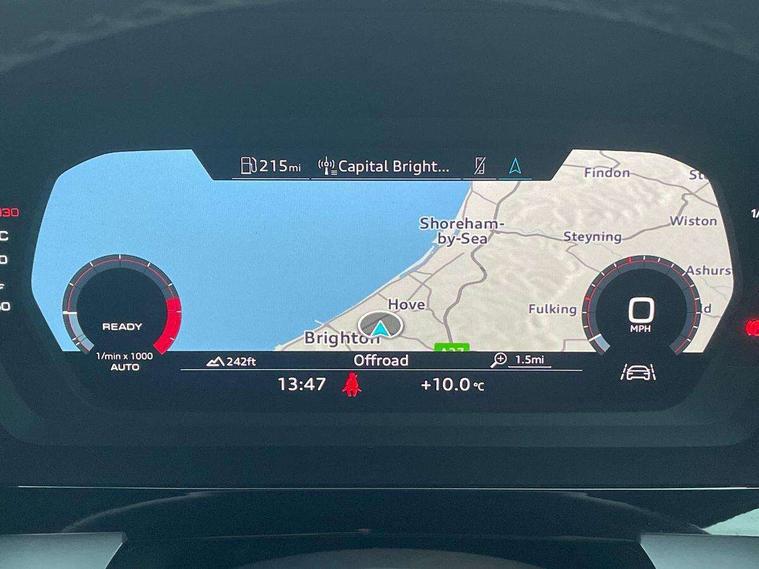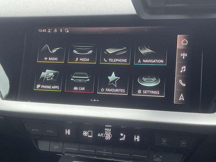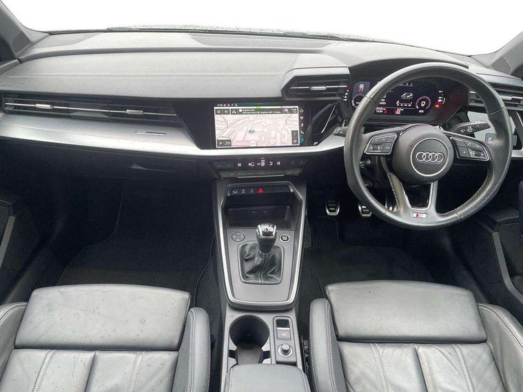Audi drive select (Auto, Comfort, Dynamic and Individual), Audi smartphone interface, Audi Virtual Cockpit - 10.25" digital and colour instrument cluster, Automatic start/stop system with recuperation, Bluetooth interface, Collision avoidance assistant, Cruise control, e-Call (emergency call), Electromechanical power speed sensitive steering, Lane departure warning system, MMI Navigation Plus with high resolution 10.1" colour touch screen display, Rear parking sensors, Service indicator, Trip computer, Voice control system with natural language interaction, 2xUSB-C connection with data and charging functions, 6 passive loudspeakers, DAB Digital radio, 3rd brake light, Acoustic glass windscreen, Aluminium window trim, Auto dimming frameless rear view mirror, Electrically adjustable/heated/folding/auto dimming door mirrors with integrated LED indications + kerb view function for passenger side, Front electric windows, Illuminated aluminium inserts front door sills with S logo, LED daytime running lights, LED headlights with LED rear lights and dynamic rear indicators, Light and rain sensors, Privacy glass - dark tinted rear window, rear door and side windows, Rear electric windows, Rear side air outlets in grained matt black, Rear side wing doors, Rear wiper, S line bumpers, S roof spoiler, 12V socket and storage compartment in front centre console, 3 seat bench in 2nd row, 40/20/40 split folding rear seat bench with cupholder, Black cloth headlining, Dual zone electronic climate control, Front and rear centre armrest in leather, Front and rear headrests, Front/rear floor mats, Height and reach adjustable steering wheel, Illuminated vanity mirror, Interior lighting - glove compartment light and right hand side, Luggage compartment floor covering, Manual boot compartment lid, Manually adjustable front seats, Seat side bolsters, Single front passenger seat, Stainless steel pedals and front footrest in black, Twin leather upholstery with front sports seats S embossed logo, Aluminium interior elements pack - A3 Sportback, LED interior lighting pack - A3 Sportback, S line styling pack - A3 Sportback, 3x3 point rear seat belts, Audi pre sense front, Driver and front passenger airbag with passenger airbag deactivation, Electronic Stabilisation Control (ESC) including ABS, ASR and EDL, First aid kit with warning triangle and 2 safety vests, Front side airbags with head airbags and interaction airbag, Pre-sense front with pedestrian and cyclist detection, Seatbelt monitoring, Tyre pressure loss indicator, Anti theft alarm, Anti-theft wheel bolts, Electronically operated child lock, Immobiliser, Remote control central locking, Accent surfaces in the dashboard and centre console in platinum grey silk effect paint finish, Dark spectrum aluminium inlays,