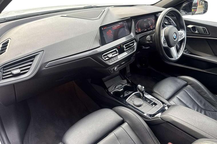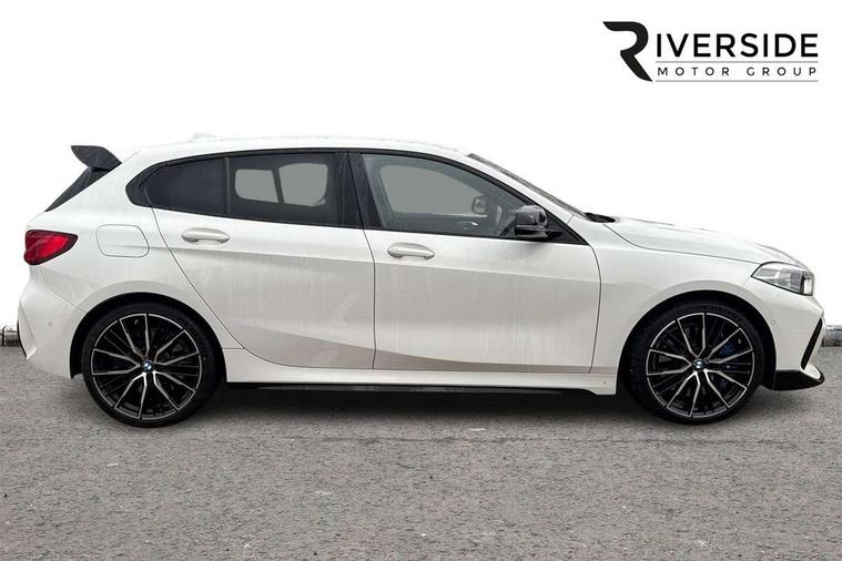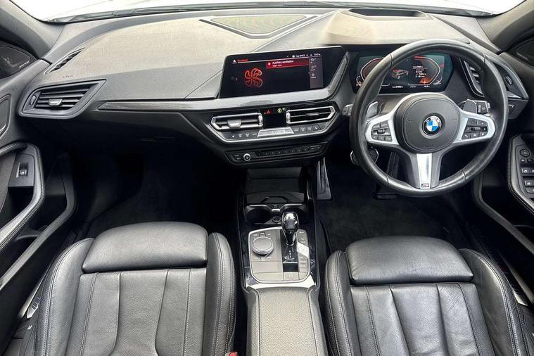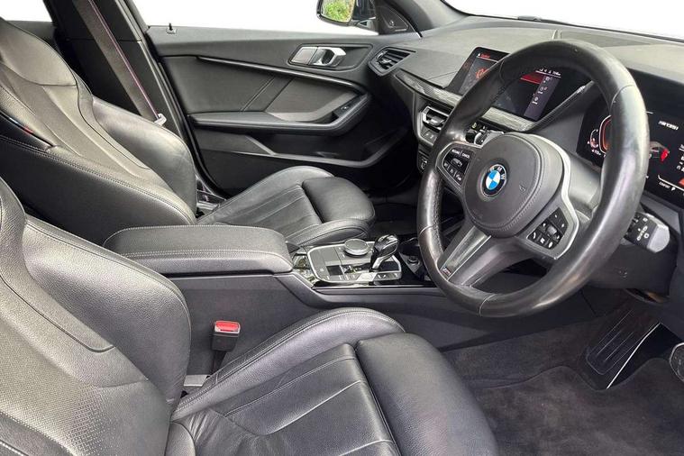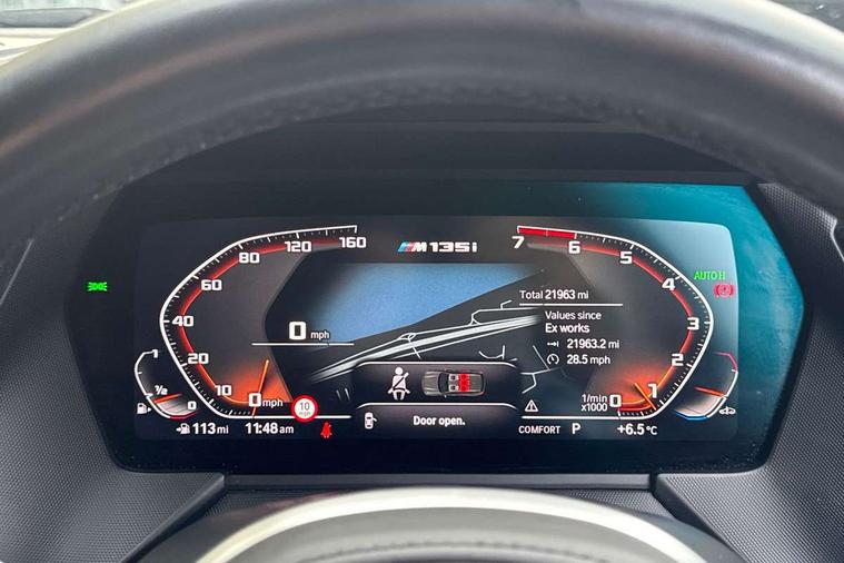 Active guard plus, Attentiveness assist, BMW Live Cockpit Professional sat nav system including 10.25" high resolution display and Intelligent Voice Assistant, BMW Online services, BMW Teleservices, Check Control warning system for monitoring of lights and door/luggage compartment open warning, Eco pro mode, Gearshift time display in manual mode, Integrated owners handbook, M Sports steering, Oil sensor for level and grade, On board computer, Optimum shift indicator, Personal Profile, Pull away assistant, Speed limiter, Sporty fast gear shifting in sport mode, Aluminium lightweight construction, Anti roll bar front and rear, Balancer shaft, Double VANOS, Drive Performance Control, Eight speed sport automatic transmission with electronic selector lever, Electronic differential lock, Engine cover with M performance designation, High precision injection, Larger fuel tank capacity (50 litres), Launch control, Petrol Particulate Filter, VALVETRONIC engine management, Bluetooth audio streaming, DAB Digital radio, Auto dimming rear view mirror, Automatic headlight beam throw control, Body colour door handles, Cerium grey exterior mirror caps, Direction indicator side lights in exterior mirrors, Electric folding and anti dazzle exterior mirrors, Fading support, Follow me home headlights, Front and rear electric windows with open and close fingertip control, anti trap facility and comfort closing, Front door sill finishers with M135i designation, Green tinted heat protection glazing, Heated, electrically adjustable exterior mirror aspheric on driver side, convex on passenger side, High gloss shadow line exterior trim, High gloss shadowline window frame, Recess cover mirror frames and B/C pillar embelisher trim, High level third brake light, Kidney grille frame in Cerium Grey with Mesh design, LED daytime running lights, LED eyebrow turn indicators, Lightweight engineering, M logo designation side in cerium grey, M performance exhaust system, M rear spoiler, Matt black air guide grilles, Model designation on right side of tailgate, Nearside reverse light in rear light cluster, Rain sensor including auto headlights activation, Rear fog lights, Rear window wiper, Round exhaust system with twin cerium grey tailpipes in left and right split, Shark fin antenna, Visible VIN plate, Welcome lighting, Windscreen wipers with integrated washing jets, 12V power socket in centre console, 2 cupholders in front centre console, 3 rear seat head restraints, 3 spoke M sports design leather steering wheel finished in nappa leather with specific M badge, Anthracite headlining, Anthracite Velour floor mats, Child seat ISOFIX attachment for two outer rear seats and front passenger seat with anchorage points, Conditioned based service, Driver and front passenger seat heating, Driver side folding compartment in instrument panel, Folding rear clothes hook, Folding rear seats, Four grab handles integrated in roof lining, Front and rear door pockets, Front and rear side armrest integrated into door trim, Front armrest foldable with integrated storage compartment, Front M seats, Glove compartment, Height adjustable front head restraints, Manual adjust steering wheel, Multi-function controls for steering wheel, Rear seat backrest with manual 60:40 split folding with 3 top tether clips integrated on rear of seat panels, Storage compartment in centre console, Sun visors with vanity mirrors and insert tab, Two zone automatic air conditioning, Connected pack professional - 1 Series, Extended Lighting pack - 1 Series M135i, Extended storage pack - 1 Series, Interior lights pack - 1 Series, Luggage compartment pack - 1 Series, M Sport exterior styling aerodynamics pack - 1 Series 135i, 2 tone horn, 3 point seatbelts on all seats, front pyrotechnic belt tensioners, stopper and belt force limiters, rear coded belt buckles, Airbags - Front driver and passenger, front and rear head, front side, curtain head protection, Anti lock braking system (ABS) with brake assist, BMW emergency call, Brake drying, Braking readiness, Crash sensor activating central locking release, hazard warning lights, fuel cut off, interior lighting + activation of safety battery terminal clamp, Driver and front passenger seat belt security check, Dynamic stability control + (DSC+), Dynamic Traction Control - DTC, Electrically operated hand brake, Front and rear disc brakes, Front passenger manual airbag deactivation, M Sport braking system, M sport seatbelt, Rear child proof door locks, Seatbelt warning, Side impact protection, Torsen mechanical limited slip differential, Tyre pressure monitoring system, Warning triangle and first aid kit, Automatic drive away locking facility, Central locking switch for all doors, fuel filler cap and luggage compartment, Deadlocking function system to all doors, Locking wheel bolts, Remote control with integrated key with High-gloss Black inlay and M designation and 1 button for open/ close lock, window, open luggage compartment, Start/stop button with comfort go keyless engine start and auto start stop deactivation button, Thatcham Cat.1 alarm and immobiliser, Contrast stitching on instrument panel, 18" Burnished M double spoke Bi-colour alloy wheels finished in Cerium grey matt - style 556M, BMW mobility system, Reduced rolling resistance tyres,