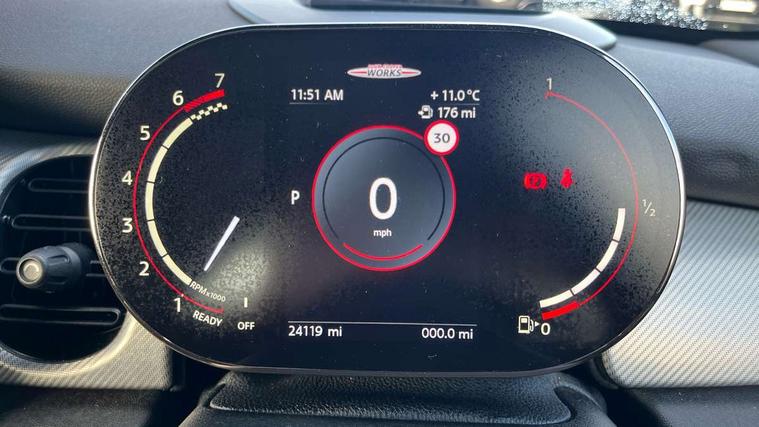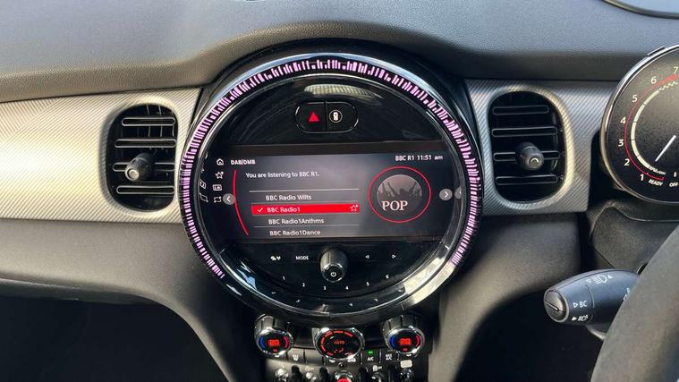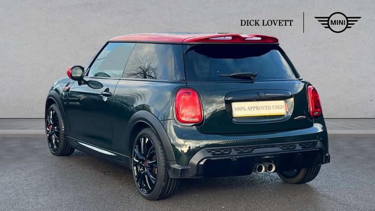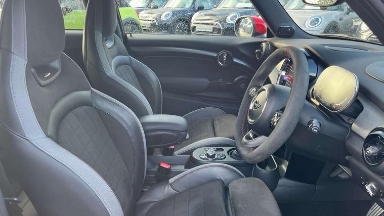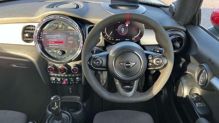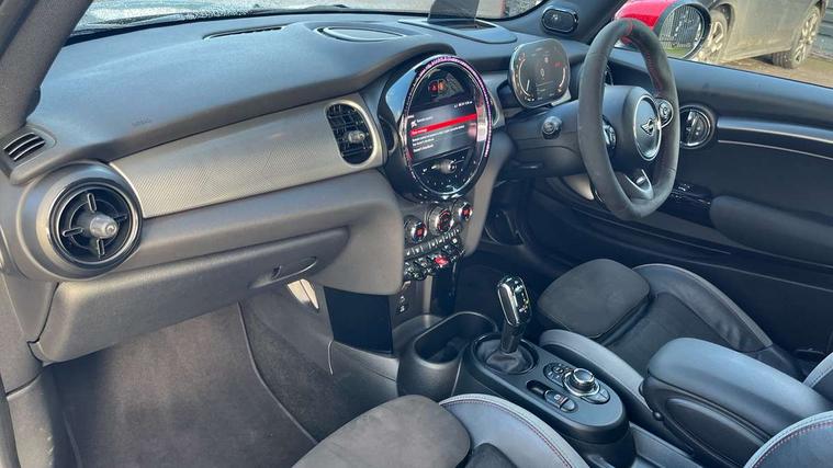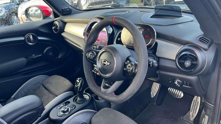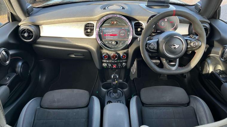 Apple CarPlay, Automatic start/stop function with brake energy recuperation, Compatible mobile phone bluetooth with audio streaming, Cruise control with brake assist, Electro-mechanical speed dependant steering assistance, Flexible car sharing preparation, Instrument cluster, MINI Driving Modes - centre toggle switch to control driving setting (sport, mid and green), Mini E-call, MINI TeleServices, On board computer, Rear park distance control, Service interval indicator, Double Vanos system, Eight speed steptronic sport transmission, with gearshift paddles, Fully variable valve control, High precision injection, Performance Control, 8.8" touchscreen with LED ring, FM tuner and DAB digital radio, 3rd brake light, Automatic headlight activation switch, Bonnet scoop, Dynamic brake lights, Electric front windows, Heated rear window, Heated windscreen washer jets, JCW Aerodynamic kit - Front and rear bumpers with sporty JCW styling and part-painted side sills with MINI John Cooper Works door sill finishers, John Cooper Works logo above an individual grille strut in Chilli Red, John Cooper Works rear spoiler, LED headlight with closed ring and daytime driving lights, Radiator grille piano black border with honeycomb structure in black matt, Rain sensor window wipers, Rear fog lights, Rear LED lights with union jack design, Rear window wiper, Side scuttle panel with integrated indicator, Side scuttle with MINI John Cooper Works logo in black high-gloss with red border, Sun/heat protection glass, Two central exhaust tailpipes with chrome finisher, White indicator lenses, 12V Accessory socket in centre console, 2 seat bench in 2nd row, 4 lashing eyes in luggage compartment, 60/40 split folding rear seat, Anthracite headliner including grab handles and clothes hooks, Carbon black colour line - Knee roll and door armrest, Chrome interior highlights, Cupholders, Front and rear isofix with front passenger airbag deactivation, Front floor mats in velour, Glove compartment, Height and length steering column adjustment, Interior lighting with 12 different colours across the dashboard, underneath door bezel with illuminated laser-engraved design on central display, JCW Sport seats with integrated headrests, adjustable thigh support and John Cooper Works logo, Leatherette gearshift lever and handbrake gaiters, LED reading lights, vanity mirror lights, front foot well light and spotlight on front seats, Manual air conditioning, Mechanical seat adjustment - forward/back & backrest for front seats and driver seat height adjust, Multifunction steering wheel, Passenger seat height adjuster, Rubberised stainless steel pedals, Single front passenger seat, Storage compartments in doors, Storage pocket on back of front seats, Sunvisors with vanity mirrors, Walknappa leather steering wheel with grey seam and John Cooper Works badge on Piano Black lower steering wheel spoke, Navigation pack without Apple Carplay - Mini Hatchback, Piano black exterior pack - JCW, 3 point seatbelts on all four seats, 4-piston fixed-calliper brakes front, 6 Airbags - front, side, head and seat belt tensioners, Anti-lock braking system (ABS), DSC - Dynamic Stability Control, Front and rear disc brakes, Red brake callipers with John Cooper Works logo, Single tone fanfare horn, Tyre pressure monitoring system, Alarm system with tilt sensor, monitoring doors, bonnet interior and tailgate, Electronic vehicle immobiliser, Start/stop toggle with keyless go, Tool kit,