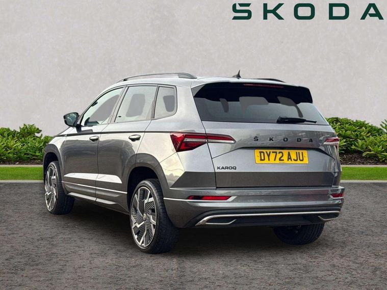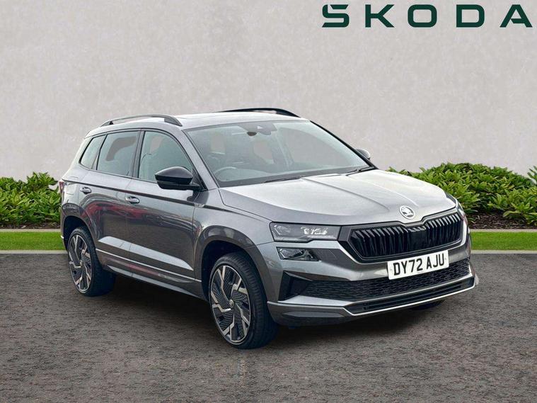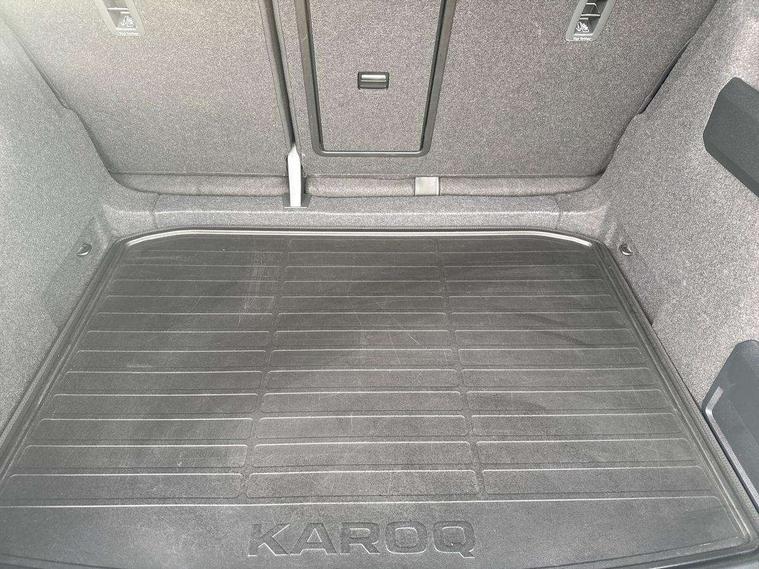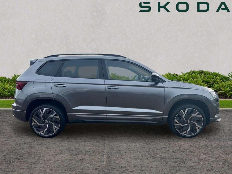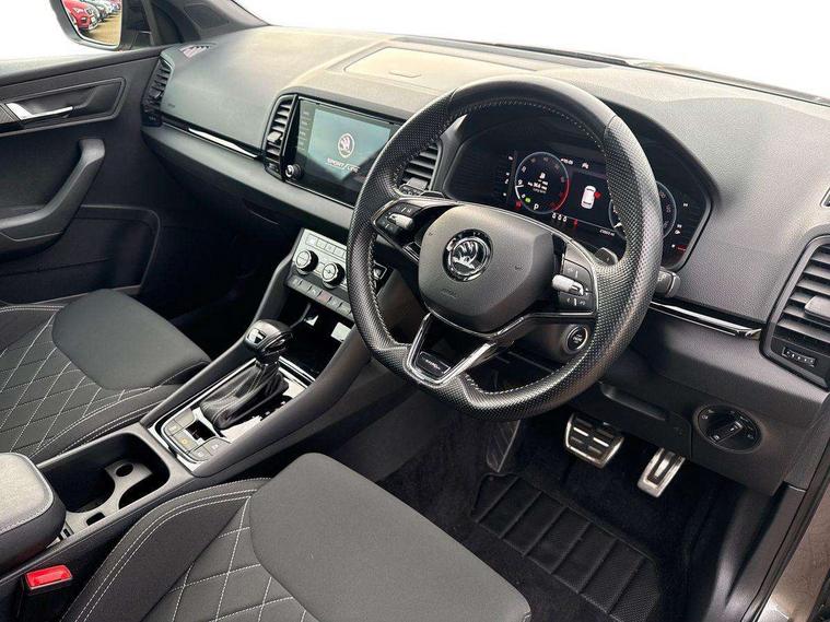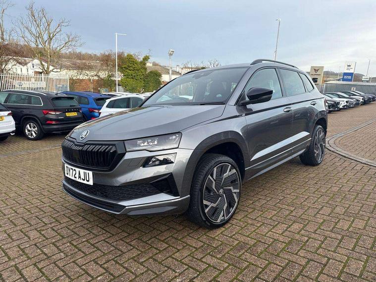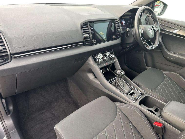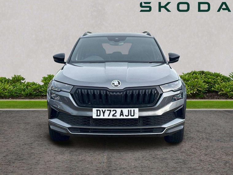 8" Digital display, Care connect, Driver fatigue sensor, Emergency services call system, Outside temperature gauge, Service interval indicator, SmartLink wireless for Apple and wired for Android, Start/stop system with regenerative braking, USB C Port x 2 in front centre console, Virtual pedal with electrically operated boot door, 8 Speakers, DAB radio with Bluetooth, USB connection, Acoustic glass, Aero front windscreen wipers with intermittent function, Auto dimming rear view mirror with light and rain sensors, Black door mirrors, Black electric window control buttons, Black radiator grille, Black roof rails, Body colour door handles, Dynamic headlight range control with cornering light function, Electric front and rear windows with child proof lock, Front door steps with SportLine logo, Heated rear windscreen, LED daytime running lights, LED rear lights with high functionality welcome effect and dynamic indicators, Light assistant (coming/leaving home/tunnel light), Panoramic sliding sunroof, Plastic scuff plates, Privacy glass, Protective door side sills in body colour, Rear diffuser, Rear side wing doors, Rear spoiler, Rear window wiper with washer system and intermittent control, Safety reflectors on front doors, Skoda lettering on tailgate in black, Sportline badge on front fender, Sportline decorative inserts with badging, Sports front and rear bumpers, 1.5 litre bottle holders in driver and front passenger door panels, 12V socket in boot, 12v socket in front centre armrest with storage compartment and rear air vents, 2 Folding hooks and nets in boot, 3 rear height adjustable headrests, 3 seat bench in 2nd row, 3 spoke leather sports multifunction steering wheel and silver stitching with gear shift paddles, 4 foldable roof handles with rear coat hooks, Black floor carpet, Black roof headlining, Chrome inner door handles, Double sided boot floor, Foldable hooks in the boot, Front head restraints, Height adjustable front three point seats belts with tensioners, Height/reach adjust steering wheel, Ice scraper, Illuminated glovebox, Illuminated luggage compartment, Isofix child seat preparation outer rear, Manual lumbar support for front seats, Pen holder, Pollen filter, Rear boot cover, Rear reading lights, Rear seats fixed folding and divided 60:40, Rubbish bin door, Safety vest holder, Single front passenger seat, Storage box in upper central dashboard closed, Sunvisors with illuminated vanity mirrors, Textile floor mats, Ticket holder, Titan black interior ceiling, Welcome animation with sportline logo, Light Pack - Karoq, Parking pack - Karoq, Automatic door unlocking in case of crash, Automatic fuel cut off in case of crash, Child locks on rear doors, Driver airbag, Electronic parking brake with auto hold function, Emergency rear braking signal, ESC including ABS, MSR, ASR, EDS, HBA, DSR, RBS, MKB and traction control, Front side airbags, Hill hold control, Knee airbags, Passenger airbag with switch-off function, Pedestrian monitor, Seatbelt reminder signalisation and pretensioner for all seats, Three point seatbelts rear, Two tone horn, Tyre pressure display, Tyre pressure monitor, Alarm with interior monitoring, back up horn and tilt sensor with safe function, Electronic engine immobiliser, Keyless entry and start/stop, Remote central locking with 2 remote folding keys, Black air vent surround, Black centre console, Satin black dashboard, Satin black door trim, 19" Sagitarius anthracite alloy wheels with matt black aero inserts, Anti-theft wheel bolts protection, Matt black aero hub caps, Storage on wheel cover, Tool kit,