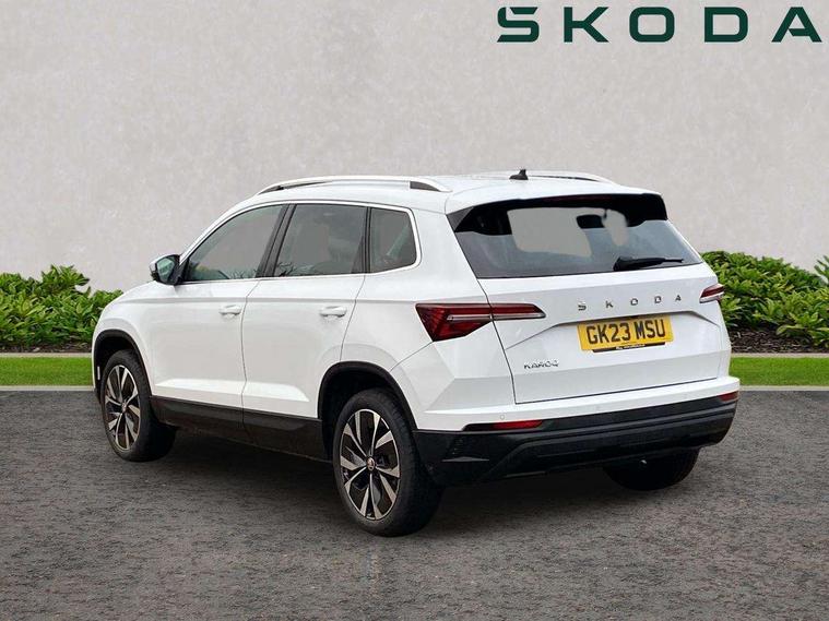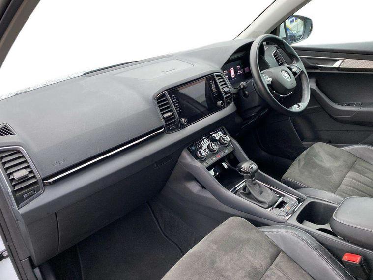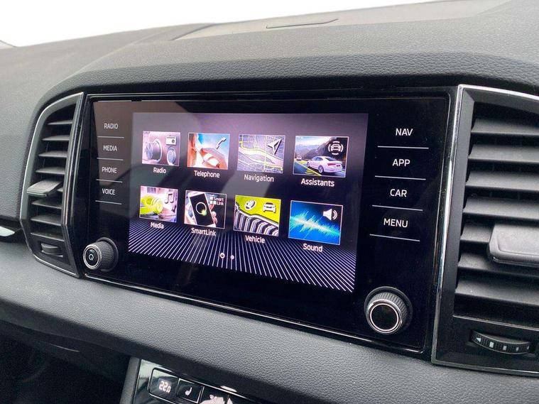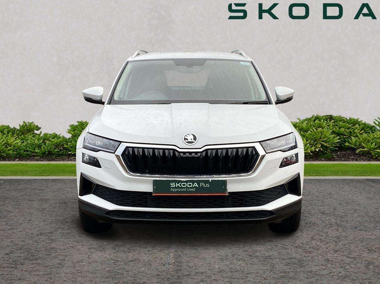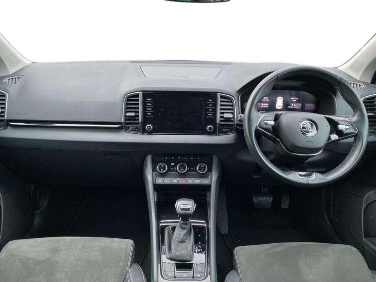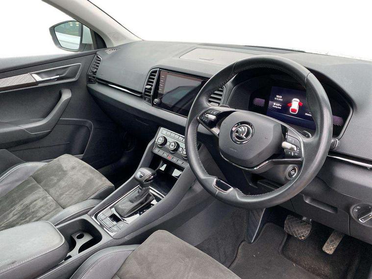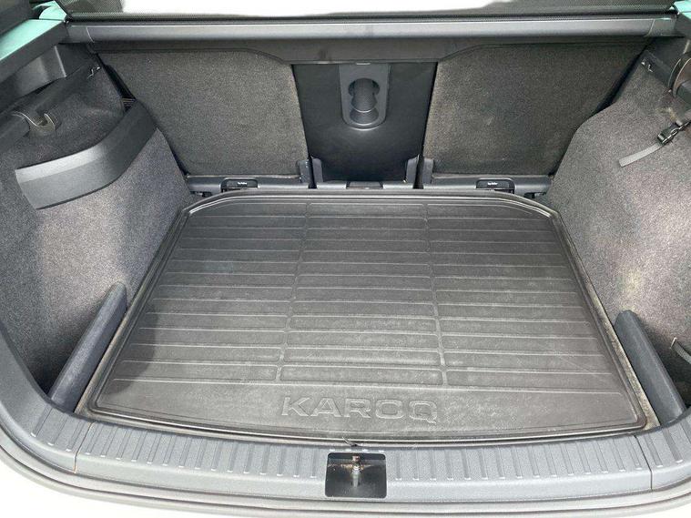 8" Digital display, Care connect, Driver fatigue sensor, Emergency services call system, Outside temperature gauge, Service interval indicator, SmartLink wireless for Apple and wired for Android, Start/stop system with regenerative braking, USB C Port x 2 in front centre console, 8 Speakers, DAB radio with Bluetooth, USB connection, Acoustic glass, Aero front windscreen wipers with intermittent function, Auto dimming rear view mirror with light and rain sensors, Black electric window control buttons, Body colour door mirrors and handles, Dynamic headlight range control with cornering light function, Electric front and rear windows with child proof lock, Heated rear windscreen, LED daytime running lights, LED rear lights with high functionality welcome effect and dynamic indicators, Light assistant (coming/leaving home/tunnel light), Plastic scuff plates, Privacy glass, Rear side wing doors, Rear spoiler, Rear window wiper with washer system and intermittent control, Safety reflectors on front doors, 1.5 litre bottle holders in driver and front passenger door panels, 12V socket in boot, 12v socket in front centre armrest with storage compartment and rear air vents, 2 Folding hooks and nets in boot, 2 spoke leather heated multifunction steering wheel with DSG paddles, 2 x Tablet holder, 3 rear height adjustable headrests, 3 seat bench in 2nd row, 4 foldable roof handles with rear coat hooks, Black floor carpet, Chrome inner door handles, Decorative door sills with KAROQ badging, Double sided boot floor, Foldable hooks in the boot, Front head restraints, Height adjustable front three point seats belts with tensioners, Height/reach adjust steering wheel, Ice scraper, Illuminated glovebox, Illuminated luggage compartment, Isofix child seat preparation for front passenger seat, Isofix child seat preparation outer rear, Manual lumbar support for front seats, Pen holder, Pollen filter, Rear boot cover, Rear reading lights, Rubbish bin door, Safety vest holder, Single front passenger seat, Storage box in upper central dashboard closed, Sunvisors with illuminated vanity mirrors, Textile floor mats, Ticket holder, VarioFlex seats with standard rear seat release, Chrome roof rails + chrome pack - Karoq, Parking pack - Karoq, Automatic door unlocking in case of crash, Automatic fuel cut off in case of crash, Child locks on rear doors, Driver airbag, Electronic parking brake with auto hold function, Emergency rear braking signal, ESC including ABS, MSR, ASR, EDS, HBA, DSR, RBS, MKB and traction control, Front side airbags, Hill hold control, Knee airbags, Passenger airbag with switch-off function, Pedestrian monitor, Seatbelt reminder signalisation and pretensioner for all seats, Three point seatbelts rear, Two tone horn, Tyre pressure display, Tyre pressure monitor, Alarm with interior monitoring, back up horn and tilt sensor with safe function, Electronic engine immobiliser, Keyless entry and start/stop, Remote central locking with 2 remote folding keys, Chrome framed air vents, 18" Procyon silver alloy wheels with anthracite aero inserts, Anti-theft wheel bolts protection, Storage on wheel cover, Tool kit,