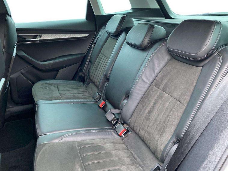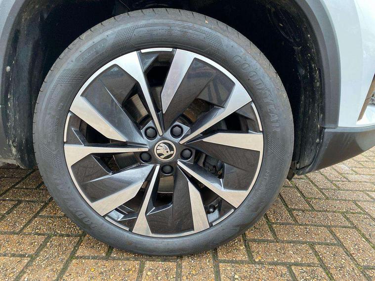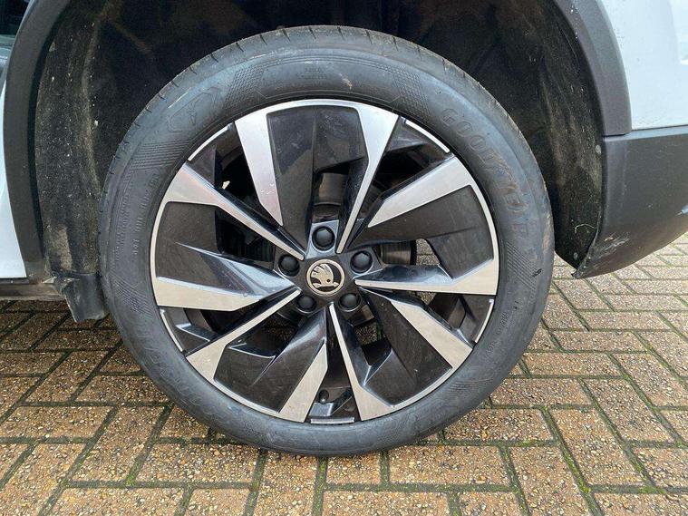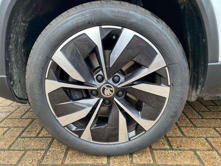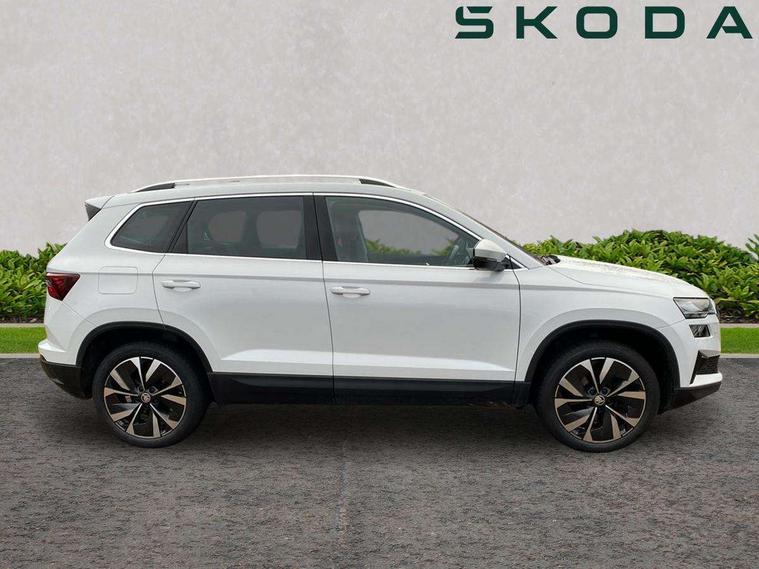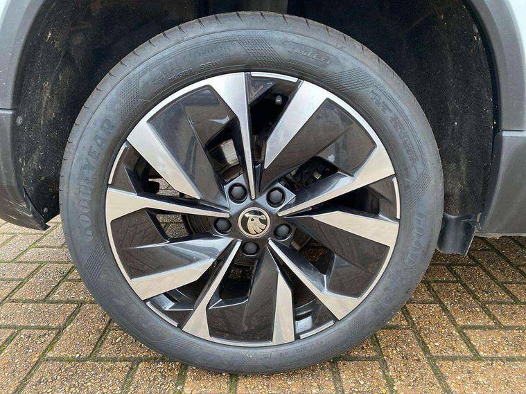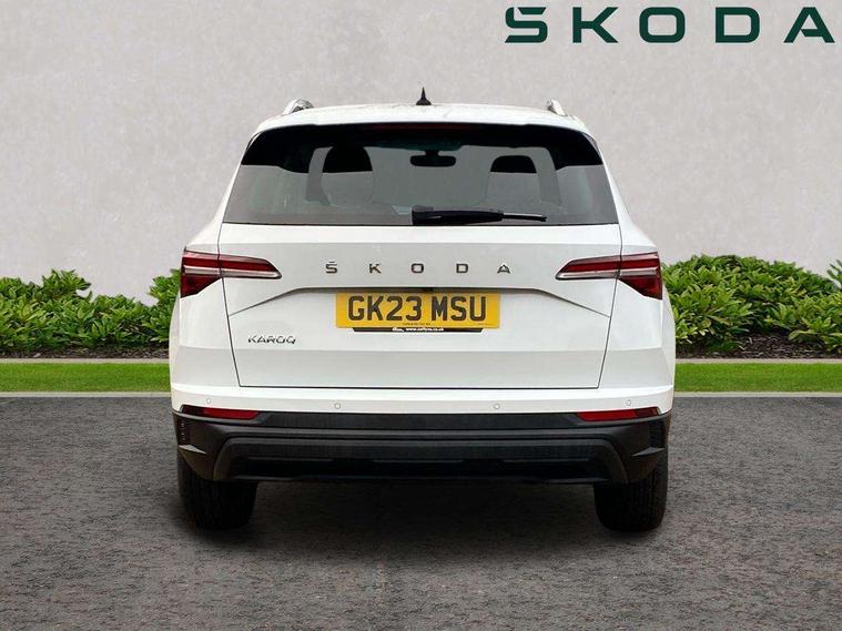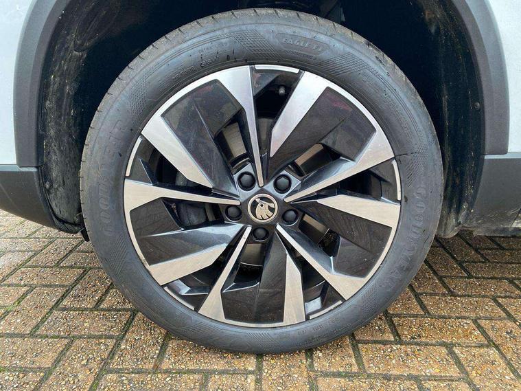 8" Digital display, Care connect, Driver fatigue sensor, Emergency services call system, Outside temperature gauge, Service interval indicator, SmartLink wireless for Apple and wired for Android, Start/stop system with regenerative braking, USB C Port x 2 in front centre console, 8 Speakers, DAB radio with Bluetooth, USB connection, Acoustic glass, Aero front windscreen wipers with intermittent function, Auto dimming rear view mirror with light and rain sensors, Black electric window control buttons, Body colour door mirrors and handles, Dynamic headlight range control with cornering light function, Electric front and rear windows with child proof lock, Heated rear windscreen, LED daytime running lights, LED rear lights with high functionality welcome effect and dynamic indicators, Light assistant (coming/leaving home/tunnel light), Plastic scuff plates, Privacy glass, Rear side wing doors, Rear spoiler, Rear window wiper with washer system and intermittent control, Safety reflectors on front doors, 1.5 litre bottle holders in driver and front passenger door panels, 12V socket in boot, 12v socket in front centre armrest with storage compartment and rear air vents, 2 Folding hooks and nets in boot, 2 spoke leather heated multifunction steering wheel with DSG paddles, 2 x Tablet holder, 3 rear height adjustable headrests, 3 seat bench in 2nd row, 4 foldable roof handles with rear coat hooks, Black floor carpet, Chrome inner door handles, Decorative door sills with KAROQ badging, Double sided boot floor, Foldable hooks in the boot, Front head restraints, Height adjustable front three point seats belts with tensioners, Height/reach adjust steering wheel, Ice scraper, Illuminated glovebox, Illuminated luggage compartment, Isofix child seat preparation for front passenger seat, Isofix child seat preparation outer rear, Manual lumbar support for front seats, Pen holder, Pollen filter, Rear boot cover, Rear reading lights, Rubbish bin door, Safety vest holder, Single front passenger seat, Storage box in upper central dashboard closed, Sunvisors with illuminated vanity mirrors, Textile floor mats, Ticket holder, VarioFlex seats with standard rear seat release, Chrome roof rails + chrome pack - Karoq, Parking pack - Karoq, Automatic door unlocking in case of crash, Automatic fuel cut off in case of crash, Child locks on rear doors, Driver airbag, Electronic parking brake with auto hold function, Emergency rear braking signal, ESC including ABS, MSR, ASR, EDS, HBA, DSR, RBS, MKB and traction control, Front side airbags, Hill hold control, Knee airbags, Passenger airbag with switch-off function, Pedestrian monitor, Seatbelt reminder signalisation and pretensioner for all seats, Three point seatbelts rear, Two tone horn, Tyre pressure display, Tyre pressure monitor, Alarm with interior monitoring, back up horn and tilt sensor with safe function, Electronic engine immobiliser, Keyless entry and start/stop, Remote central locking with 2 remote folding keys, Chrome framed air vents, 18" Procyon silver alloy wheels with anthracite aero inserts, Anti-theft wheel bolts protection, Storage on wheel cover, Tool kit,
