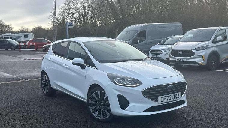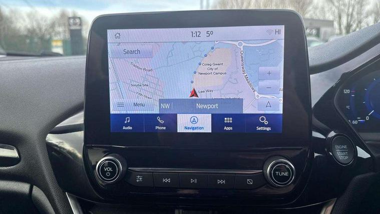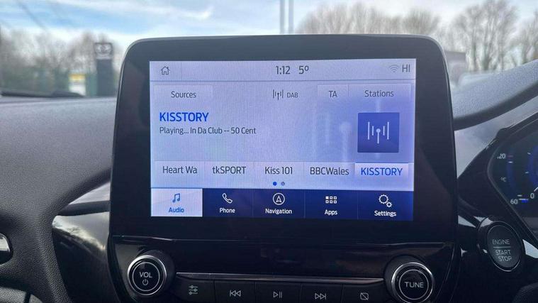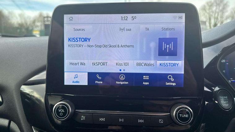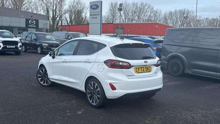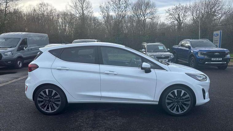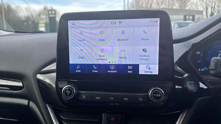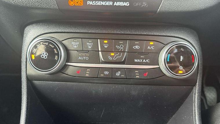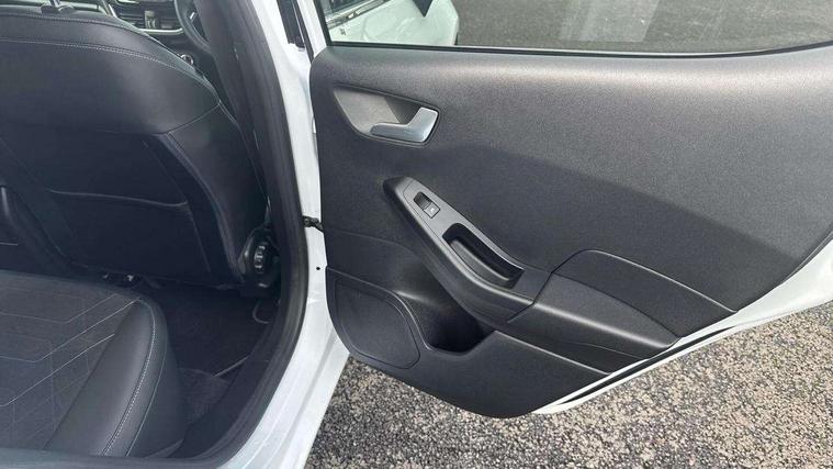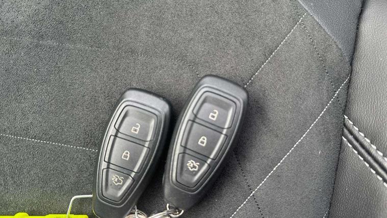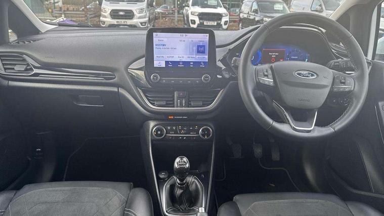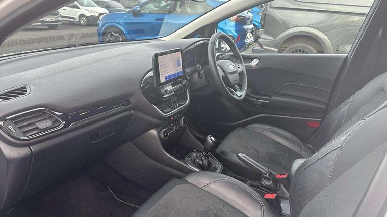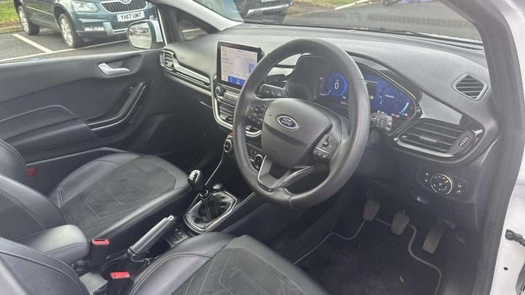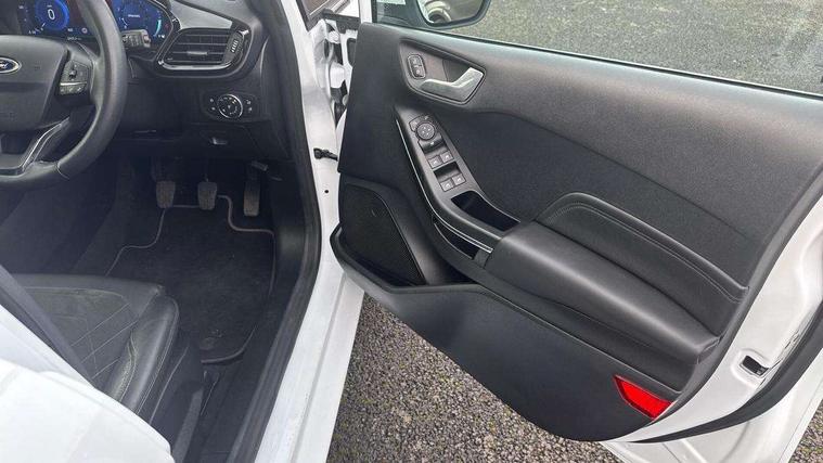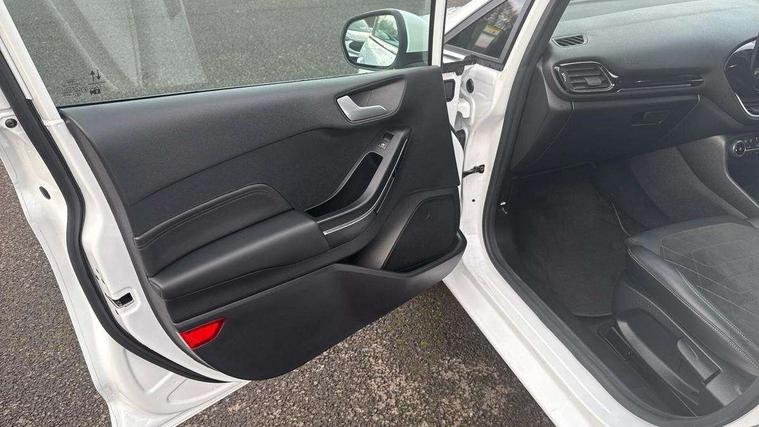 4.2" TFT instrument cluster screen, Bluetooth system, Electric power steering, Ford easy fuel, Rear parking distance sensors, Selectable drive modes (Normal, Sport, Track), Traffic sign recognition, Trip computer, 2 USB ports, Auxiliary input socket, B&O Premium audio system with 8" touchscreen, 10 speakers, 360 degree sound system, Ford SYNC 3 navigation system and Ford pass connect, DAB Digital radio, Steering wheel mounted controls, Auto high beam, Body colour bumpers, Body colour door handles, Body colour rear spoiler, Body coloured electrically operated and heated door mirrors with side indicators, Chrome beltline trim, Chrome front grille, Chrome lower window surround, Cornering front fog lights, Electric front windows/one touch facility, Electric rear windows, LED Night signature to rear lights, Power foldable door mirrors with puddle lights, Quickclear heated windscreen, Rain sensing wipers and auto dimming rear view mirror, Rear privacy glass, Rear wiper, 3 spoke leather trimmed steering wheel with audio control, 60/40 split folding rear seat, Adjustable head restraints, Boot carpet, Centre console with opening armrest, 2x cupholders, 12v and USB, Chrome inner door handles, Drivers and Passenger lumbar support, EATC - Electronic Auto Temperature control, Footwell illumination, Front floor mats in velour, Front map reading lights, Front seat and rear pockets, Height adjustable passenger seat, Illuminated glovebox, Leather gaiter, LED ambient lighting, Load area light, Luxury woven headliner, Manual 4-way driver seat adjust, Overhead console with sunglasses holder, Pollen filter, Rake/reach adjustable steering wheel, Sensico partial premium upholstery, Sensico wrapped steering wheel, NCAP Pack - Fiesta, 3 point seatbelts on all rear seats, ABS+EBA, Curtain airbags, Driver and passenger airbags, Drivers knee airbag, Electronic stability control with hill start assist, Front passenger airbag deactivation, Front side airbags, Seatbelt warning, Two tone horn, Tyre pressure monitoring system, Ford keyfree system with Keyless entry and keyless start, MyKey system, Remote central locking & engine immobiliser, Thatcham Cat.1 alarm, 17" 8 spoke alloy wheels,