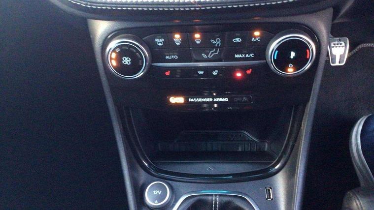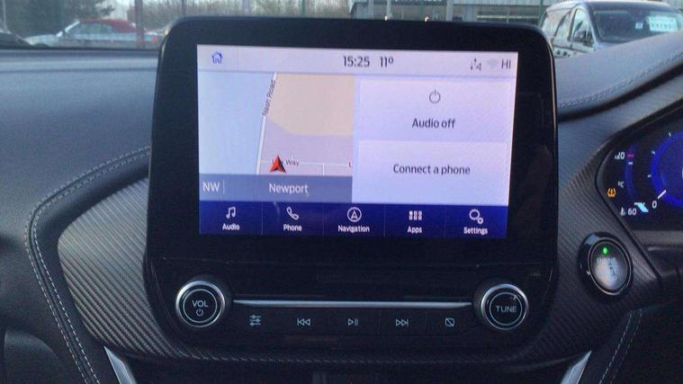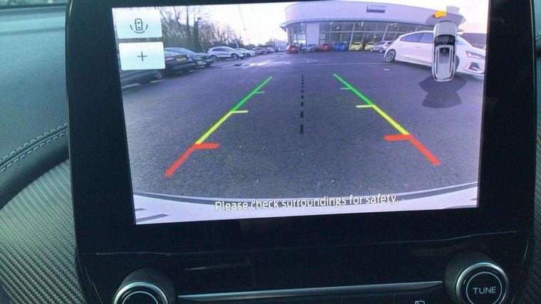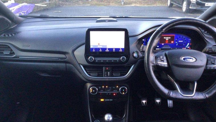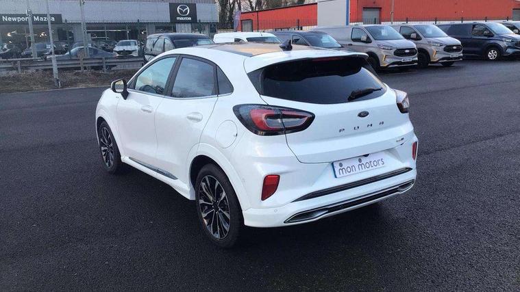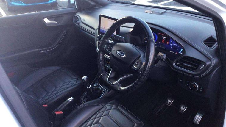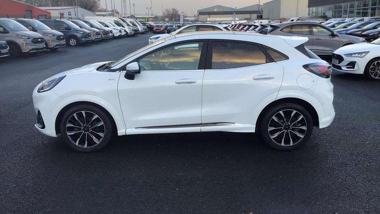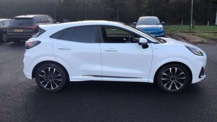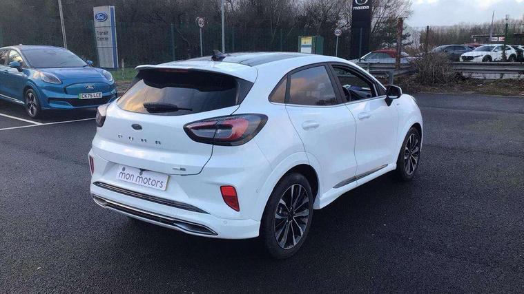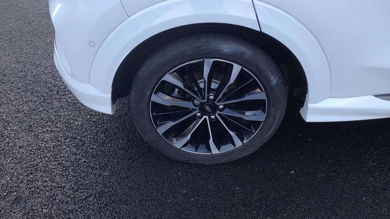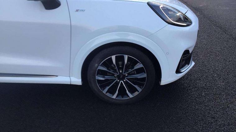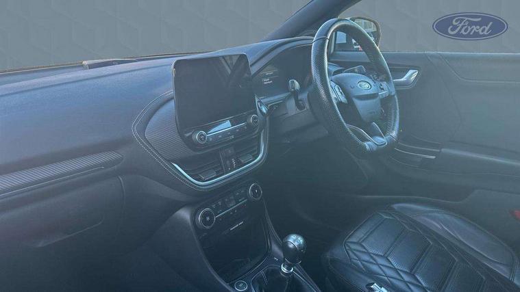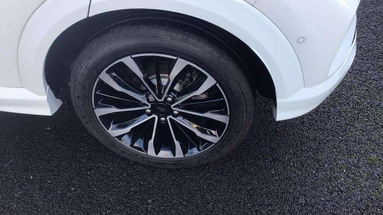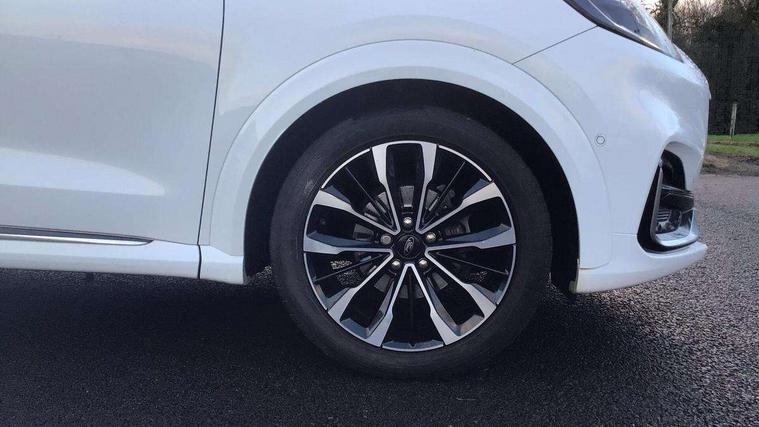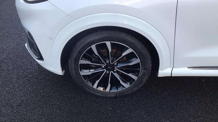 Ford easy fuel, Full digital 12.3" instrument cluster, Lane keeping aid with lane departure warning, Power assist steering, Rear parking sensor, Selectable drive modes(Normal, Eco, Sport, Slippery and Trail), Wireless charging pad, Automatic headlights with rain sensing wipers and auto high beam, Body coloured door mirrors, Bodyside chrome styling, Fixed LED headlamps, Front fog lights with cornering lights and LED rear lamps, Gloss black with chrome elements on front and rear bumpers, High chrome waistline, LED daytime running lights, Power foldable heated door mirrors with puddle lamps, Privacy glass to side rear windows and tailgate glass, Quickclear heated windscreen, Rear wiper, Satin aluminium accents to front grille, waistline and bodyside, ST-Line body kit with large rear spoiler wth sports suspension, Unique Vignale style upper grille and surround, Alloy sports pedals, Centre console with armrest and stowage, Driver and passenger seat lumbar and height adjust, Ford megabox extended bootspace, Front and rear floor mats, Front and rear head restraints, Manual air conditioning, Perforated leather flat bottomed steering wheel, handbrake and alumnium gearknob with metal grey stitching, Premium sensico wrapped instrument cluster, Windsor premium leather upholstery, B&O Premium Audio system + Ford SYNC 3 navigation pack - Puma, Comfort pack - Puma, 3 rear seatbelts, Electronic stability control (ESC) and hill start assist, Pre-collision assist with autonomous emergency braking, pedestrian/cyclist detection & post-collision braking, Tyre pressure monitoring system (TPMS), Thatcham alarm, Carbon look interior deco spears, Tyre inflation kit,