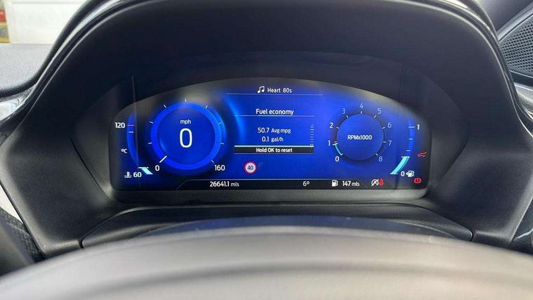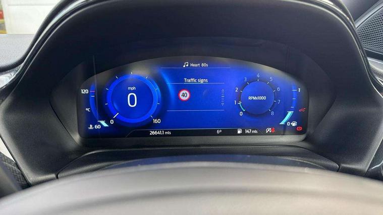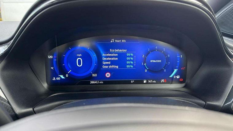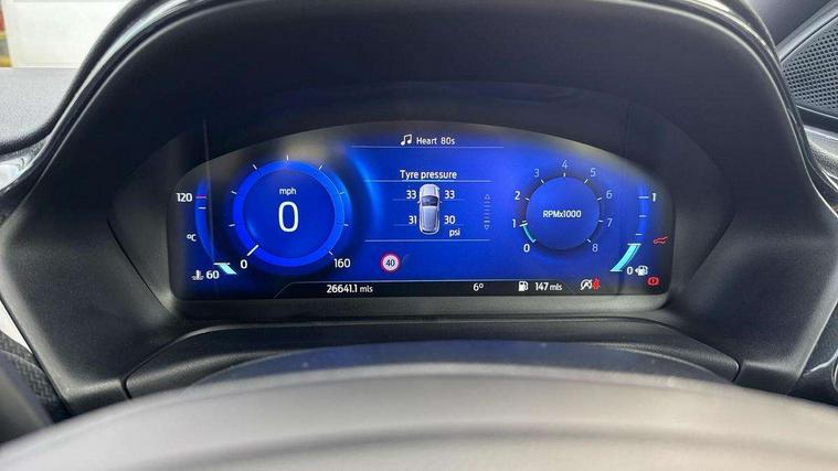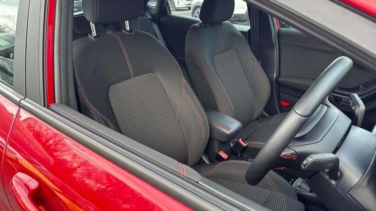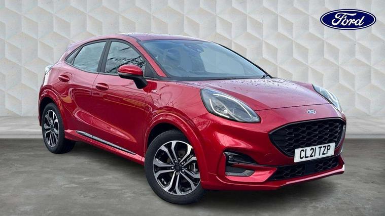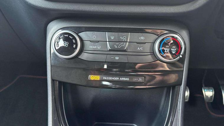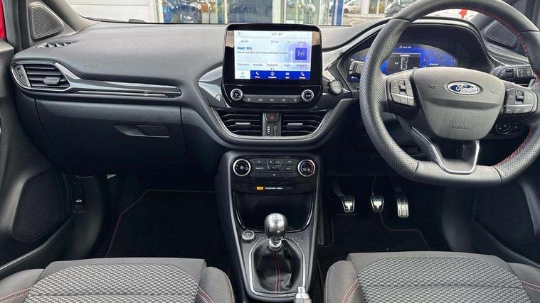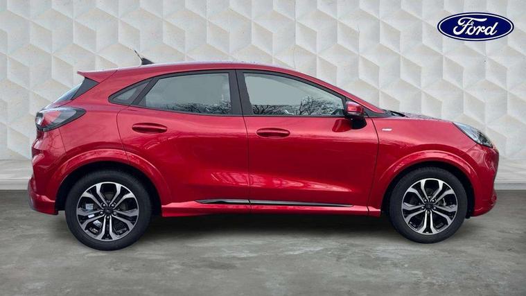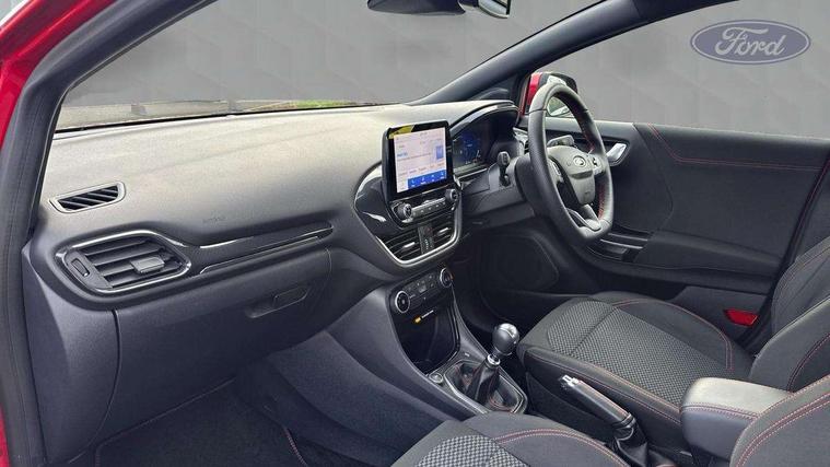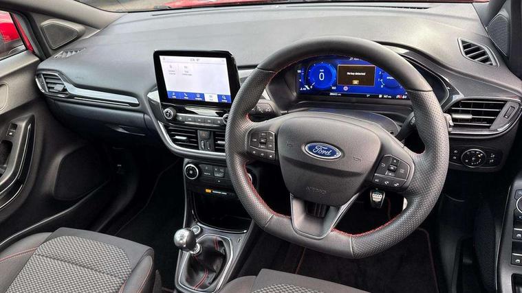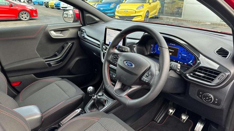 Ford easy fuel, Full digital 12.3" instrument cluster, Lane keeping aid with lane departure warning, Power assist steering, Power start button, Rear parking sensor, Selectable drive modes(Normal, Eco, Sport, Slippery and Trail), Automatic headlights with rain sensing wipers and auto high beam, Body coloured door mirrors, Front fog lights with cornering lights and LED rear lamps, Power foldable heated door mirrors with puddle lamps, Projector headlamps with LED day time running lights, Quickclear heated windscreen, Rear wiper, ST-Line body kit with large rear spoiler wth sports suspension, Centre console with armrest and stowage, Cloth upholstery, Driver seat height/lumbar adjust, Ford megabox extended bootspace, Front and rear floor mats, Front and rear head restraints, Manual air conditioning, ST-Line flat bottomed sensico leather steering wheel with leather handbrake and aluminium gear knob, Ford SYNC 3 navigation pack - Puma, 3 rear seatbelts, Electronic stability control (ESC) and hill start assist, Pre-collision assist with autonomous emergency braking, pedestrian/cyclist detection & post-collision braking, Tyre pressure monitoring system (TPMS), Thatcham alarm,