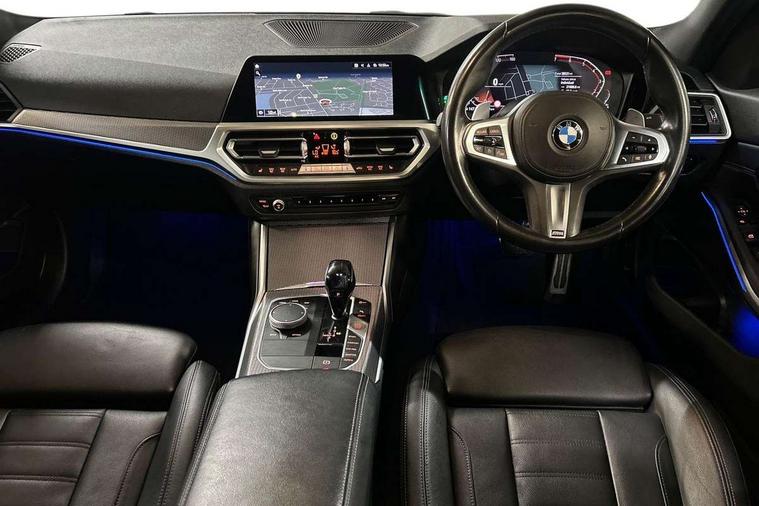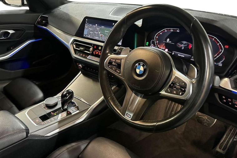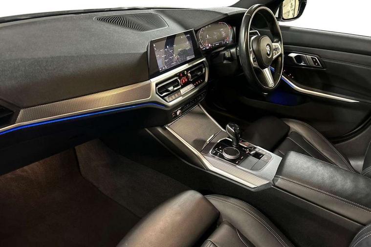 Active guard plus, Attentiveness assist, Auto start-stop, BMW ConnectedDrive online services, BMW Live Cockpit Professional sat nav system including 10.25" high resolution display and Intelligent Voice Assistant, BMW service history, BMW Teleservices, Brake pad wear indicator in front and rear, Check Control warning system for monitoring of lights and door/luggage compartment open warning, Condition based service, Electric power steering with Servotronic steering optimised at all speed ranges, iDrive controller on centre console, Instrument cluster with speedometer with mph readout, tachometer, fuel gauge and oil temperature gauge, Integrated owners handbook, Oil sensor for level and grade, warning by check control system, On board computer - average speed+fuel consumption, service interval, clock/date, odometer/trip meter, outside temperature display and ice warning, Optimum shift indicator, Personal Profile - automatic lock when driving away selectable, Variable sport steering, Balanced 50/50 weight distribution, Battery cut-out switch, Drive performance control - ECO PRO, comfort and sport modes, Larger capacity fuel tank, M sport suspension, Petrol Particulate Filter, Sport automatic transmission with steering-wheel mounted gearshift paddles and launch control, Stroke dependent dampers, DAB tuner, Electronic service booklet, Acoustic glazing, Active airstream chrome frame kidney grille with 8 high gloss black vertical slats, Automatic headlight beam throw control with load dependent regulating reaction, dynamic compensation of braking dive and acceleration squat, Black roof mouldings, Body colour - fuel filler flap, front and rear bumpers, door handles and mirror caps with integrated turn indicator + bottom segment in matt black, Dynamic brake lights, Electric windows - front and rear, with open/close fingertip control, anti-trap facility and comfort closing, Exhaust tailpipe - split left and right, Extended LED headlights, Exterior mirrors - electrically folding with anti-dazzle, Fading support, Front and rear bumper system with replaceable deformation elements, Front black door sill finishers with BMW designation, Green tinted heat protection glazing, High gloss shadow line exterior trim, Interior rear view electrochromatic mirror with automatic anti dazzle function, LED front fog lights, Lightweight engineering, M designation on front side panels, left and right, Matt black exterior B pillar, Model designation on right side of tailgate, Rain sensor with automatic headlight activation, Rear wiper, Shark fin antenna, Two part LED tailights in L-shape with components in smoked glass, brake light, LED turn indicator and rear fog light, Visible VIN plate, Welcome lights in interior and door handle area, Windscreen wipers with integrated washing jets, 12V power socket in front storage compartment, 2 front cupholder in centre console with clamping elements and matt black inlay, 3 rear seats with non folding headrests with 3 point seat belts, 3 zone automatic air conditioning, 4 pieces lashing eyelets in luggage compartment, 40:20:40 split folding rear seat with loading system, Ambient lighting with welcome carpet light, Anthracite headlining, Armrest integrated in front and rear door trim + front centre console armrest, Centred top Luggage compartment lights, Four grab handles integrated in roof lining, Front and rear door exit lighting (left / right), Front and rear door pockets, Front and rear reading lights, Front and rear velour floor mats, Front head restraints, Front sport seats, Heated driver and front passenger seats, Height adjustable mechanically and infinitely variable steering column, Illuminated armrest storage compartment, Illuminated glove compartment with separate small compartment, Interior lighting - front centre over interior mirror with soft light, rear centre and front and rear footwell lighting, M Sport multifunction leather steering wheel, Make-up mirror lights, Rear centre armrest with 2 cupholders, Rear centre console with storage compartment and ventilation grille, Sunvisors with vanity mirrors and ticket pocket, Toolkit located in luggage compartment, Connected pack professional - 3 Series Saloon/Touring, M Aerodynamics pack - 3 Series Saloon/Touring, 2 tone horn, BMW emergency call, Brake energy regeneration, Braking pre-tensioning, Child proof locking system in rear door, Child seat ISOFIX attachment rear outer seats, Coasting in idle in ECO PRO mode, Crash sensor activating of airbags, Unlocking doors, hazard warning lights, fuel cut off, interior lighting+activation of safety battery terminal clamp, Driver and front passenger side airbags, integrated in the door side seat backrest bolsters for all seat variants, Driver/Front Passenger airbags, Dry braking, Dynamic brake control, Dynamic stability control + (DSC+) - Anti-lock Braking System (ABS) with brake assist and cornering brake control + Automatic Stability Control (ASC), Dynamic Traction Control - DTC, Electromechanical parking brake including automatic hold function and automatic release of the parking brake when pulling away, Electronic differential lock control (EDLC), Front passenger manual airbag deactivation, Head airbags for all 4 outer seats, Hill start assist, Seat belt security check for driver and front passenger, Side impact protection, Three 3 point seat belts on all seats including front belt stopper, pyrotechnic belt tensioners and belt force limiters, Tyre pressure monitoring with three level warning strategy, Ventilated front and rear disc brakes, Warning triangle and first aid kit, Alarm system (Thatcham 1) with remote control and electronic engine immobiliser, Central locking switch for all doors, fuel filler cap and luggage compartment, Remote control with integrated key one button open/close vehicle and windows, sole opening of the luggage compartment lid and panic mode, Start/stop button with Comfort Go keyless engine start and auto Start/stop deactivation button, Vehicle key wit