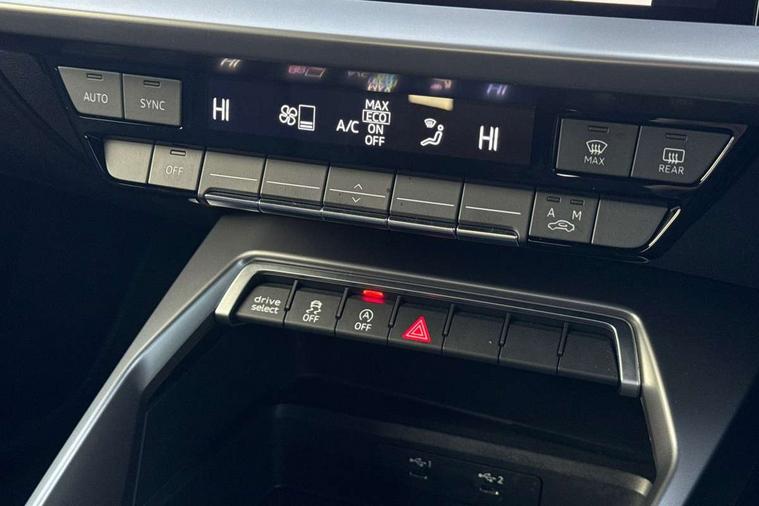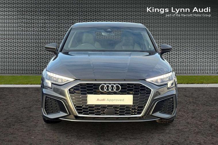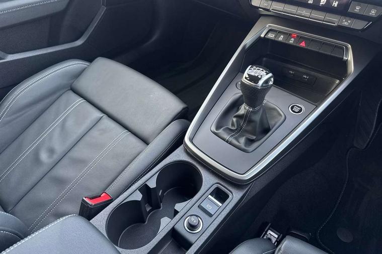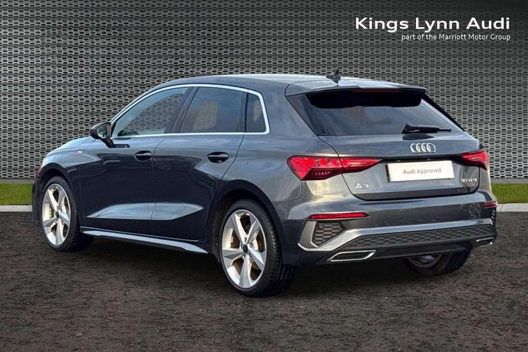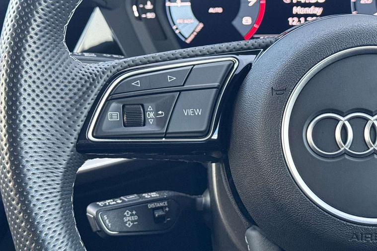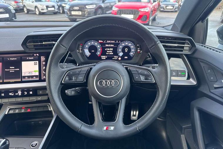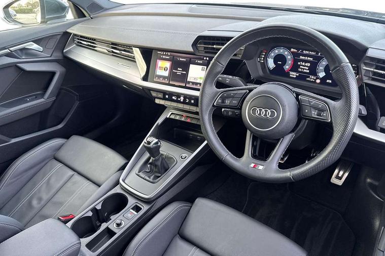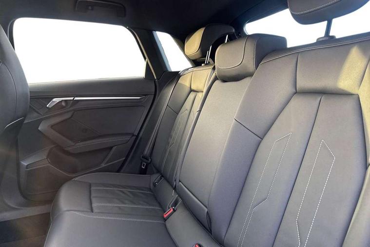 Audi drive select (Auto, Comfort, Dynamic and Individual), Audi smartphone interface, Audi Virtual Cockpit - 10.25" digital and colour instrument cluster, Automatic start/stop system with recuperation, Bluetooth interface, Camera based traffic sign recognition, Collision avoidance assistant, Cruise control, e-Call (emergency call), Electromechanical power speed sensitive steering, Lane departure warning system, MMI Navigation Plus with high resolution 10.1" colour touch screen display, Rear parking sensors, Service indicator, Trip computer, Voice control system with natural language interaction, Sports suspension, 2xUSB-C connection with data and charging functions, 6 passive loudspeakers, DAB Digital radio, 3rd brake light, Acoustic glass windscreen, Aluminium window trim, Auto dimming frameless rear view mirror, Body colour exterior mirrors, Electrically adjustable/heated/folding/auto dimming door mirrors with integrated LED indications + kerb view function for passenger side, Front electric windows, Illuminated door sills with aluminium inserts at the front with S logo, LED daytime running lights, LED headlights with LED rear lights and dynamic rear indicators, Light and rain sensors, Privacy glass - dark tinted rear window, rear door and side windows, Rear electric windows, Rear side air outlets in grained matt black, Rear side wing doors, Rear wiper, S line bumpers, S roof spoiler, 12V socket and storage compartment in front centre console, 3 seat bench in 2nd row, 3 spoke leather multifunction steering wheel, 4 way electrically adjustable lumbar support for driver and front passenger, 60/40 split folding rear seat bench, Black cloth headlining, Dual zone electronic climate control, Front and rear centre armrest in artificial leather, Front and rear headrests, Front/rear floor mats, Height and reach adjustable steering wheel, Interior lighting - glove compartment light and right hand side, Luggage compartment floor covering, Manual boot compartment lid, Manually adjustable front seats, Seat side bolsters, Single front passenger seat, Stainless steel pedals and front footrest in black, Twin leather upholstery with front sports seats S embossed logo, Aluminium interior elements pack - A3 Sportback, LED interior lighting pack - A3 Sportback, S line styling pack - A3 Sportback, 3x3 point rear seat belts, Driver and front passenger airbag with passenger airbag deactivation, Electronic Stabilisation Control (ESC) including ABS, ASR and EDL, First aid kit with warning triangle and 2 safety vests, Front side airbags with head airbags and interaction airbag, Pre-sense front with pedestrian and cyclist detection, Seatbelt monitoring, Tyre pressure loss indicator, Anti theft alarm, Anti-theft wheel bolts, Electronically operated child locks, Immobiliser, Remote control central locking, Dark spectrum aluminium inlays, accent surfaces in the dashboard and centre console in platinum grey silk effect paint finish,