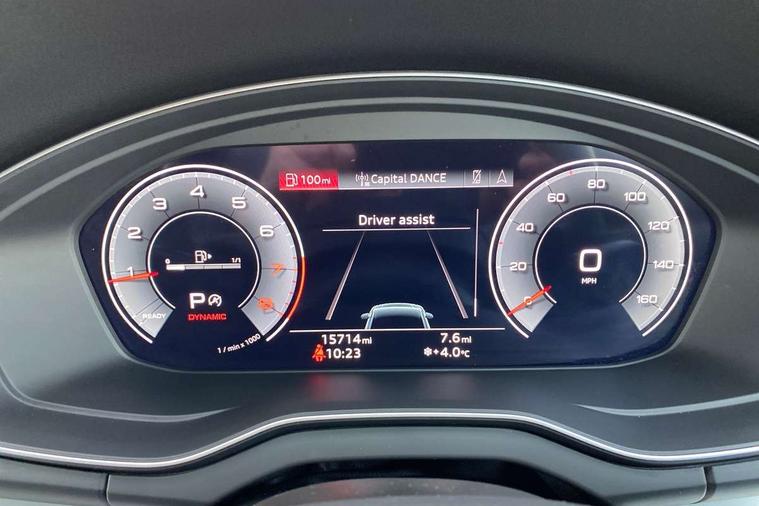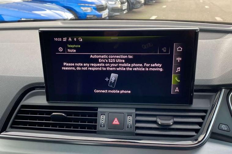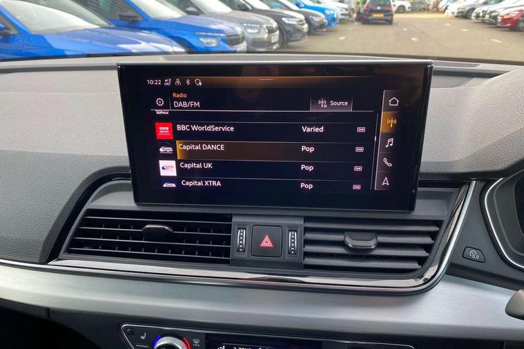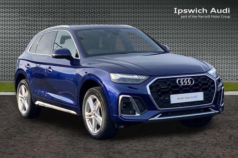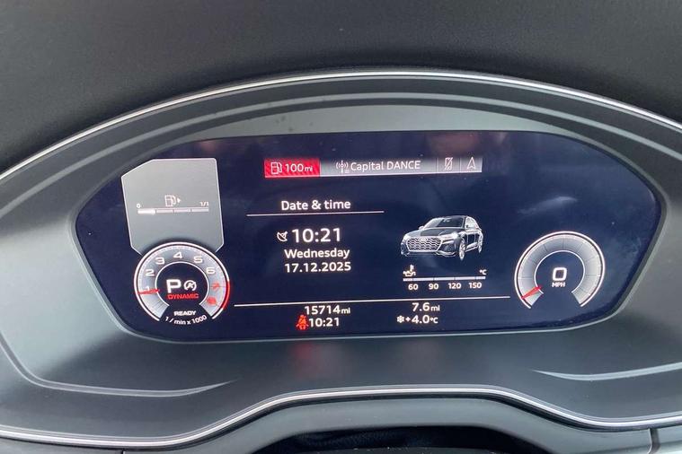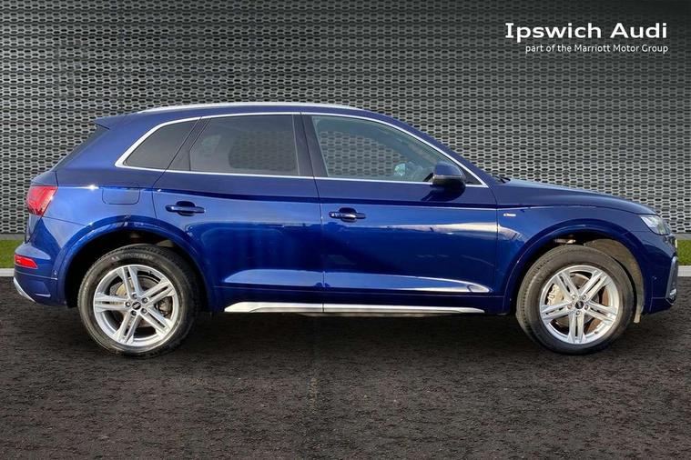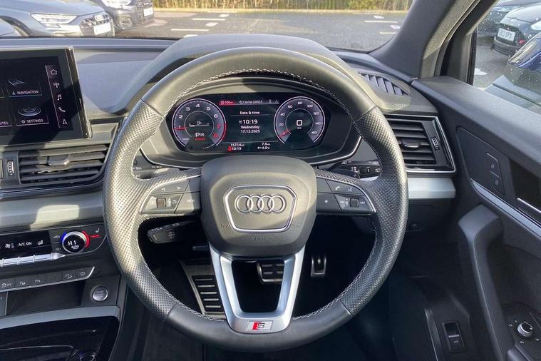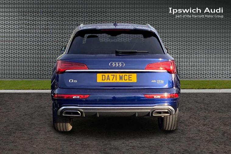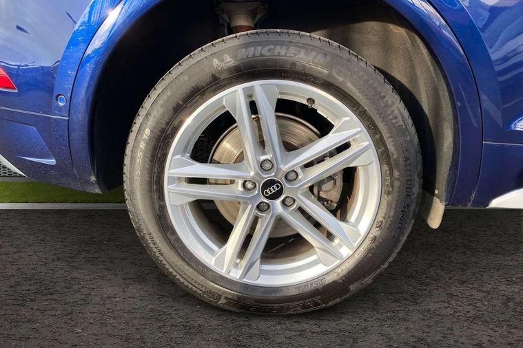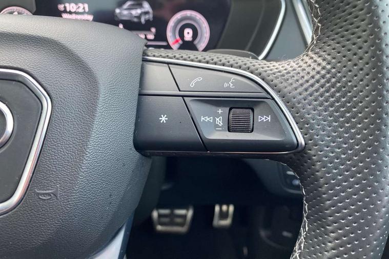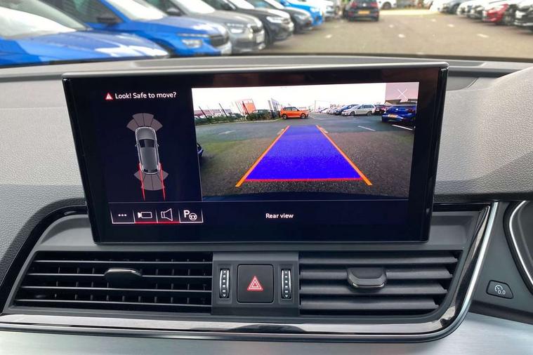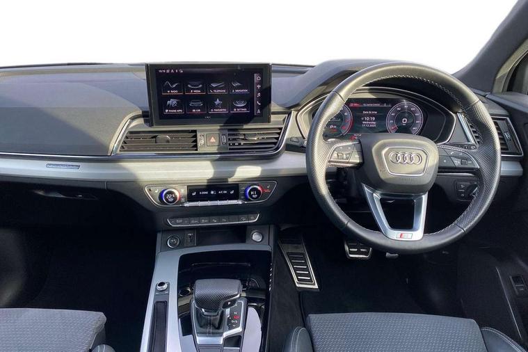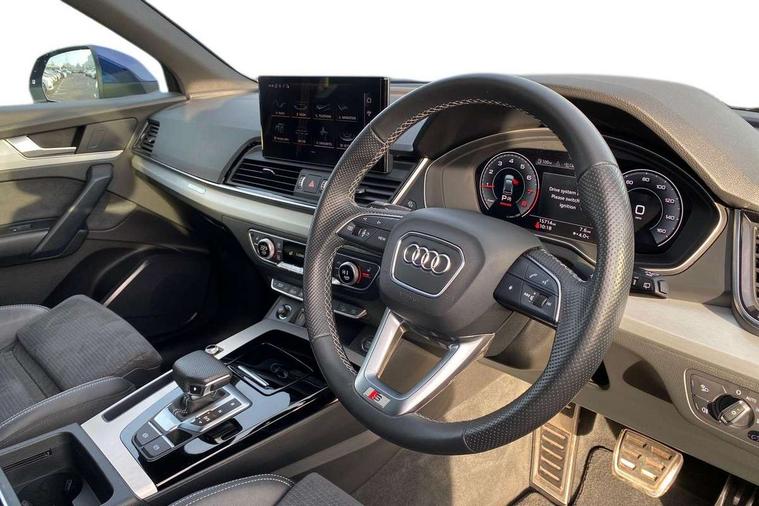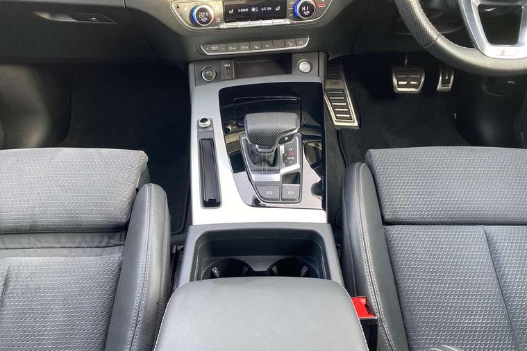 Audi connect safety and service (e-call), Audi connect with Amazon Alexa Integration, Audi drive select, Audi virtual cockpit plus with 12.3" screen and three different layout designs, Audi wireless smartphone interface, Automatic start-stop system with coasting functionality and efficiency programme, Bluetooth interface, Electro - mechanical power assisted steering, MMI navigation plus with 10.1" touch screen, Power tailgate, Reversing camera, Service interval indicator, Voice control system with Audi hotword activation "Hey Audi", Quattro on demand, S line sports suspension, 2 x USB charging port with aux input socket, DAB Digital radio, 3rd brake light, Acoustic windscreen, Aluminium roof rails, Audi matrix LED headlights with dynamic front and rear indicators, Auto dimming rear view mirror, Automatic headlights and windscreen wipers, Body colour bumpers, Body colour door mirrors, Body colour rear diffuser with matt aluminium silver surrounds, Body colour underbody protection, Chrome plated exhaust trims, Daytime running lights, Door sills in Selenite silver, Electric adjustable/heated/folding door mirrors, Front air inlet surrounds in aluminium, Front and rear electric windows, Front radiator grille in honeycomb design, Headlight washers, Lower bumpers painted in contrast Manhattan grey, Rear chrome trim strip below lights, Rear privacy glass and rear side windows, Rear side wing doors, Rear spoiler, Rear wiper, Roof bars, S Line badges on the front wings, S Line front and rear bumpers, S Line side skirts, 3 rear headrests, 40:20:40 split folding 3 rear bench seat in 2nd row with rear centre armrest, Black cloth headlining, Comfort front centre armrest, Contrast stitching on seats, steering wheel and gear lever gaiter, Deluxe 3 zone electronic climate control, Front/rear floor mats, Gear lever in black leather, Heated front seats, Height adjustable front head restraints, Height/reach adjustable steering column, Illuminated door sill trims with S logo, ISOFIX child seat mounting and top tether, Luggage compartment cover, Manual seat adjustment with 4-way electric lumbar support, Removable luggage compartment floor, Single front passenger seat, Stainless steel pedals, Sunvisors with vanity mirrors, High gloss pack - Q5, LED interior light pack - Q5, 3 point seatbelts on all seats, 6 airbags - Driver, front passenger, curtain and side airbags, Electrically operated child locks on rear doors, Electromechanical parking brake, Electronic stabilisation control including ABS, ASR and EDL, Front passenger airbag deactivation, Hill descent control, Hill hold assist, Multi collision brake assist, Pop-up bonnet for pedestrian protection, Pre sense city, Seat belt force limiter, Seatbelt monitoring, Tyre pressure warning, Warning triangle and first aid kit, Anti theft alarm, Anti-theft wheel bolts, Keyless Go access/ignition system, Matt brushed aluminium inlays,