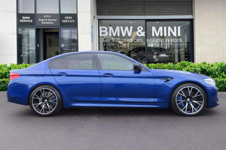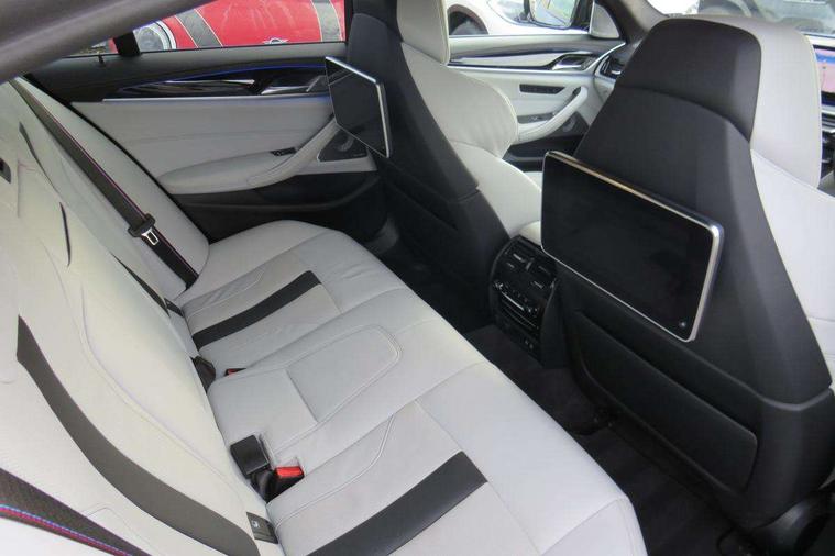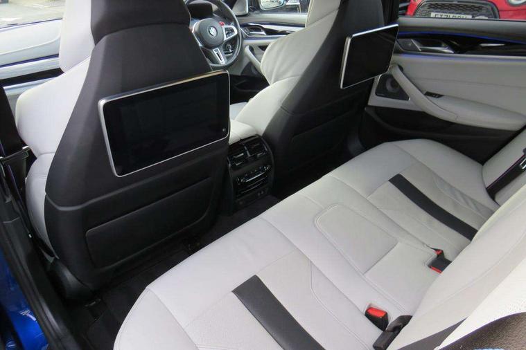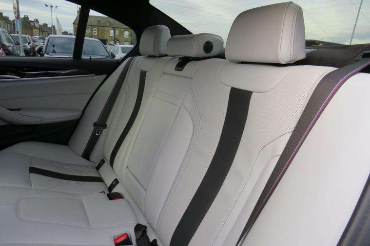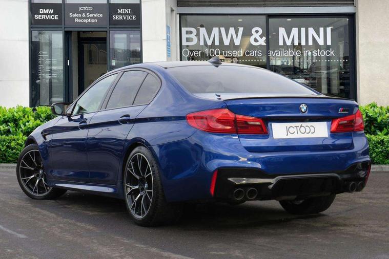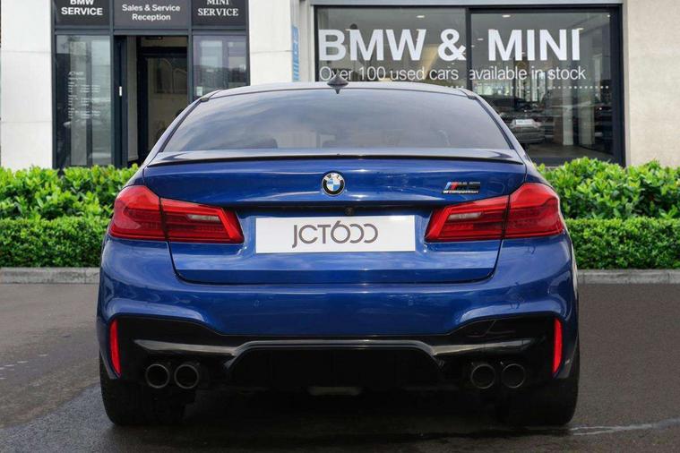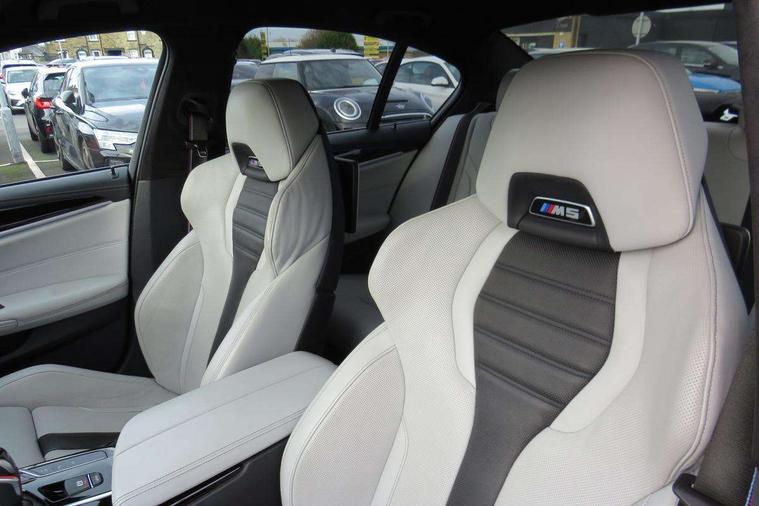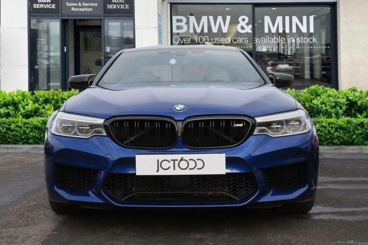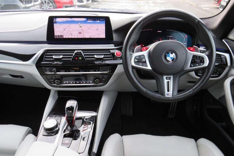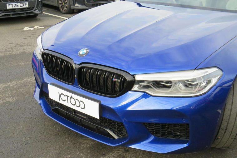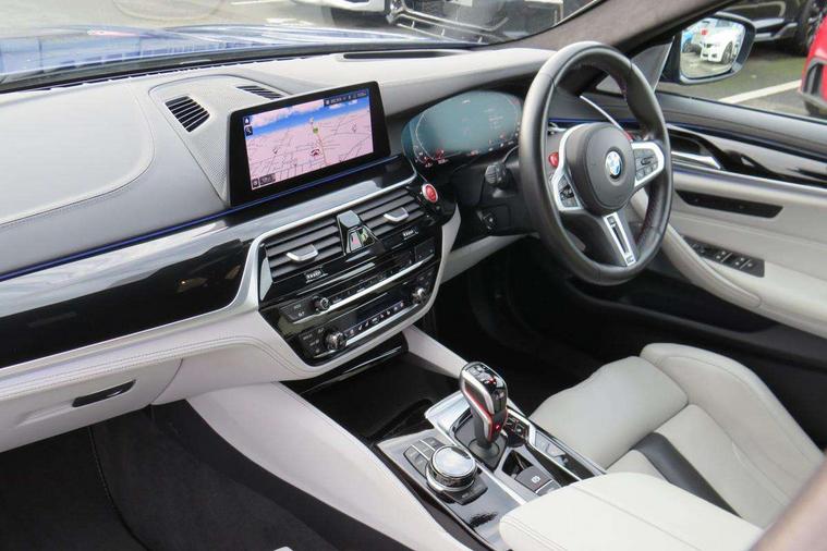 20GB Hard drive, Automatic bootlid operation, BMW Live Cockpit Professional sat nav system including 10.25" high resolution display and Intelligent Voice Assistant, BMW Online services, BMW Teleservices, Brake force display, City brake control, Comfort access system with smart opener, Enhanced bluetooth with wireless charging, Front/rear Parking distance control, Head up Display, iDrive controller and display with 10.2" colour display monitor, Lane departure and rear collision warning system, On board computer, On-board diagnosis - OBD, Outside temperature display, Park assist plus, Personal Profile, Rear cross traffic alert, Reversing camera, Service interval indicator, Servotronic PAS, Speed limiter, Voice control system, Wifi hotspot preparation, Adaptive drive with variable damper control, Anti-roll bars, Petrol Particulate Filter, BMW professional radio, DAB Digital radio, Gesture control for infotainment system, Anti-corrosion treatment, Auto dimming door mirrors, Auto dimming rear view mirror, Body colour door handles, Body coloured bumpers, Body coloured side sills, Dynamic brake lights, Electric folding/heated door mirrors with integrated indicators, Electric front and rear windows with fingertip open/close + anti-trap all round, Follow me home headlights, Heated windscreen washer jets, High beam assistant, High gloss black door mirrors, High gloss black kidney grille, High gloss black rear apron, High gloss black side gills with M5 logo, Icon Adaptive LED headlights, Illuminated door handles, Illuminated door sill finishers with M5 designation, LED daytime running lights, M rear spoiler, M side gills with M5 logo, M Sport exhaust system, Rain sensor with auto light activation system, 12V power point front, 4 zone control automatic air conditioning, Additional 12V sockets in rear and luggage compartment + twin USB charging sockets, Alcantara headlining in anthracite, Ambient interior lighting, Anthracite Velour floor mats, Battery in luggage with jump start facility, Electric adjustable steering column, Front centre armrest with storage compartment, Front cupholders x 2, Front footwell lights, Front reading lights, Front/rear armrests within door panels, Gearshift paddles, Illuminated glovebox with lock, Isofix rear child seat preparation, M leather steering wheel, M Sport multi-function front seats with electric lumbar support and driver memory, Multi-function controls for steering wheel, Rear centre armrest with 2 cupholders + storage, Rear footwell lights, Rear headrests, Connected package professional - M5, ABS/EBD, Auto hold function, Automatic Stability Control (ASC), BMW emergency call, Brake assist function, Brake energy regeneration, Cornering brake control (CBC), Crash Sensor - activates hazard/interior lighting + unlocks doors, Door reinforcements, Driver/front passenger side airbags, Driver/Passenger airbags (Impact dependent), DSC - Dynamic Stability Control, Dual horn, Dynamic brake control, Dynamic Traction Control - DTC, Electromechanical parking brake, Front and rear head airbags, Front head restraints with anti-whiplash, Front passenger airbag deactivation, Fuel cut off safety device, Hill start assist, M sport seatbelt, Motor Slip Regulation (MSR) - Engine Drag Torque Control, Seat belts front inertia reel with pyrotechnical belt latch tensioner, belt force limiter and belt restrainer, Side impact protection, Three inertia reel rear seatbelts, Tyre pressure monitoring system, Warning triangle and first aid kit, Automatic drive away locking facility, Engine immobiliser, Locking wheel bolts, Remote central locking, Remote control Thatcham category 1 alarm, 20" M Y-spoke light alloy wheels with mixed tyres in bicolour finish - style 789, Tyre mobility system,