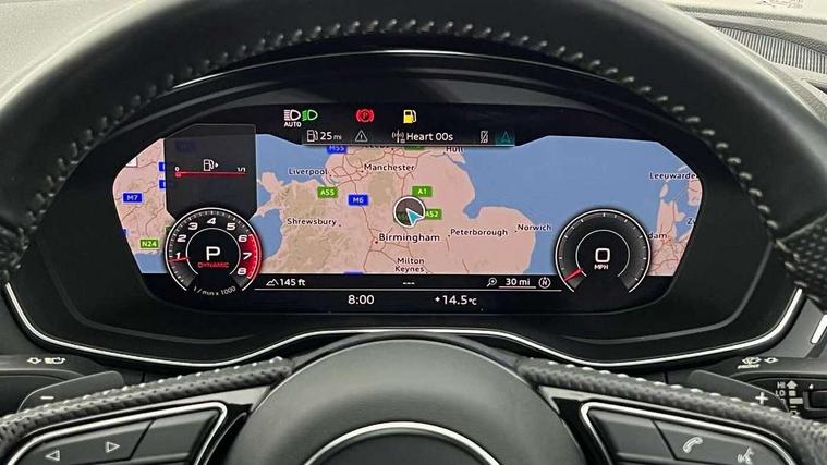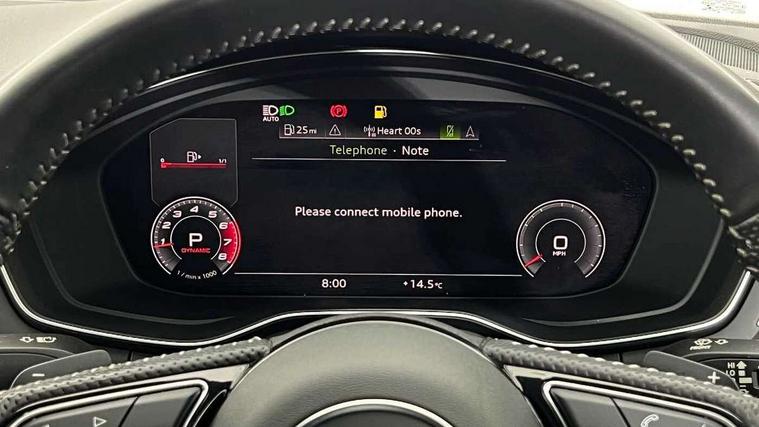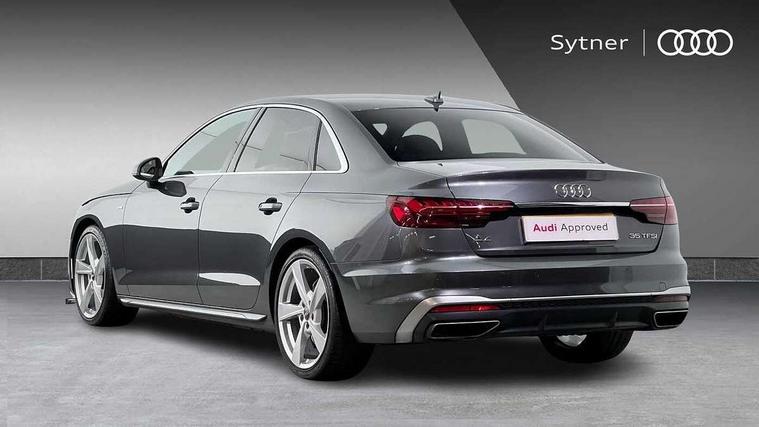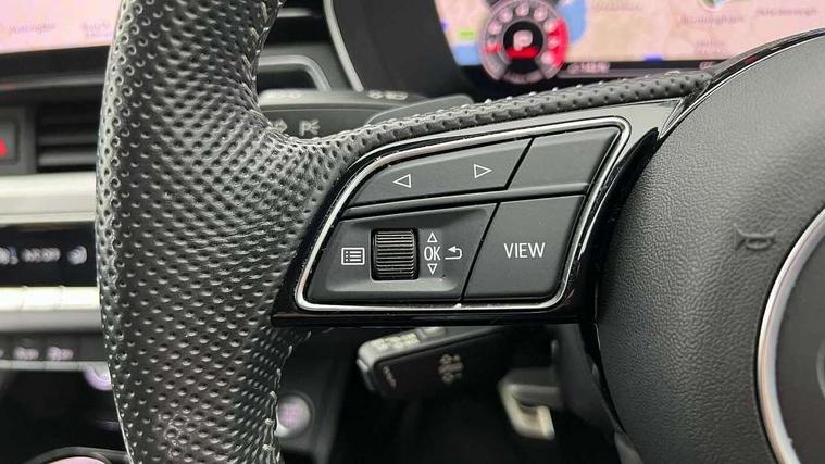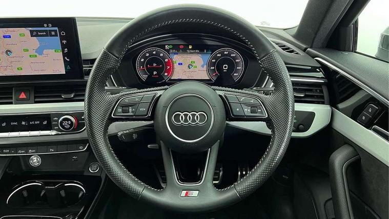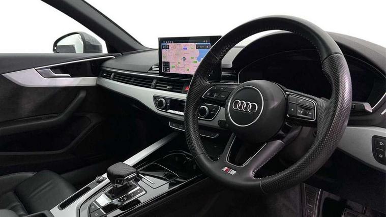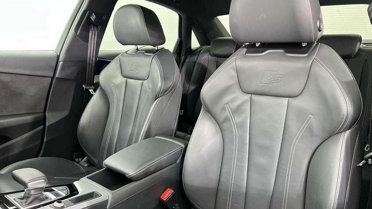 Audi connect safety and service (e-call), Audi drive select, Audi parking system plus with front and rear sensors, Audi smartphone interface, Audi virtual cockpit, Automatic start-stop system with coasting functionality and efficiency programme, Bluetooth interface, Electric boot lid release, Electromechanical power steering, MMI Navigation plus with MMI touch includes 10.1" high resolution colour MMI display, 3D map, Rear view camera, Voice control system, 54 litre fuel tank, Sports suspension lowered by 23mm, 2 USB charging ports, 8 passive loudspeakers, DAB digital radio reception, Auto dimming rear view mirror, Body colour door handles, Body colour front spoiler lip, Body colour side sill trim, Body coloured door mirrors, Electrically folding auto dimming/adjustable/heated door mirrors with LED side indicators and kerb view function for passenger side, Grained matt black side air inlets with matt aluminium silver inlay, High beam assistant, Honeycomb structure radiator grille in grained matt black, LED headlights with LED rear lights + dynamic rear indicators + headlight adjustment and high beam, turning light + LED daytime running lights, Matt aluminium silver tailpipe trim, Privacy glass, Rain and light sensors, S Line badges on the front wings, S line front and rear bumpers with side skirts, S Line rear diffuser in matt titanium black with trim strip in matt aluminium silver, Windscreen with acoustic glazing, 4 way electric lumbar support for driver and front passenger, 40/20/40 split folding 3 rear seat bench in 3 parts with rear centre armrest, Black cloth headlining, Black perforated leather gearknob, Contrast stitching on seats, steering wheel and gear lever gaiter, Deluxe 3 zone electronic climate control, Door sill trims with aluminium inlay, Front and rear head restraints, Front centre armrest, Heated front seats, Illuminated door sill trims with S logo, ISOFIX child seat mounting and top tether, Manual seat adjustment, Stainless steel pedals and foot rest, Tool kit, High gloss package - A4, LED Interior light pack - A4/S4, 3 rear seatbelts, 6 airbags - Driver, front passenger, curtain and side windows, Electronic Stabilisation Control (ESC) including ABS, ASR and EDL, Hill hold assist, Multi collision brake assist, Pop-up bonnet for pedestrian protection, Pre sense city, Seatbelt monitoring, Warning triangle and first aid kit, Anti theft alarm, Anti theft wheel bolts, Keyless Go, Matt brushed aluminium inlays, Tyre repair kit,