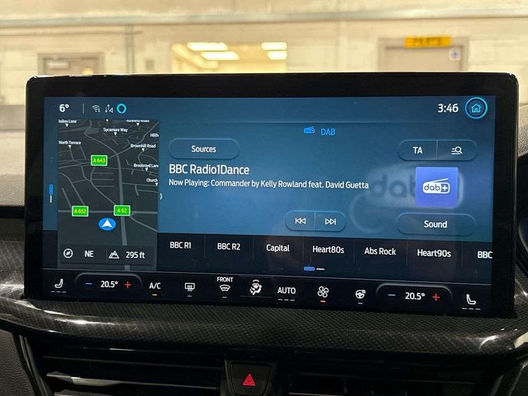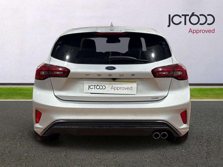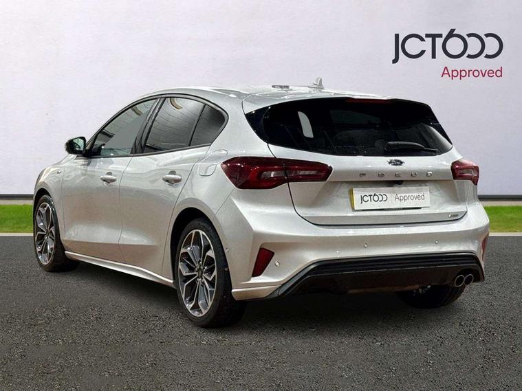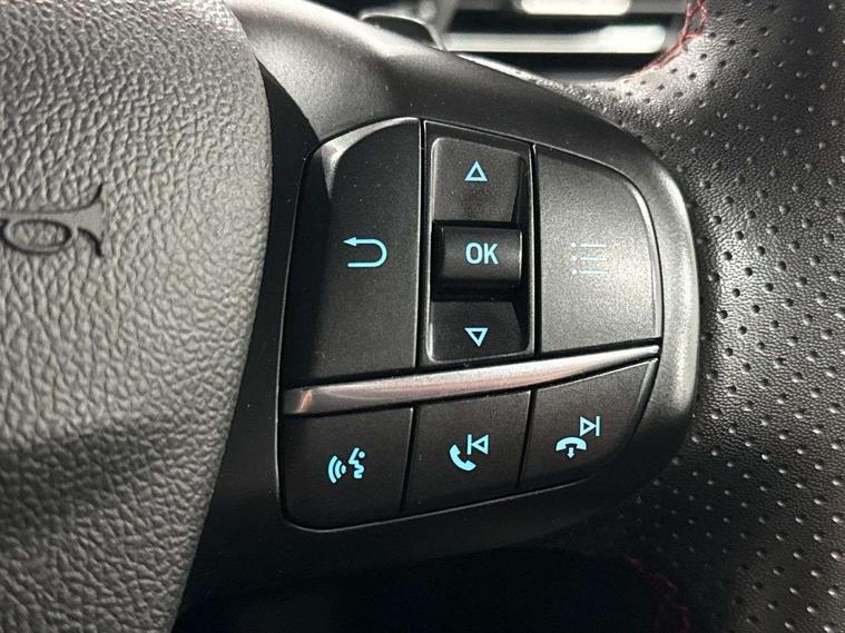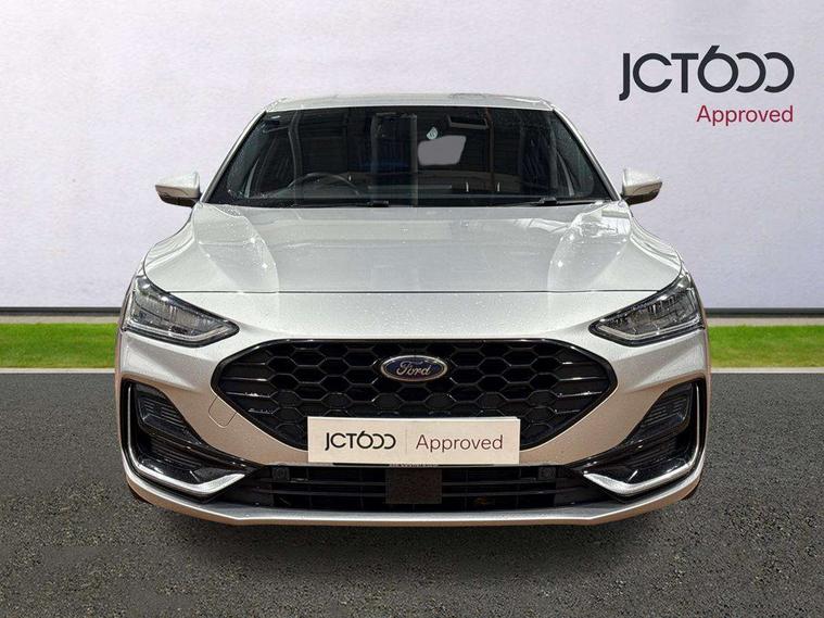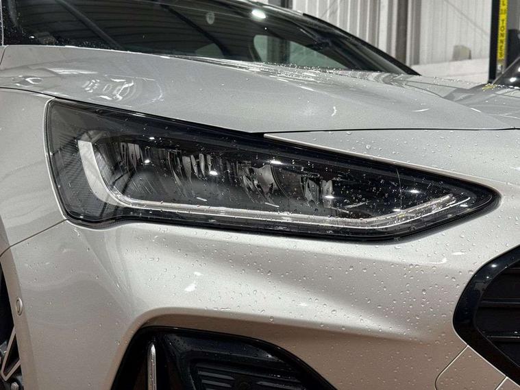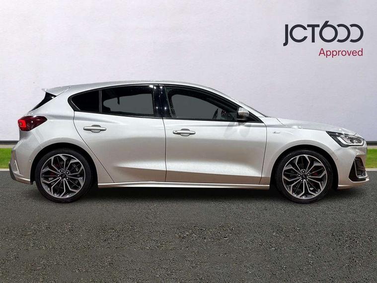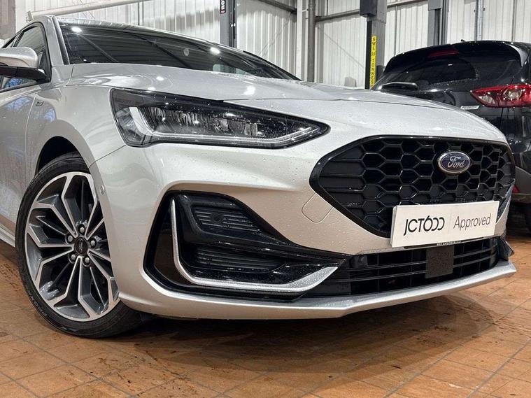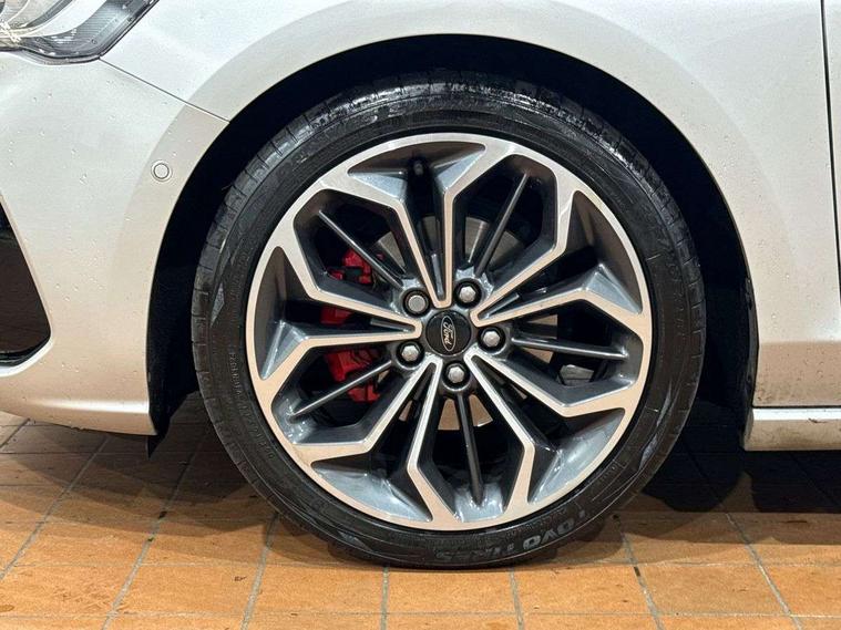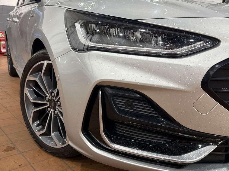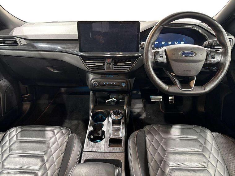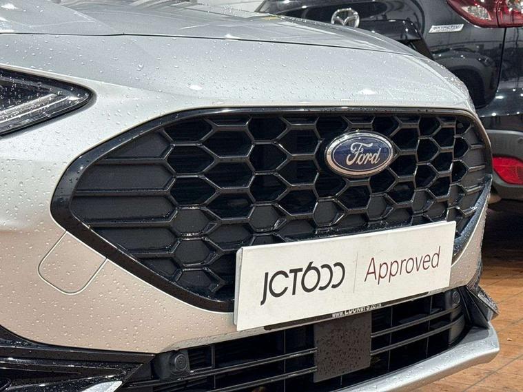 12.3" Digital instrument cluster, Bluetooth system, Digital clock, Easy fuel capless refuelling system, Eco mode, Ford SYNC4 Nav with 13.2'' touchscreen, DAB, Emergency Assistance, Apple Carplay & Android Auto, B&O Premium Audio with 10 speakers, FordPass Connect, Lane keeping system - lane keeping alert and lane keeping aid, PAS, Rev counter, Selectable drive mode, Service interval indicator, Trip computer, Wireless charging pad, Sports tuned suspension, 2 USB ports, Auto headlamps (on/off), Body coloured door handles, Electrically operated front and rear windows with one touch opening and closing, Electrically operated heated power fold door mirrors with puddle lamp with side indicators, Front variable intermittent wipers with electric wash, Heated rear window, LED daytime running lamp, LED rear lamps, LED third brake light, Polished twin tailpipe, Privacy glass, Quickclear heated windscreen, Rain sensor, Rear side wing doors, Tailgate wash/wipe, Unique ST-Line grille, full bodystyling kit, and large body coloured rear spoiler, 3 rear headrests, 3 seat bench in 2nd row, Dual zone electronic air temperature control, Full sensico premium upholstery, Height adjustable front headrests, Isofix child seat preparation, Load through ski hatch, Manual 4-way passenger seat adjusts, Power 4-way driver seat adjust, with power lumbar adjust, Reach + rake adjustable steering column, Single front passenger seat, Winter pack - Focus, 3x3 point rear seatbelts, ABS+Electronic Brake force Distribution, Auto hold function, Driver airbag, EDL traction control, Electronic parking brake, Electronic stability control, Front and rear seatbelt reminder, Front inertia reel height adjustable seatbelts with pre-tensioners, Front passenger airbag, Front side airbags, Passenger airbag deactivate switch, Post collision braking, Pre collision assist with autonomous emergency braking and pedestrian/cyclist detection, Red brake calipers, Remote/power child rear door locks, Side curtain airbags, Three rear inertia reel lap/diagonal seatbelts, Tyre pressure monitoring system, Keyless entry and keyless start, MyKey system, Remote central locking & engine immobiliser, Thatcham alarm with power door dead locks, 18" 5x3 spoke pearl grey high gloss machined finish alloy wheels with mini spare wheel,