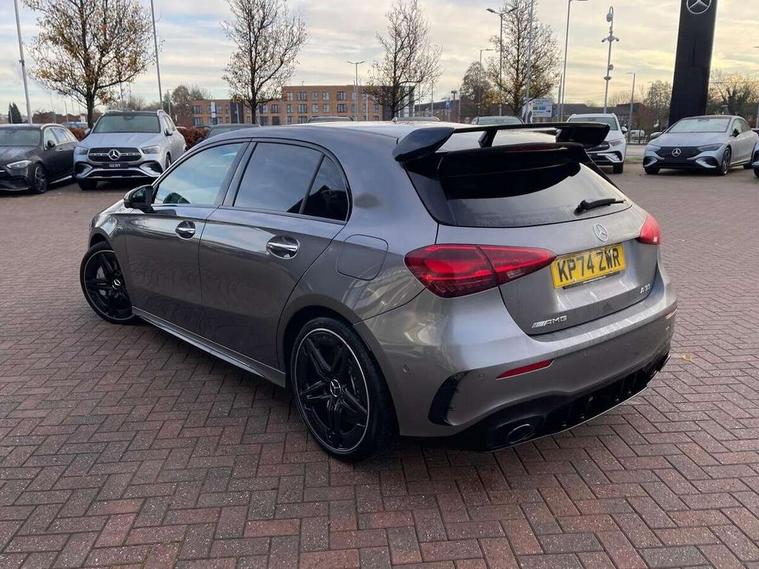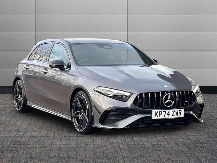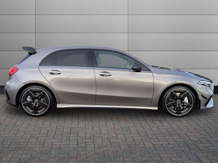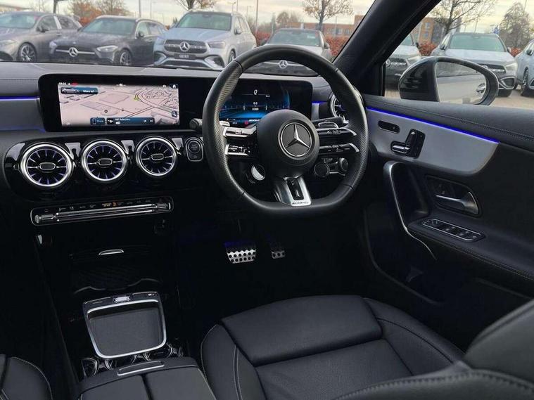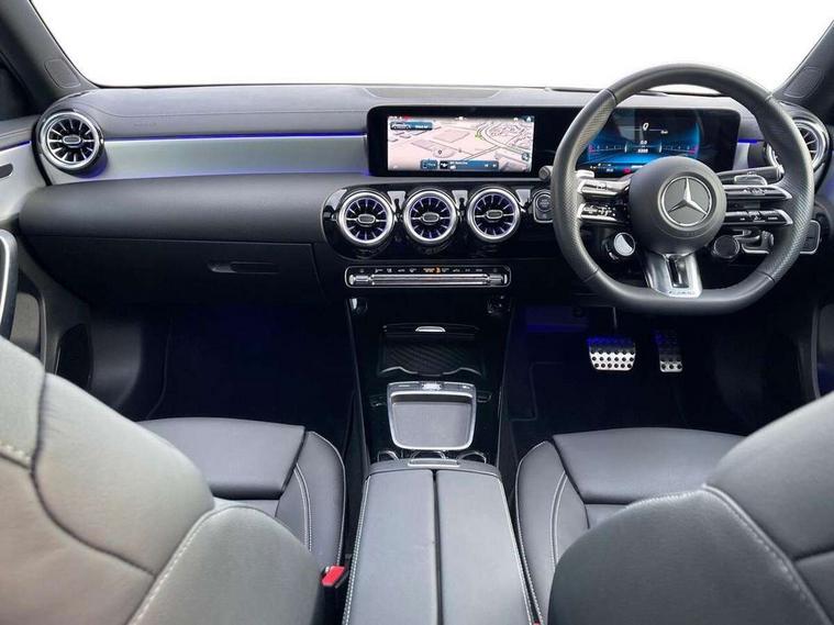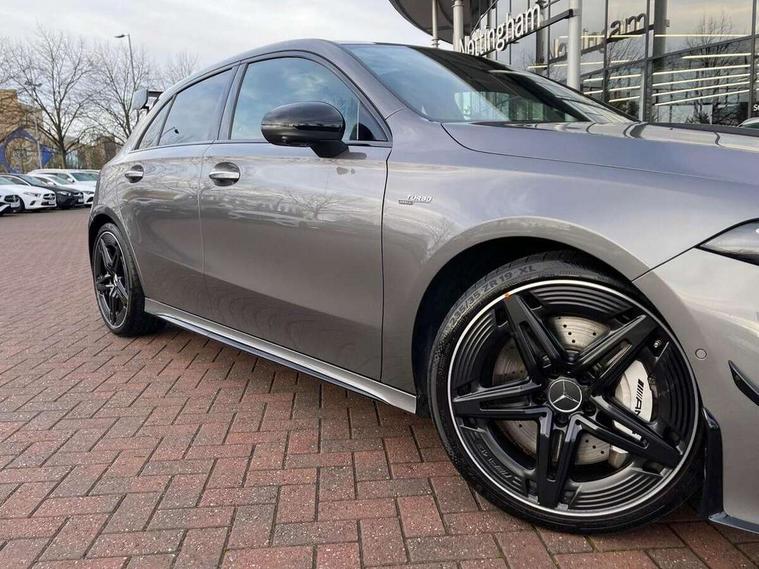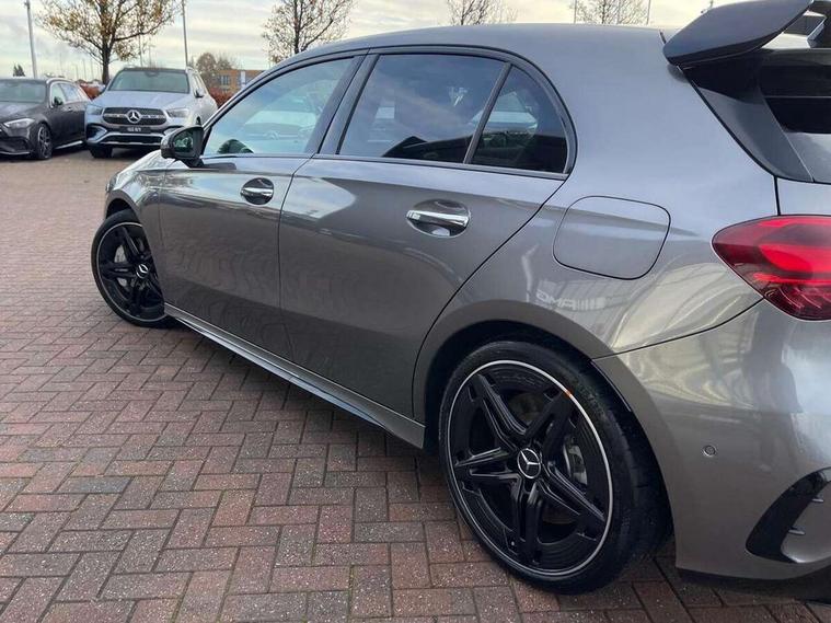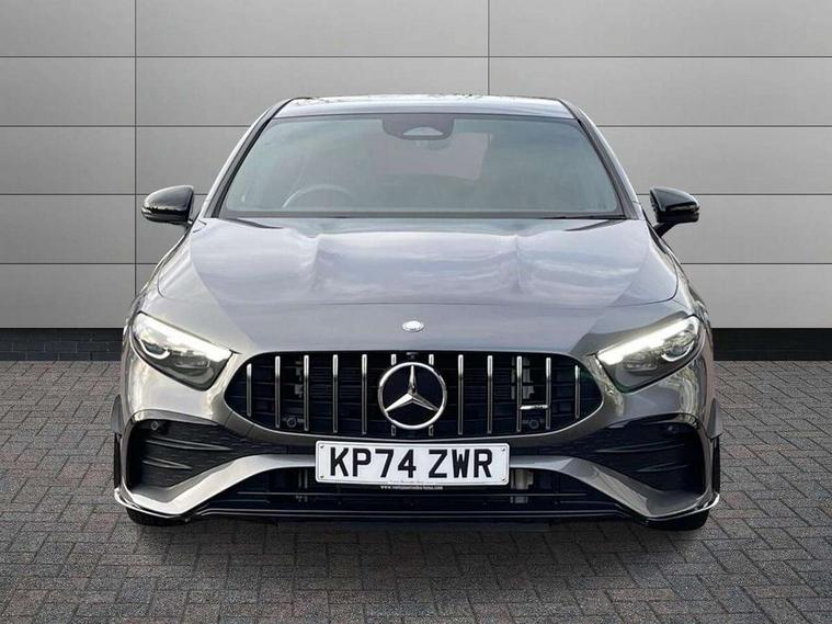 10.25 inch touchscreen central media display, 10.25" Digital instrument cluster display screen, Attention assist, Brake pad wear indicator warning light, Car wash mode, Direct steering, Direction indicators with lane change function, Dual bluetooth interfaces, DYNAMIC SELECT with driving programs (Slippery, Comfort, Sport, Sport+ and Individual), Easy pack tailgate hands-free access, ECO start/stop function, Engine start/stop button, Fingerprint scanner, Fluid level warning indicator for fuel, oil, coolant and washer fluid, Fluorescent jacket for driver, Hard-disk navigation, Head up Display, Hey Mercedes Voice activation, Lamp failure indicator, MBUX augmented reality for navigation, MBUX Interior assistant, Mercedes me connect including emergency call system, accident recovery, breakdown and maintenance management, Mercedes me remote services, Outside temperature gauge, Owners manual in English, Pre-installation of private car share, Preinstallation for Mercedes Benz link, Remote boot closing, Service indicator (ASSYST), Smartphone integration with Apple CarPlay and Android auto, Speed sensitive power steering, Tailgate, Traffic sign assist, Trip computer in multifunction display with current consumption indicator, Wireless charging, AMG suspension, Suspension with adaptive damping system, DAB Digital radio, MBUX multimedia system, Mercedes Benz advanced sound system (225 W) with 10 speakers, 1 central speaker, speakers on doors, a tweeter on door, one sub woofer + boost amplifier, 4 Electric Front and Rear windows, Adaptive brake lights, AMG body styling - AMG front apron with front splitter and AMG rear apron and visible exhaust tailpipe trim elements, AMG Front apron with flics as air deflector elements on the outer air intakes, AMG radiator grille with twin blade lamella and AMG Lettering, AMG Rear apron with specific diffuser look with four vertical fins and two round chrome plated tailpipe trim elements with a diameter of 90 mm, AMG spoiler lip on roof, Beltline strips in High gloss Black, Body colour bumpers, Body colour door handles with chrome inserts, Body colour side skirt, Electric adjustable and heated door mirrors with integrated LED side indicators, Front splitter and trim elements on the louvres in the outer air inlets, Front wings wheel arches with TURBO 4MATIC lettering, Headlamp assist automatic headlamp activation, Heat insulating dark tinted rear and rear side windows, Heated glass rear windscreen + timer control, LED daytime running lights, LED High level third brake light, LED tail lamp, Multibeam LED headlamps with adaptive highbeam assist and cornering function, Panoramic sliding sunroof, Privacy glass, Radio aerial, Rain sensing windscreen wipers with two sensitivity settings, Rear fog lights, Rear side wing doors, Rear windscreen wiper, Surround lighting with logo projection, Wider wheel arches for AMG wheels, Window line trim strip in black, 3 seat bench in 2nd row, 40:20:40 split folding rear seats, Air conditioning - Two zone thermotronic luxury automatic climate control with display, AMG floor mats, AMG Performance steering wheel in nappa leather, Automatic child seat recognition sensor, Black air vents with surround in silver chrome, Black roof lining, Brushed stainless steel sports pedals with rubber studs, Electrically adjustable front memory seats including lumbar support and backrest inclination, Front centre armrest with stowage, Front seat backs luggage nets, Height/reach adjustable steering column, Illuminated AMG front door sills with changeable cover, Interior lighting - 64 colour Ambient lighting, Interior mirror with reading lamps in black and frameless, Rear armrest with 2 cupholders, Seat occupancy sensor for front passenger seat, Silver coloured aluminium gear shift paddles on steering wheel, Single front passenger seat, Sports seats with integrated headrests, Stowage compartment in centre console with retractable cover, Sunvisors with illuminated vanity mirrors, Twin front cupholders, Aerodynamic pack - A Class, AMG night pack - A Class, Light and sight package - A Class, Mirror package - A Class, Parking pack with 360 degree camera - A Class, Seat comfort pack - A Class, USB pack plus - A Class, Winter pack - A Class, 3 rear 3 point seatbelts, ABS with Brake Assist, Active bonnet, Adaptive brake assist with hold function and hill start assist, Black seatbelts, Bonnet with power domes, Childproof locks manually operated for rear doors and electrically operated for rear power windows, Crash responsive emergency lighting, Driver and passenger head and side airbags, Drivers knee airbag, Dual stage driver/passenger airbags, Electronic parking brake, ESP curve dynamic assist, ESP with ASR, Exit warning, Front and rear seatbelt reminder, Front brake calipers with AMG lettering, ISOFIX and top tether child seat fixing points in two outer rear seats, Tyre pressure monitoring system, Warning triangle and first aid kit, Window airbags, Alarm system/interior protection/immobiliser, Guard 360 degree vehicle protection, Keyless entry lock/unlock, Keyless Go, Remote central locking and crash sensor with emergency opening function, Light longitudinal grain aluminium trim, 19" AMG 5 twin spoke light alloy wheels aerodynamically optimised painted in matt black with high sheen rim flange, Summer tyres, Tirefit sealant kit,