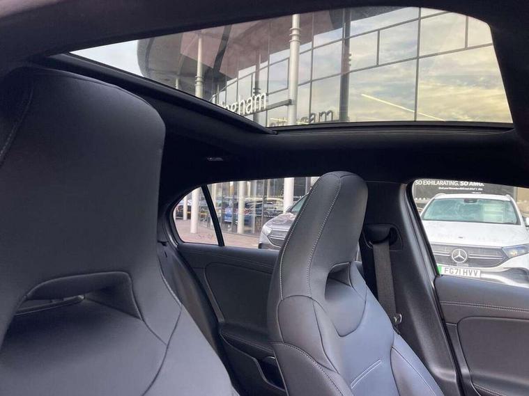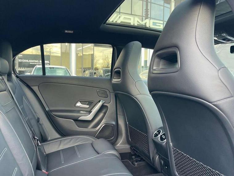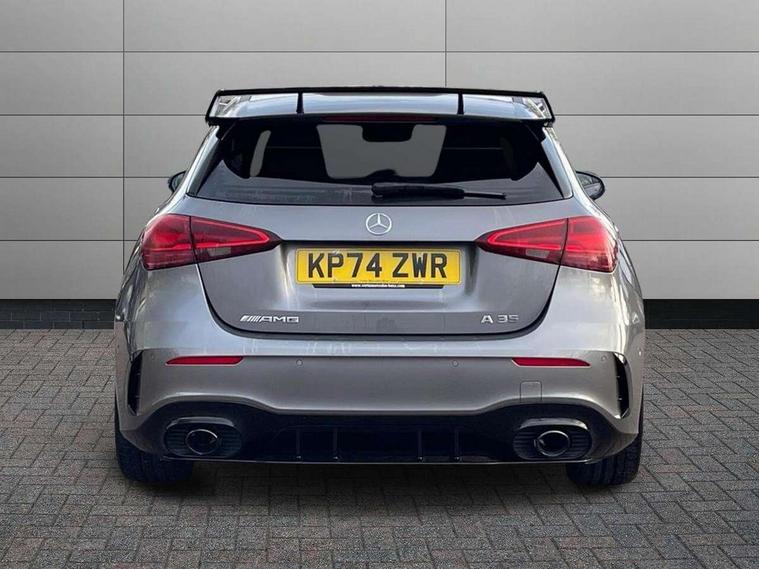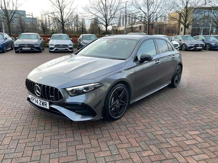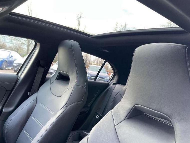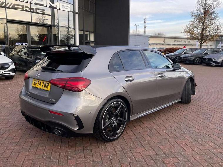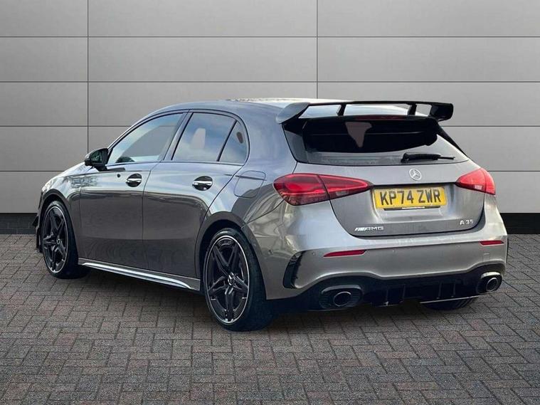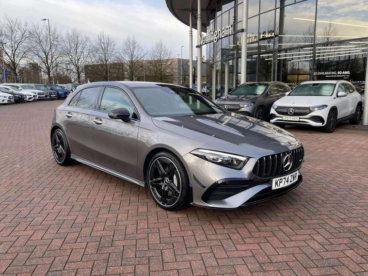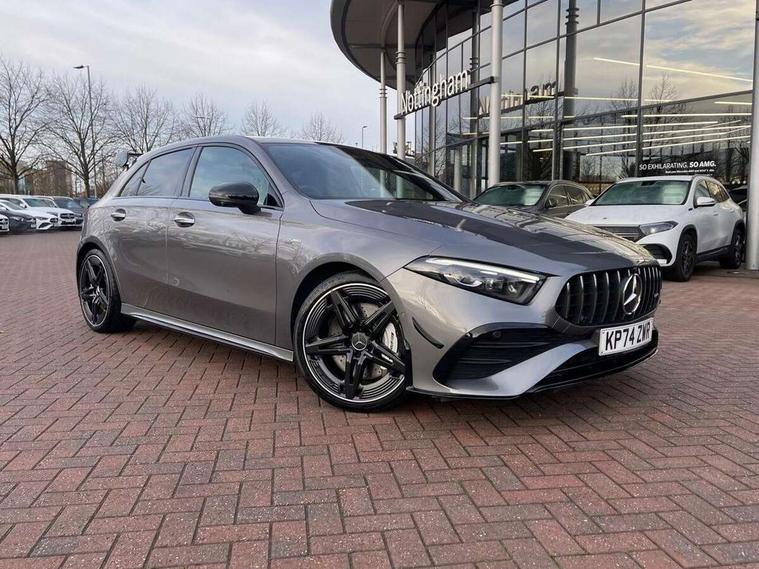 10.25 inch touchscreen central media display, 10.25" Digital instrument cluster display screen, Attention assist, Brake pad wear indicator warning light, Car wash mode, Direct steering, Direction indicators with lane change function, Dual bluetooth interfaces, DYNAMIC SELECT with driving programs (Slippery, Comfort, Sport, Sport+ and Individual), Easy pack tailgate hands-free access, ECO start/stop function, Engine start/stop button, Fingerprint scanner, Fluid level warning indicator for fuel, oil, coolant and washer fluid, Fluorescent jacket for driver, Hard-disk navigation, Head up Display, Hey Mercedes Voice activation, Lamp failure indicator, MBUX augmented reality for navigation, MBUX Interior assistant, Mercedes me connect including emergency call system, accident recovery, breakdown and maintenance management, Mercedes me remote services, Outside temperature gauge, Owners manual in English, Pre-installation of private car share, Preinstallation for Mercedes Benz link, Remote boot closing, Service indicator (ASSYST), Smartphone integration with Apple CarPlay and Android auto, Speed sensitive power steering, Tailgate, Traffic sign assist, Trip computer in multifunction display with current consumption indicator, Wireless charging, AMG suspension, Suspension with adaptive damping system, DAB Digital radio, MBUX multimedia system, Mercedes Benz advanced sound system (225 W) with 10 speakers, 1 central speaker, speakers on doors, a tweeter on door, one sub woofer + boost amplifier, 4 Electric Front and Rear windows, Adaptive brake lights, AMG body styling - AMG front apron with front splitter and AMG rear apron and visible exhaust tailpipe trim elements, AMG Front apron with flics as air deflector elements on the outer air intakes, AMG radiator grille with twin blade lamella and AMG Lettering, AMG Rear apron with specific diffuser look with four vertical fins and two round chrome plated tailpipe trim elements with a diameter of 90 mm, AMG spoiler lip on roof, Beltline strips in High gloss Black, Body colour bumpers, Body colour door handles with chrome inserts, Body colour side skirt, Electric adjustable and heated door mirrors with integrated LED side indicators, Front splitter and trim elements on the louvres in the outer air inlets, Front wings wheel arches with TURBO 4MATIC lettering, Headlamp assist automatic headlamp activation, Heat insulating dark tinted rear and rear side windows, Heated glass rear windscreen + timer control, LED daytime running lights, LED High level third brake light, LED tail lamp, Multibeam LED headlamps with adaptive highbeam assist and cornering function, Panoramic sliding sunroof, Privacy glass, Radio aerial, Rain sensing windscreen wipers with two sensitivity settings, Rear fog lights, Rear side wing doors, Rear windscreen wiper, Surround lighting with logo projection, Wider wheel arches for AMG wheels, Window line trim strip in black, 3 seat bench in 2nd row, 40:20:40 split folding rear seats, Air conditioning - Two zone thermotronic luxury automatic climate control with display, AMG floor mats, AMG Performance steering wheel in nappa leather, Automatic child seat recognition sensor, Black air vents with surround in silver chrome, Black roof lining, Brushed stainless steel sports pedals with rubber studs, Electrically adjustable front memory seats including lumbar support and backrest inclination, Front centre armrest with stowage, Front seat backs luggage nets, Height/reach adjustable steering column, Illuminated AMG front door sills with changeable cover, Interior lighting - 64 colour Ambient lighting, Interior mirror with reading lamps in black and frameless, Rear armrest with 2 cupholders, Seat occupancy sensor for front passenger seat, Silver coloured aluminium gear shift paddles on steering wheel, Single front passenger seat, Sports seats with integrated headrests, Stowage compartment in centre console with retractable cover, Sunvisors with illuminated vanity mirrors, Twin front cupholders, Aerodynamic pack - A Class, AMG night pack - A Class, Light and sight package - A Class, Mirror package - A Class, Parking pack with 360 degree camera - A Class, Seat comfort pack - A Class, USB pack plus - A Class, Winter pack - A Class, 3 rear 3 point seatbelts, ABS with Brake Assist, Active bonnet, Adaptive brake assist with hold function and hill start assist, Black seatbelts, Bonnet with power domes, Childproof locks manually operated for rear doors and electrically operated for rear power windows, Crash responsive emergency lighting, Driver and passenger head and side airbags, Drivers knee airbag, Dual stage driver/passenger airbags, Electronic parking brake, ESP curve dynamic assist, ESP with ASR, Exit warning, Front and rear seatbelt reminder, Front brake calipers with AMG lettering, ISOFIX and top tether child seat fixing points in two outer rear seats, Tyre pressure monitoring system, Warning triangle and first aid kit, Window airbags, Alarm system/interior protection/immobiliser, Guard 360 degree vehicle protection, Keyless entry lock/unlock, Keyless Go, Remote central locking and crash sensor with emergency opening function, Light longitudinal grain aluminium trim, 19" AMG 5 twin spoke light alloy wheels aerodynamically optimised painted in matt black with high sheen rim flange, Summer tyres, Tirefit sealant kit,