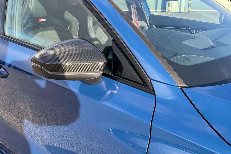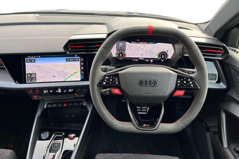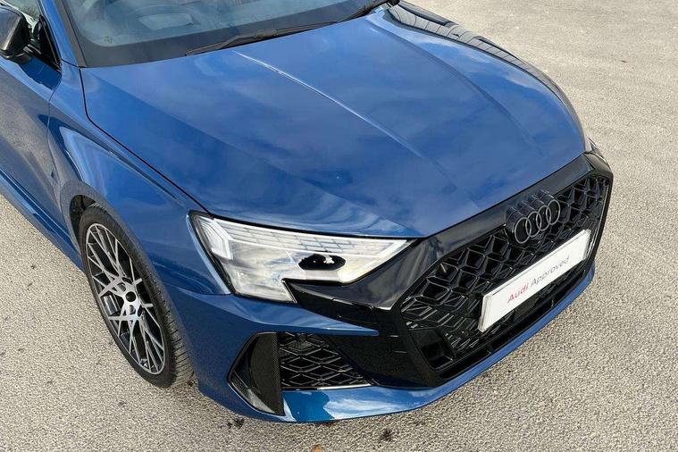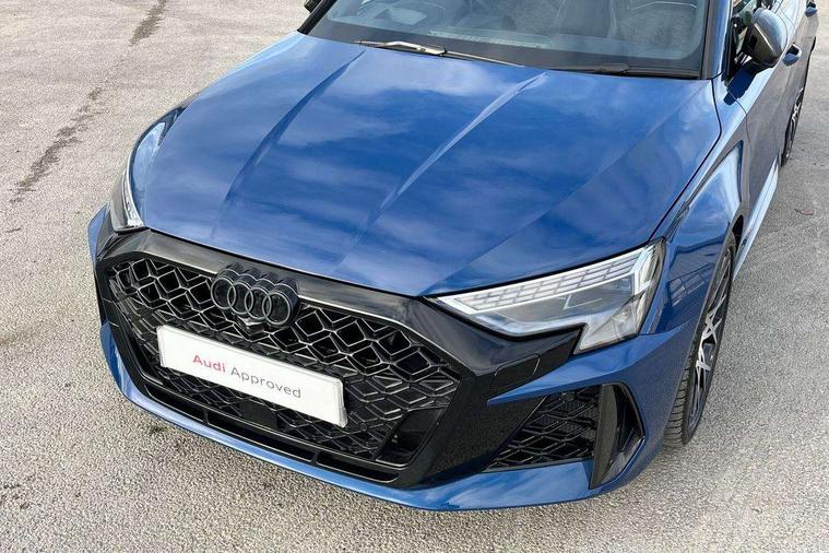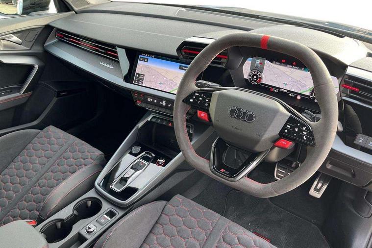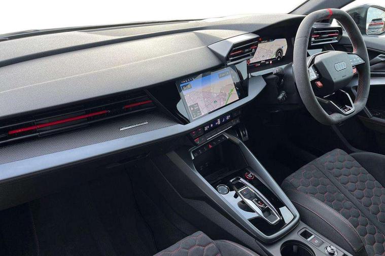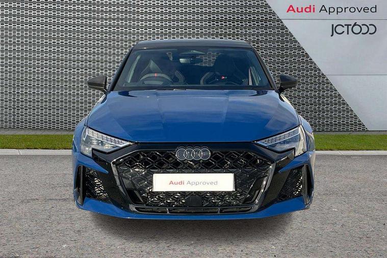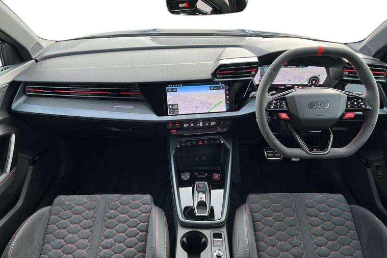 Adjustable speed limiter, Audi drive select comfort, auto, dynamic and efficiency, Audi virtual cockpit plus with RS specific design and 12.3" display with additional graphic display options, Automatic start/stop system with recuperation, Bluetooth interface, Camera based traffic sign recognition, Collision avoidance assistant, Driver attention and fatigue detection, e-Call (emergency call), MMI Navigation Plus with high resolution 10.1" colour touch screen display, Progressive steering, RS specific driving modes - RS Individual, RS Performance and RS Torque rear, Service indicator, Smartphone interface with app store includes wireless Apple carplay, Android auto and Amazon alexa integration, Trip computer, Voice control system with natural language interaction, Adaptive suspension, Increase of top speed to 174 mph, Quattro permanent four wheel drive, Audi Phonebox light with wireless charging, DAB Digital radio, USB ports with charging function in the rear, Audi beam LED projection of RS logo on ground as you exit, Auto dimming frameless rear view mirror, Carbon door mirror housings, Electrically adjustable/heated/folding/auto dimming door mirrors with integrated LED indications + kerb view function for passenger side, Engine compartment cover with carbon trim, Exterior model badging, Front electric windows, Heat insulating glass windscreen, LED 3rd brake light, Light and rain sensors, Privacy glass - dark tinted rear window, rear door and side windows, Rear electric windows, Rear side wing doors, Rear wiper, Roof edge spoiler in carbon, RS sport exhaust system - dual branch with flap control and gloss black oval tailpipe trims, 12V socket and storage compartment in front centre console, 3 seat bench in 2nd row, 3 Spoke flat top and bottomed black leather multi function steering and gear shift paddles, 3-zone deluxe automatic air conditioning, 40/20/40 split folding rear seat bench, Black cloth headlining, Black front and rear floor mats, Front and rear headrests, Front centre armrest, Front door sill trims with RS 3 logo, Heated front seats, Height and reach adjustable steering wheel, Manual boot compartment lid, Rear centre armrest with cupholder, Seat side bolsters, Single front passenger seat, Stainless steel pedals and front footrest in black, Vanadium look - Interior door handles, Door trim, power latching, Air vents, window controls, mirror adjust, rear door lock, Selector lever in centre console, Black Styling plus package - RS3, Extended ambient lighting package Pro with Multi-coloured contour lighting of instrument panel - RS3, RS exterior features pack in carbon and gloss black - RS3, Storage package - RS3 Sportback, 3x3 point rear seat belts, Driver and front passenger airbag with passenger airbag deactivation, Electronic Stabilisation Control (ESC) including ABS, ASR and EDL, First aid kit with warning triangle and 2 safety vests, Hill hold assist, Pre-sense front with pedestrian and cyclist detection, Seatbelt monitoring, Tyre pressure loss indicator, Anti theft alarm, Anti-theft wheel bolts, Electronically operated child locks, Immobiliser, Black dashboard, Inlays in carbon atlas structure, Tyre repair kit,
