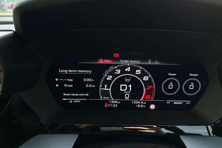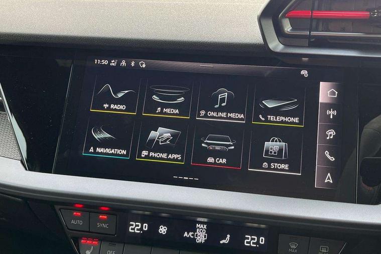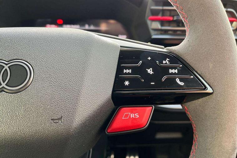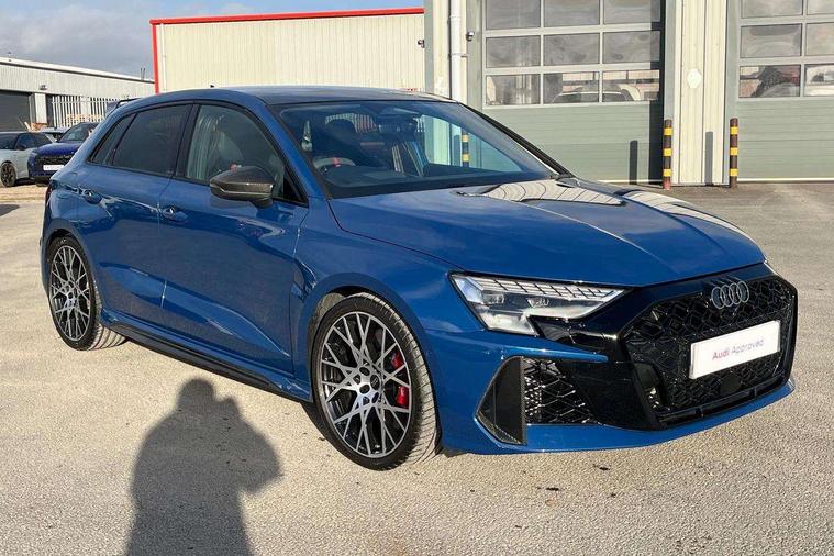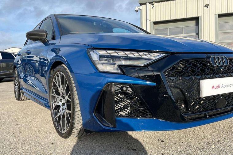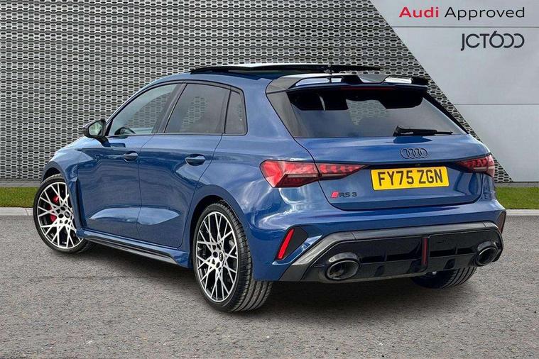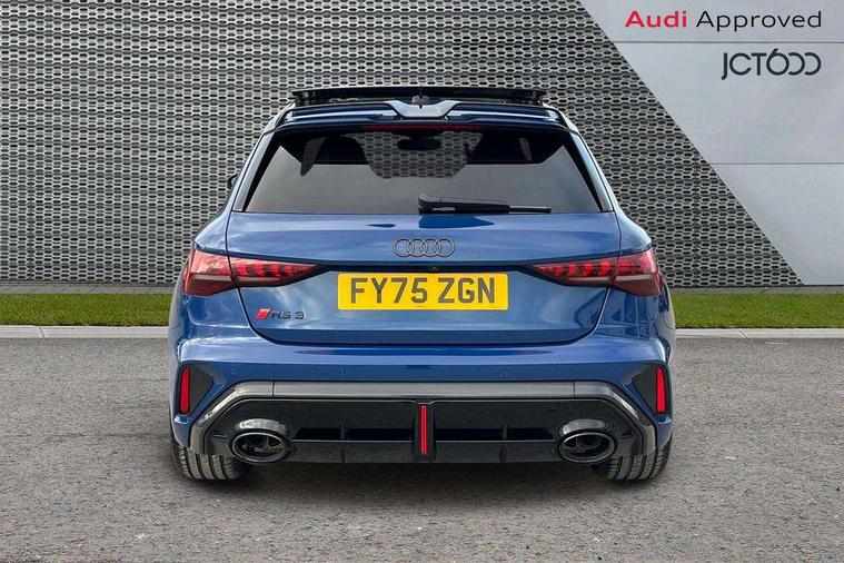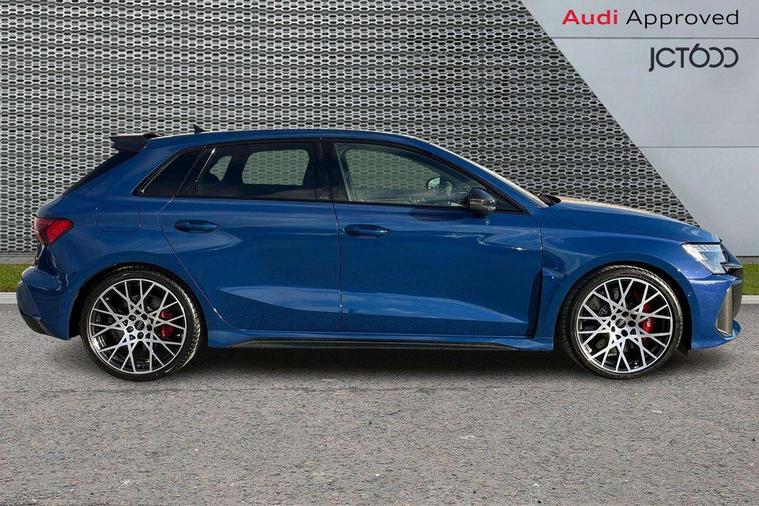 Adjustable speed limiter, Audi drive select comfort, auto, dynamic and efficiency, Audi virtual cockpit plus with RS specific design and 12.3" display with additional graphic display options, Automatic start/stop system with recuperation, Bluetooth interface, Camera based traffic sign recognition, Collision avoidance assistant, Driver attention and fatigue detection, e-Call (emergency call), MMI Navigation Plus with high resolution 10.1" colour touch screen display, Progressive steering, RS specific driving modes - RS Individual, RS Performance and RS Torque rear, Service indicator, Smartphone interface with app store includes wireless Apple carplay, Android auto and Amazon alexa integration, Trip computer, Voice control system with natural language interaction, Adaptive suspension, Increase of top speed to 174 mph, Quattro permanent four wheel drive, Audi Phonebox light with wireless charging, DAB Digital radio, USB ports with charging function in the rear, Audi beam LED projection of RS logo on ground as you exit, Auto dimming frameless rear view mirror, Carbon door mirror housings, Electrically adjustable/heated/folding/auto dimming door mirrors with integrated LED indications + kerb view function for passenger side, Engine compartment cover with carbon trim, Exterior model badging, Front electric windows, Heat insulating glass windscreen, LED 3rd brake light, Light and rain sensors, Privacy glass - dark tinted rear window, rear door and side windows, Rear electric windows, Rear side wing doors, Rear wiper, Roof edge spoiler in carbon, RS sport exhaust system - dual branch with flap control and gloss black oval tailpipe trims, 12V socket and storage compartment in front centre console, 3 seat bench in 2nd row, 3 Spoke flat top and bottomed black leather multi function steering and gear shift paddles, 3-zone deluxe automatic air conditioning, 40/20/40 split folding rear seat bench, Black cloth headlining, Black front and rear floor mats, Front and rear headrests, Front centre armrest, Front door sill trims with RS 3 logo, Heated front seats, Height and reach adjustable steering wheel, Manual boot compartment lid, Rear centre armrest with cupholder, Seat side bolsters, Single front passenger seat, Stainless steel pedals and front footrest in black, Vanadium look - Interior door handles, Door trim, power latching, Air vents, window controls, mirror adjust, rear door lock, Selector lever in centre console, Black Styling plus package - RS3, Extended ambient lighting package Pro with Multi-coloured contour lighting of instrument panel - RS3, RS exterior features pack in carbon and gloss black - RS3, Storage package - RS3 Sportback, 3x3 point rear seat belts, Driver and front passenger airbag with passenger airbag deactivation, Electronic Stabilisation Control (ESC) including ABS, ASR and EDL, First aid kit with warning triangle and 2 safety vests, Hill hold assist, Pre-sense front with pedestrian and cyclist detection, Seatbelt monitoring, Tyre pressure loss indicator, Anti theft alarm, Anti-theft wheel bolts, Electronically operated child locks, Immobiliser, Black dashboard, Inlays in carbon atlas structure, Tyre repair kit,