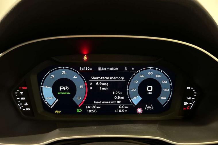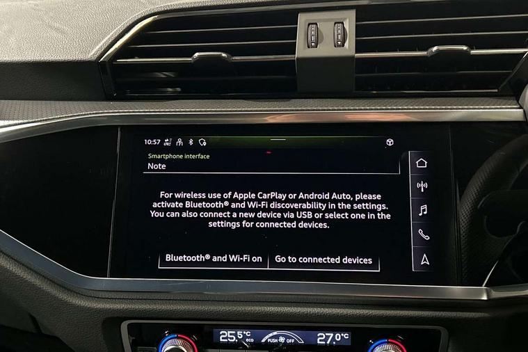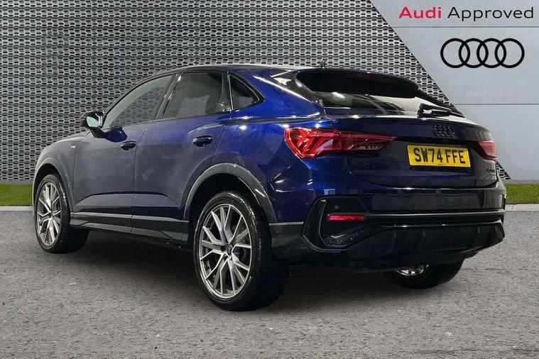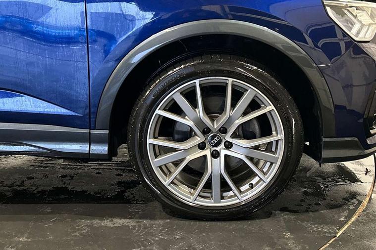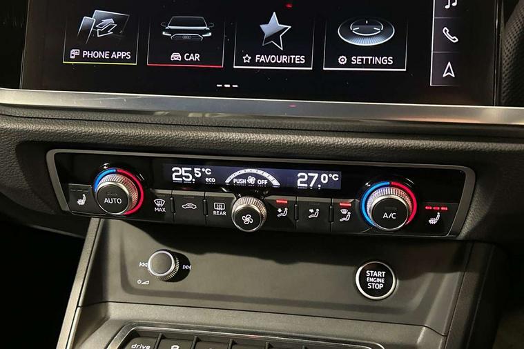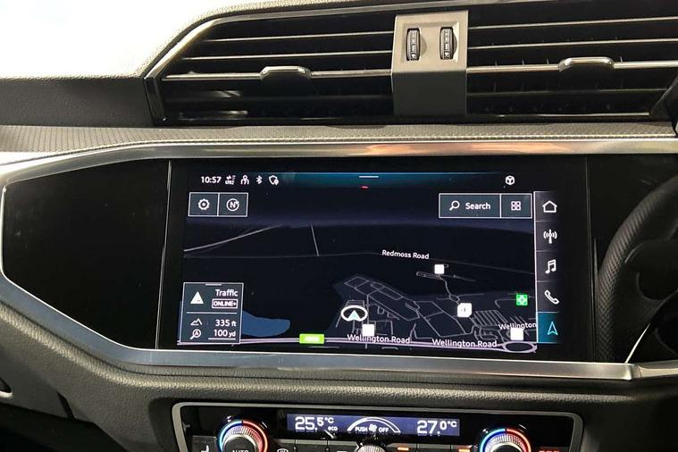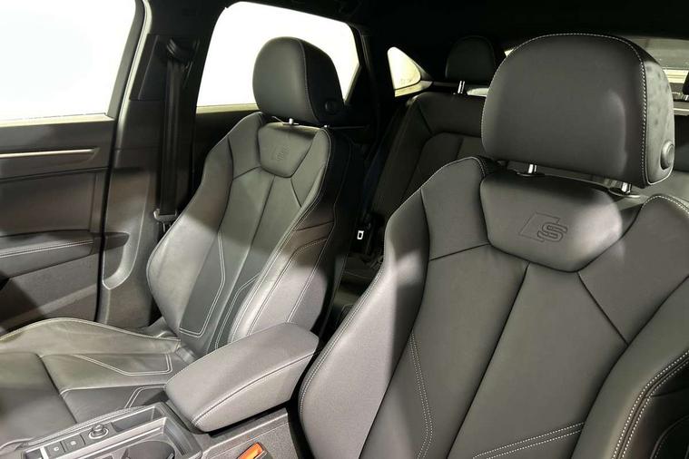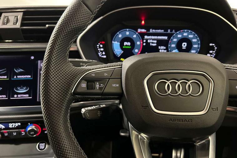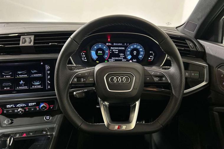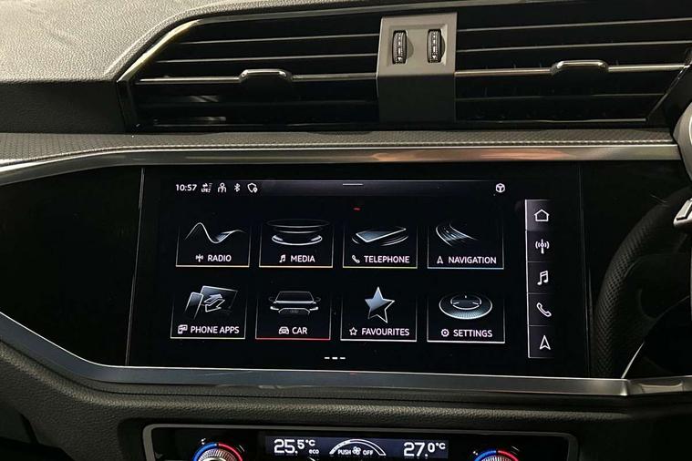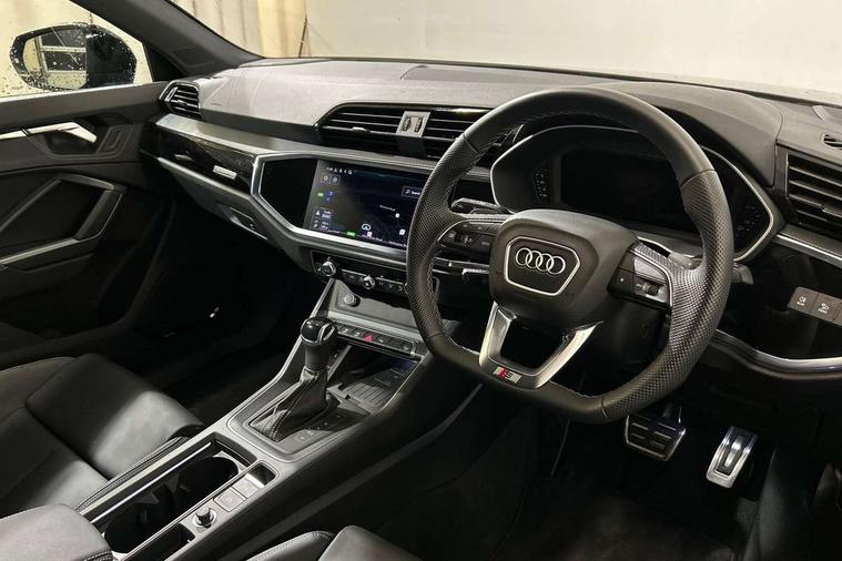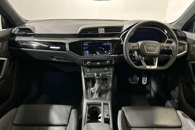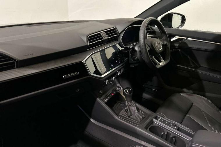 Audi connect safety and service, Audi drive select, Audi lane departure warning, Audi Virtual Cockpit - 10.25" display, Bluetooth interface, Camera based traffic sign recognition, Distraction and Fatigue warning, Legal emergency call, MMI Navigation Plus with high resolution 10.1 inch touchscreen colour display, Power operated tailgate, Progressive steering, Service interval indicator, Smartphone interface includes wireless Apple carplay/Android Auto, Start stop system with recuperation, Voice control system with natural language interaction, Diesel particulate filter, Sports suspension, 2 USB-C ports with charge and data functions, 6 passive loudspeakers, DAB digital radio module, Acoustic windscreen, Audi Beam uses LEDs to project the Audi logo onto the ground as you exit your Q3, Auto dimming door mirrors, Auto dimming frameless rear view mirror, Diffuser grille in grained matt black, Diffuser trim in selenite silver, Electrically folding, adjustable and heated door mirrors with integrated LED side indicators and kerb view function for passenger side, Front and rear electric windows, Front fog lights, Front underbody protection in manhattan grey paint finish, High gloss black finish B and C pillars, LED Dynamic rear indicators, LED headlights with LED daytime running lights, LED rear lights, LED third brake light, Privacy glass dark tinted rear and rear-side windows (from B-pillar backwards), Rain and light sensors, Rear side wing doors, Rear underbody protection in matt black, Rear wiper, S line front and rear bumpers and side skirts in contrasting Manhattan grey paint finish, Variable front intermittent wipers, 12V socket in rear centre console, 3 seat bench in 2nd row, 40:20:40 folding with manual adjustment for 60:40 forwards/backwards position and backrest angle, Adjustable rear seat bench/backrest with centre armrest and cupholder, Black cloth headlining, Dual zone electronic climate control, Electric lumbar support, Front and rear black floor mats with contrast stitching, Front and rear headrests, Front centre armrest, Height and reach adjustable steering wheel, Illuminated door sill trims with S logo, ISOFIX child seat mounting for front passenger with airbag deactivation and outer rear seat including top tether attachment point for outer rear seats, Luggage compartment sill protection in stainless steel, Manual front seats with height adjustment, Perforated leather gearknob, Single front passenger seat, Stainless steel pedals, Twin leather upholstery with front sport seats + S embossing, Black styling pack - Q3, Non smoking pack - Q3, 3x3 point rear seatbelts, 6 airbags - Driver, front passenger, curtain and side windows, Audi pre-sense front with pedestrain and cyclist recognition, Electrically operated child locks on rear doors, Electromechanical parking brake, Electronic stabilisation control including ABS, ASR and EDL, Front seatbelt reminder, Hill descent control, Hill hold assist, Pre sense basic, Seatbelt monitoring, Tyre pressure warning, Warning triangle and first aid kit, Anti theft alarm, Anti theft wheel bolts, Immobiliser, Remote central locking, Aluminium look interior elements, Detail dashboard around MMI touch colour display in glass look, black with surround in aluminium look, Leatherette door armrest, Piano black inlay,