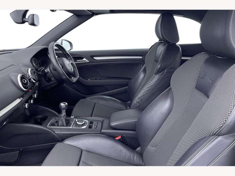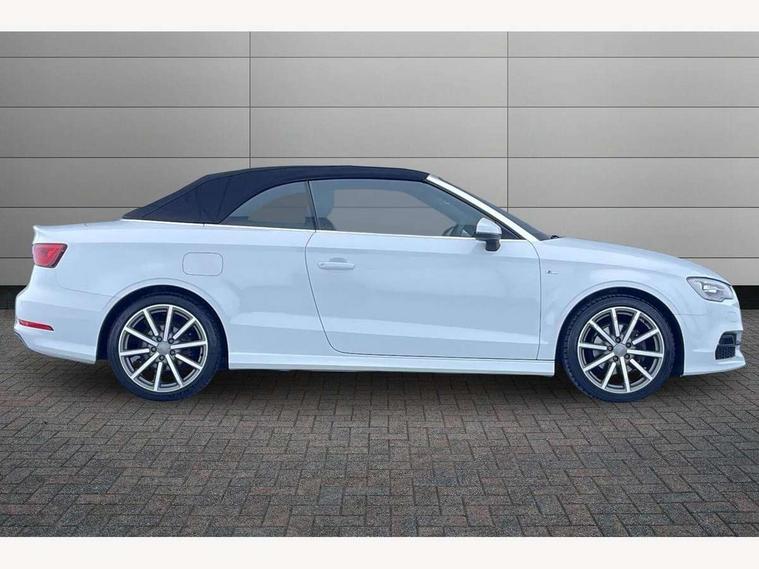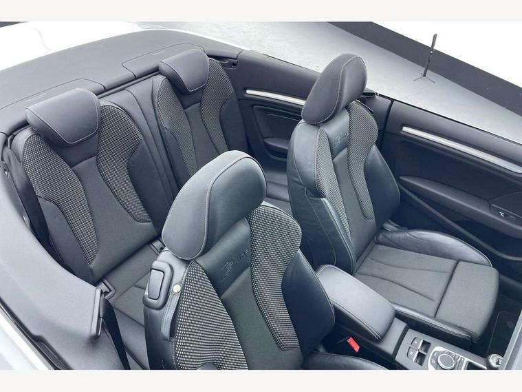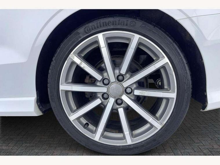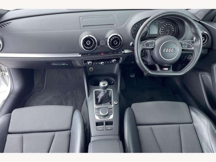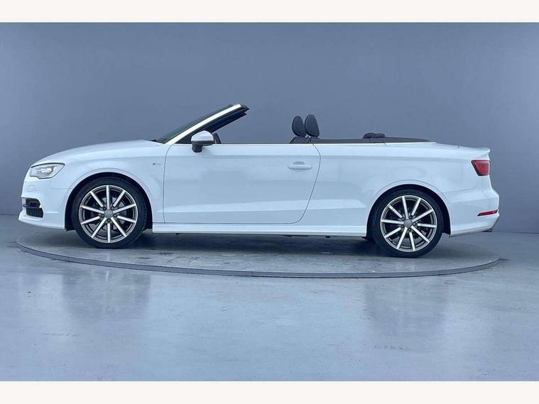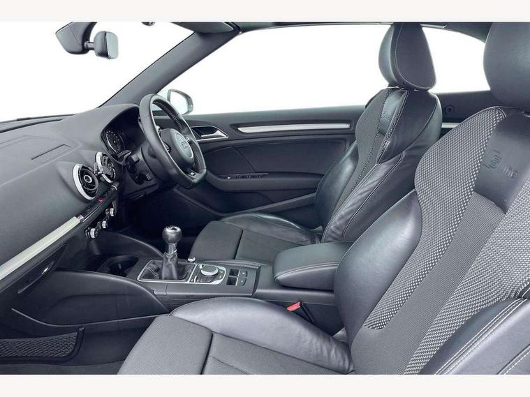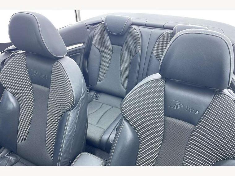 Colour driver's information system display, Fatigue detection system, Low washer fluid indicator, Service interval indicator, Voice control system, Audi music interface, DAB Digital radio, Speed dependent audio volume control, Adaptive brake lights, Aluminium side window trim, Body colour bumpers, Body colour door mirrors with integral indicators, Chrome exhaust tailpipes, Electric front+rear windows, Front fog lights, Fully automatic acoustic hood, Headlight washers, Heated rear window, Heated windscreen washer jets, High gloss black fog light surround, High gloss black front grille, LED daytime running lights, S Line body styling, Twin exhaust tailpipe, 2 height adjustable rear headrests, 3 spoke flat bottomed S Line multifunction steering wheel, 4 lashing points to secure luggage, 50/50 split folding rear seat, Adjustable front armrest, Aluminium door sill trims, Black cloth headlining, Door sill trims with S line logo, Driver/passenger sunvisors, Drivers underseat storage, Dual zone electronic climate control, Front and rear interior lights with delay, Front/rear floor mats, Height adjustable front seats, Height/reach adjustable steering column, Illuminated glovebox, Illuminated vanity mirrors, ISOFIX child seat preparation+airbag deactivation, Perforated leather gearknob, Storage compartment in centre console, Storage compartments in doors, Light and rain sensor pack - A3 Cabriolet, Storage and luggage pack - A3 Cabriolet/ Saloon, 3 point seatbelts on all seats, ABS/EBD, Active bonnet, Active front headrests, ASR, Automatic roll over protection, Collision mitigation braking system, Driver and passenger side airbags, Driver/Front Passenger airbags, Drivers knee airbag, EDL, Electromechanical parking brake, ESC - Electronic Stability Control + traction control, Front passenger airbag deactivation, Seatbelt warning, Tyre pressure monitor, Warning triangle and first aid kit, Anti-theft wheel bolts, Folding key, Remote control central locking, Thatcham category 1 alarm + immobiliser, Aluminium air vent surrounds, Aluminium trim elements, Matt brushed aluminium inlays, Space saver spare wheel,