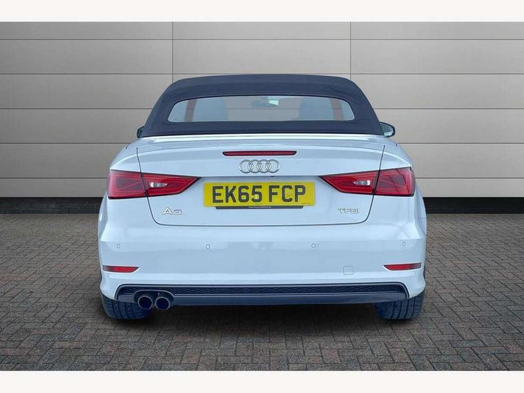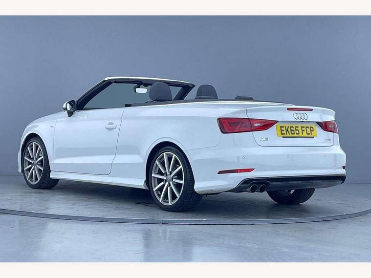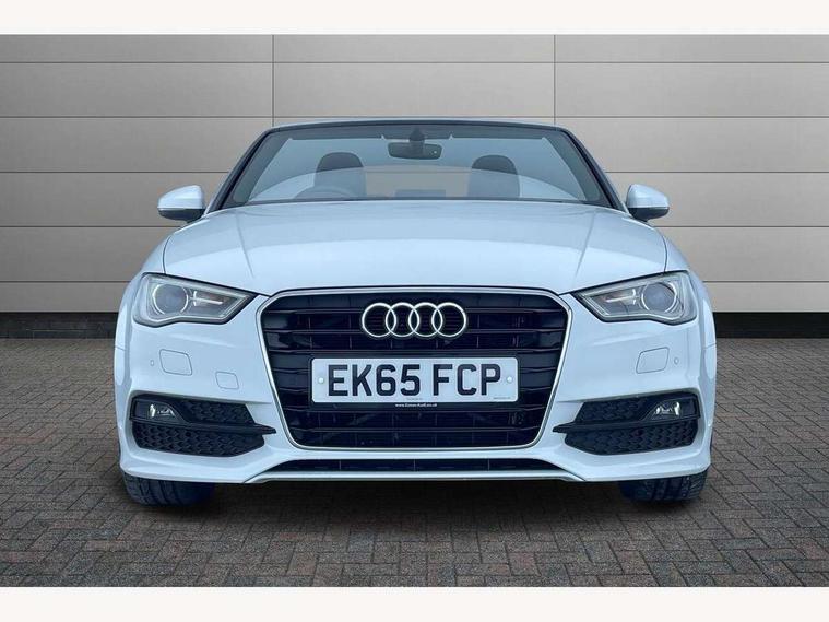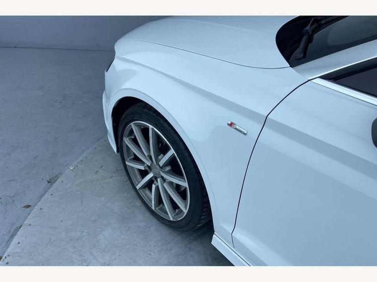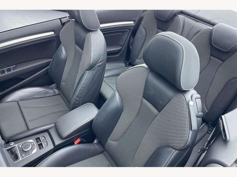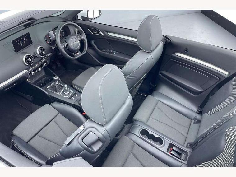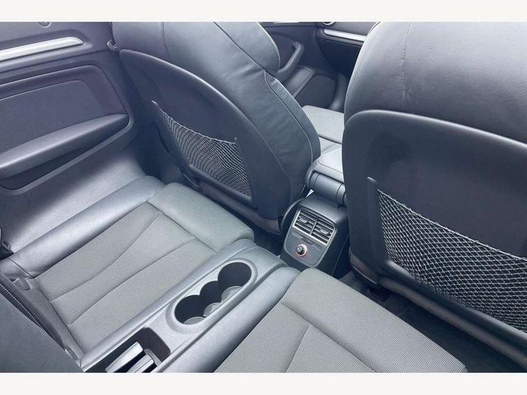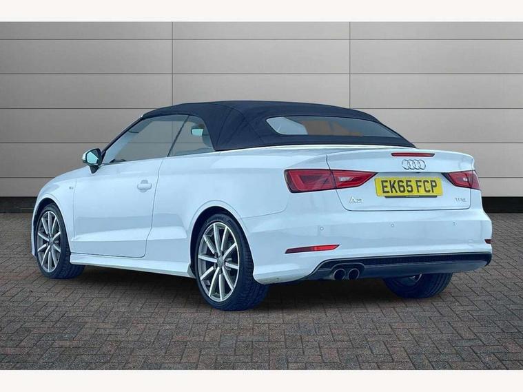 Colour driver's information system display, Fatigue detection system, Low washer fluid indicator, Service interval indicator, Voice control system, Audi music interface, DAB Digital radio, Speed dependent audio volume control, Adaptive brake lights, Aluminium side window trim, Body colour bumpers, Body colour door mirrors with integral indicators, Chrome exhaust tailpipes, Electric front+rear windows, Front fog lights, Fully automatic acoustic hood, Headlight washers, Heated rear window, Heated windscreen washer jets, High gloss black fog light surround, High gloss black front grille, LED daytime running lights, S Line body styling, Twin exhaust tailpipe, 2 height adjustable rear headrests, 3 spoke flat bottomed S Line multifunction steering wheel, 4 lashing points to secure luggage, 50/50 split folding rear seat, Adjustable front armrest, Aluminium door sill trims, Black cloth headlining, Door sill trims with S line logo, Driver/passenger sunvisors, Drivers underseat storage, Dual zone electronic climate control, Front and rear interior lights with delay, Front/rear floor mats, Height adjustable front seats, Height/reach adjustable steering column, Illuminated glovebox, Illuminated vanity mirrors, ISOFIX child seat preparation+airbag deactivation, Perforated leather gearknob, Storage compartment in centre console, Storage compartments in doors, Light and rain sensor pack - A3 Cabriolet, Storage and luggage pack - A3 Cabriolet/ Saloon, 3 point seatbelts on all seats, ABS/EBD, Active bonnet, Active front headrests, ASR, Automatic roll over protection, Collision mitigation braking system, Driver and passenger side airbags, Driver/Front Passenger airbags, Drivers knee airbag, EDL, Electromechanical parking brake, ESC - Electronic Stability Control + traction control, Front passenger airbag deactivation, Seatbelt warning, Tyre pressure monitor, Warning triangle and first aid kit, Anti-theft wheel bolts, Folding key, Remote control central locking, Thatcham category 1 alarm + immobiliser, Aluminium air vent surrounds, Aluminium trim elements, Matt brushed aluminium inlays, Space saver spare wheel,