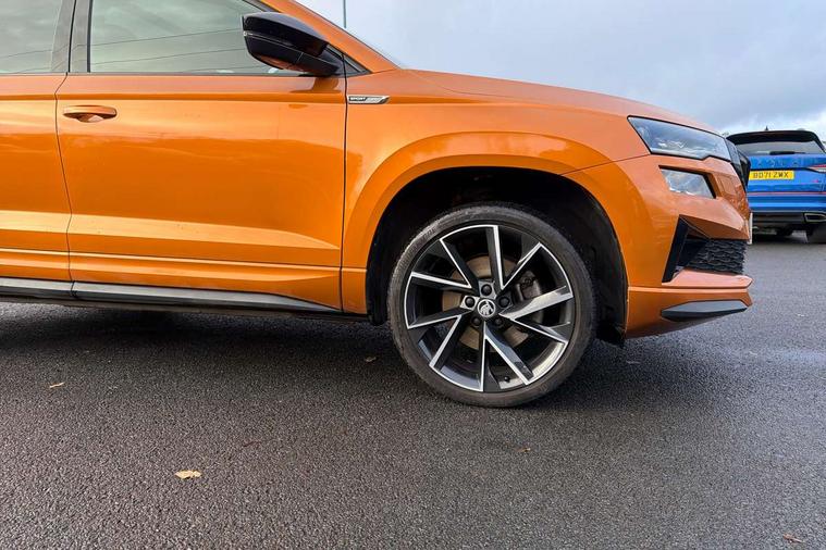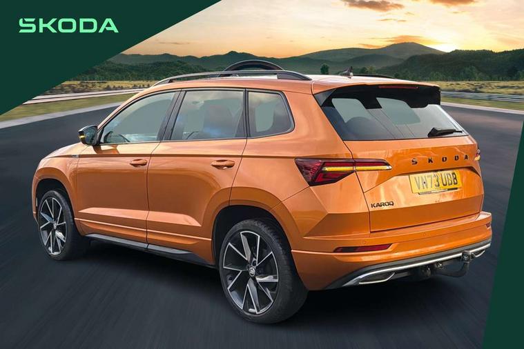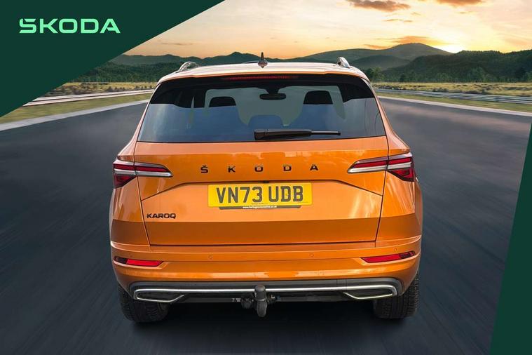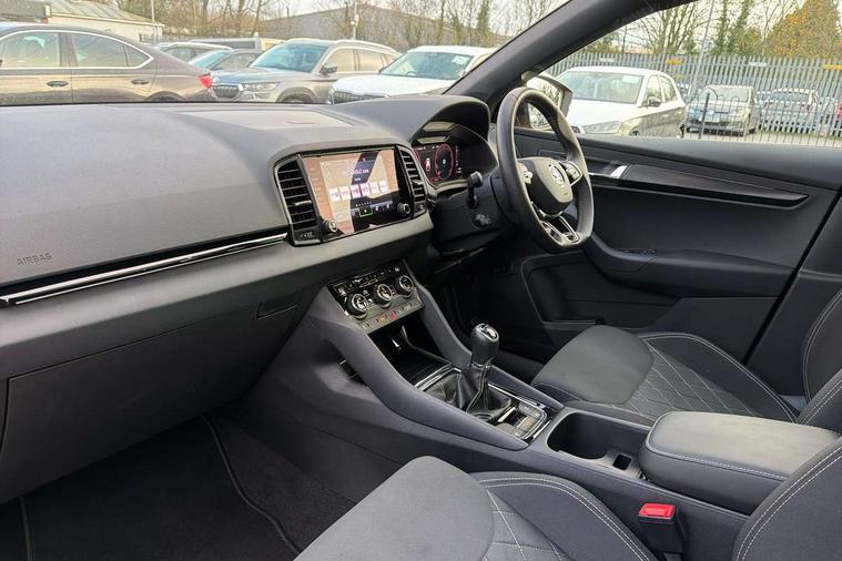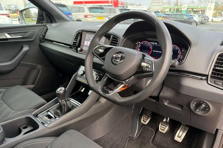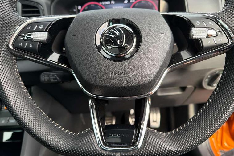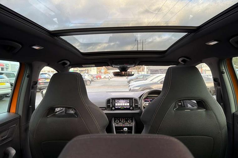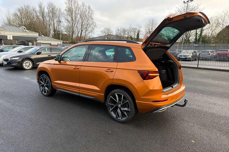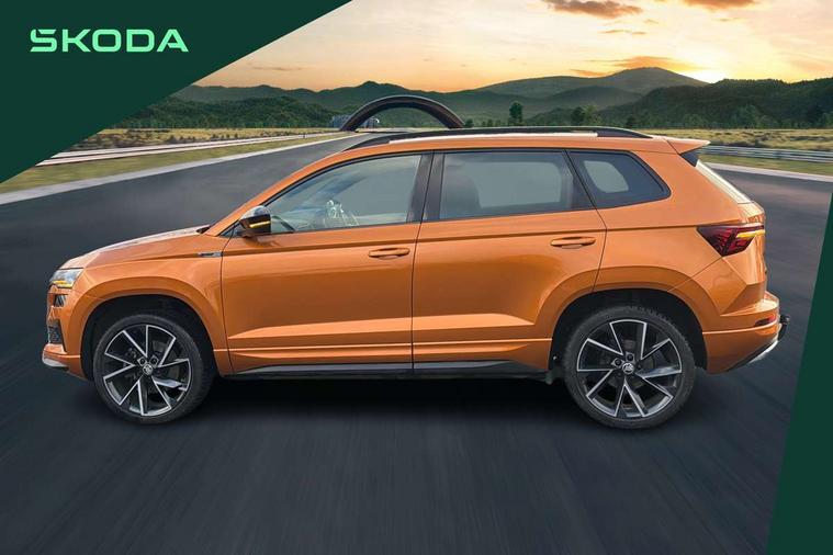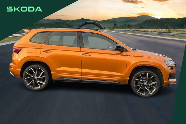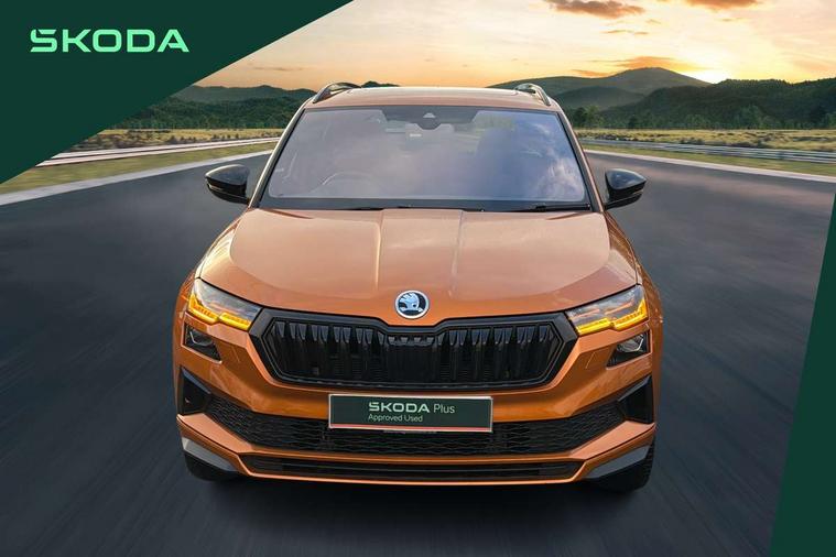 8" Digital display, Care connect, Driver fatigue sensor, Emergency services call system, Outside temperature gauge, Service interval indicator, SmartLink wireless for Apple and wired for Android, Start/stop system with regenerative braking, USB C Port x 2 in front centre console, Virtual cockpit, Virtual pedal with electrically operated boot door, 8 Speakers, DAB radio with Bluetooth, USB connection, Wireless charging without wireless aerial connection, Acoustic glass, Aero front windscreen wipers with intermittent function, Auto dimming rear view mirror with light and rain sensors, Black door mirrors, Black electric window control buttons, Black radiator grille, Black roof rails, Body colour door handles, Electric front and rear windows with child proof lock, Front door steps with SportLine logo, Heated rear windscreen, LED daytime running lights, LED rear lights with high functionality welcome effect and dynamic indicators, Light assistant (coming/leaving home/tunnel light), Panoramic sliding sunroof, Plastic scuff plates, Privacy glass, Protective door side sills in body colour, Rear diffuser, Rear side wing doors, Rear spoiler, Rear window wiper with washer system and intermittent control, Safety reflectors on front doors, Skoda lettering on tailgate in black, Sportline badge on front fender, Sportline decorative inserts with badging, Sports front and rear bumpers, 1.5 litre bottle holders in driver and front passenger door panels, 12V socket in boot, 12v socket in front centre armrest with storage compartment and rear air vents, 3 rear height adjustable headrests, 3 seat bench in 2nd row, 3 spoke leather sports multifunction steering wheel and silver stitching, 4 foldable roof handles with rear coat hooks, Black floor carpet, Black roof headlining, Chrome inner door handles, Double sided boot floor, Foldable hooks in the boot, Front head restraints, Height adjustable front three point seats belts with tensioners, Height/reach adjust steering wheel, Ice scraper, Illuminated glovebox, Illuminated luggage compartment, Isofix child seat preparation outer rear, Manual lumbar support for front seats, Pen holder, Pollen filter, Rear boot cover, Rear reading lights, Rear seats fixed folding and divided 60:40, Rubbish bin door, Safety vest holder, Single front passenger seat, Storage box in upper central dashboard closed, Sunvisors with illuminated vanity mirrors, Textile floor mats, Ticket holder, Titan black interior ceiling, Welcome animation with sportline logo, Boot pack - Karoq, Light Pack - Karoq, Parking pack - Karoq, Automatic door unlocking in case of crash, Automatic fuel cut off in case of crash, Child locks on rear doors, Driver airbag, Electronic parking brake with auto hold function, Emergency rear braking signal, ESC including ABS, MSR, ASR, EDS, HBA, DSR, RBS, MKB and traction control, Front side airbags, Hill hold control, Knee airbags, Passenger airbag with switch-off function, Pedestrian monitor, Seatbelt reminder signalisation and pretensioner for all seats, Three point seatbelts rear, Two tone horn, Tyre pressure display, Tyre pressure monitor, Alarm with interior monitoring, back up horn and tilt sensor with safe function, Electronic engine immobiliser, Keyless entry and start/stop, Remote central locking with 2 remote folding keys, Black air vent surround, Black centre console, Satin black dashboard, Satin black door trim, 19" Sagitarius anthracite alloy wheels with matt black aero inserts, Anti-theft wheel bolts protection, Matt black aero hub caps, Tool kit,