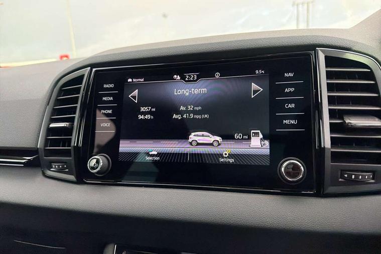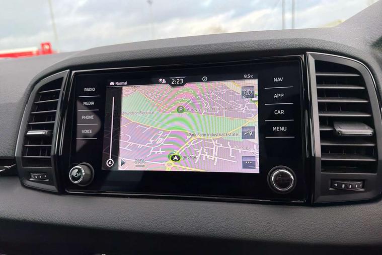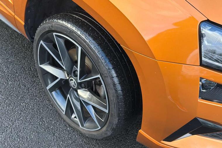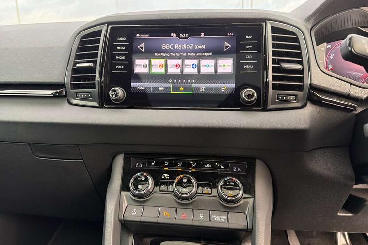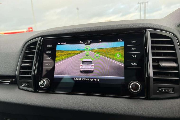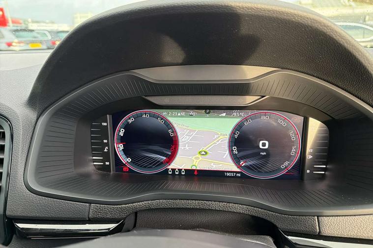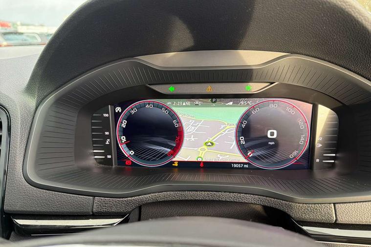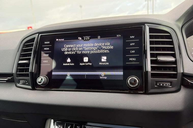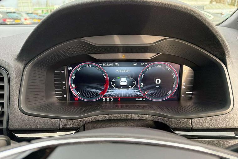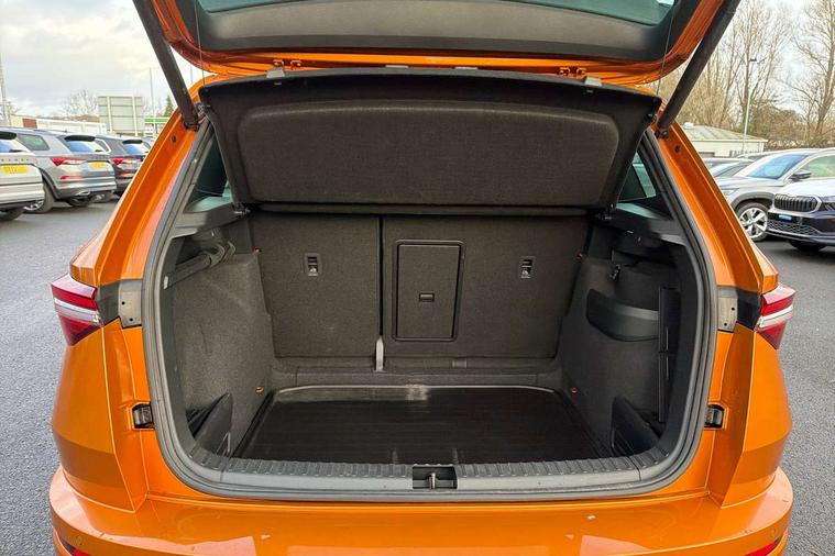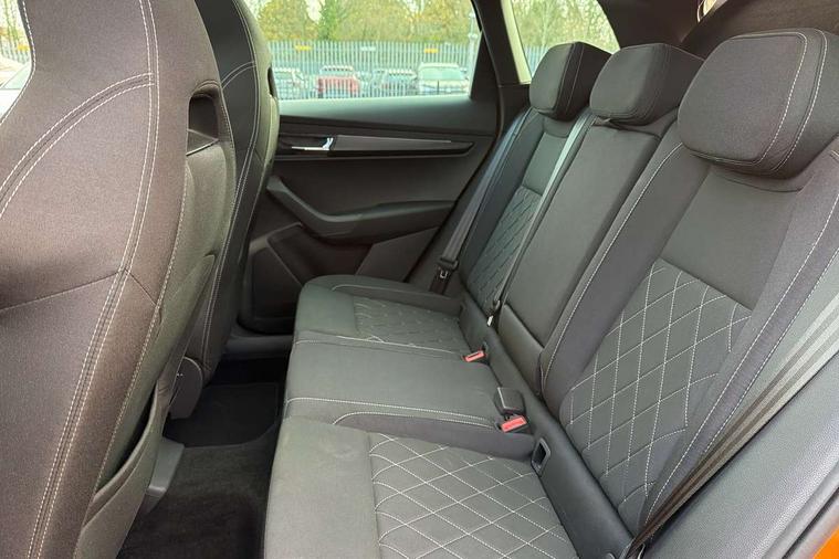 8" Digital display, Care connect, Driver fatigue sensor, Emergency services call system, Outside temperature gauge, Service interval indicator, SmartLink wireless for Apple and wired for Android, Start/stop system with regenerative braking, USB C Port x 2 in front centre console, Virtual cockpit, Virtual pedal with electrically operated boot door, 8 Speakers, DAB radio with Bluetooth, USB connection, Wireless charging without wireless aerial connection, Acoustic glass, Aero front windscreen wipers with intermittent function, Auto dimming rear view mirror with light and rain sensors, Black door mirrors, Black electric window control buttons, Black radiator grille, Black roof rails, Body colour door handles, Electric front and rear windows with child proof lock, Front door steps with SportLine logo, Heated rear windscreen, LED daytime running lights, LED rear lights with high functionality welcome effect and dynamic indicators, Light assistant (coming/leaving home/tunnel light), Panoramic sliding sunroof, Plastic scuff plates, Privacy glass, Protective door side sills in body colour, Rear diffuser, Rear side wing doors, Rear spoiler, Rear window wiper with washer system and intermittent control, Safety reflectors on front doors, Skoda lettering on tailgate in black, Sportline badge on front fender, Sportline decorative inserts with badging, Sports front and rear bumpers, 1.5 litre bottle holders in driver and front passenger door panels, 12V socket in boot, 12v socket in front centre armrest with storage compartment and rear air vents, 3 rear height adjustable headrests, 3 seat bench in 2nd row, 3 spoke leather sports multifunction steering wheel and silver stitching, 4 foldable roof handles with rear coat hooks, Black floor carpet, Black roof headlining, Chrome inner door handles, Double sided boot floor, Foldable hooks in the boot, Front head restraints, Height adjustable front three point seats belts with tensioners, Height/reach adjust steering wheel, Ice scraper, Illuminated glovebox, Illuminated luggage compartment, Isofix child seat preparation outer rear, Manual lumbar support for front seats, Pen holder, Pollen filter, Rear boot cover, Rear reading lights, Rear seats fixed folding and divided 60:40, Rubbish bin door, Safety vest holder, Single front passenger seat, Storage box in upper central dashboard closed, Sunvisors with illuminated vanity mirrors, Textile floor mats, Ticket holder, Titan black interior ceiling, Welcome animation with sportline logo, Boot pack - Karoq, Light Pack - Karoq, Parking pack - Karoq, Automatic door unlocking in case of crash, Automatic fuel cut off in case of crash, Child locks on rear doors, Driver airbag, Electronic parking brake with auto hold function, Emergency rear braking signal, ESC including ABS, MSR, ASR, EDS, HBA, DSR, RBS, MKB and traction control, Front side airbags, Hill hold control, Knee airbags, Passenger airbag with switch-off function, Pedestrian monitor, Seatbelt reminder signalisation and pretensioner for all seats, Three point seatbelts rear, Two tone horn, Tyre pressure display, Tyre pressure monitor, Alarm with interior monitoring, back up horn and tilt sensor with safe function, Electronic engine immobiliser, Keyless entry and start/stop, Remote central locking with 2 remote folding keys, Black air vent surround, Black centre console, Satin black dashboard, Satin black door trim, 19" Sagitarius anthracite alloy wheels with matt black aero inserts, Anti-theft wheel bolts protection, Matt black aero hub caps, Tool kit,