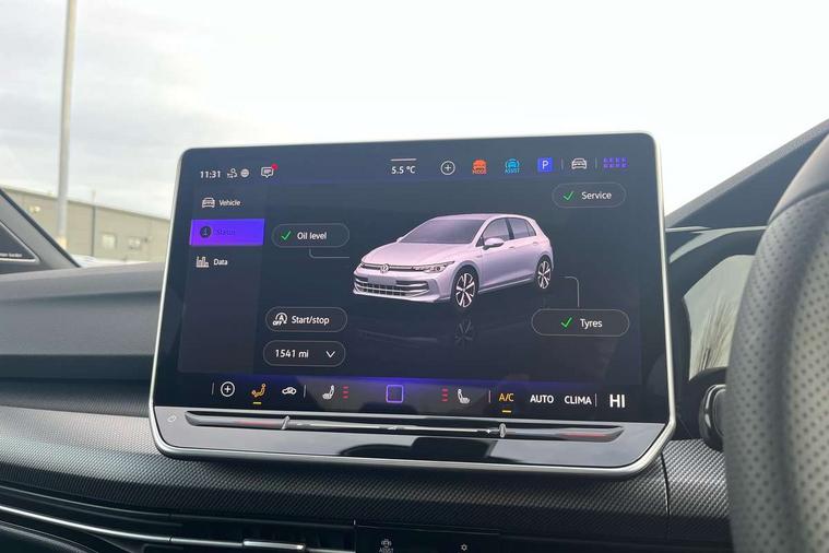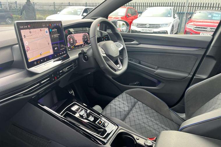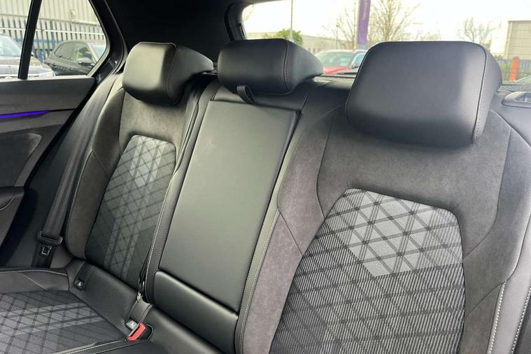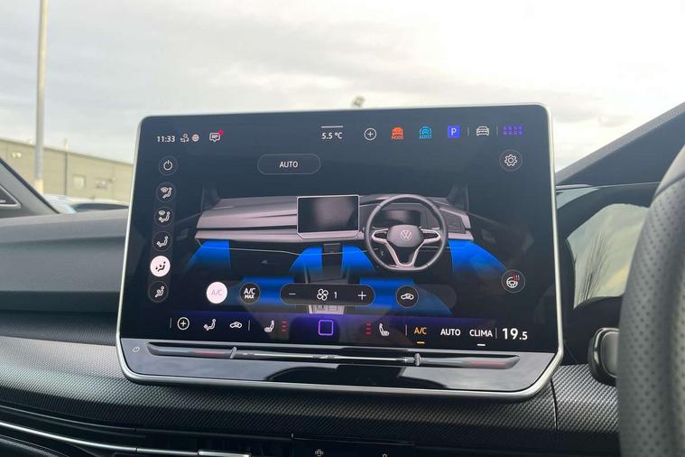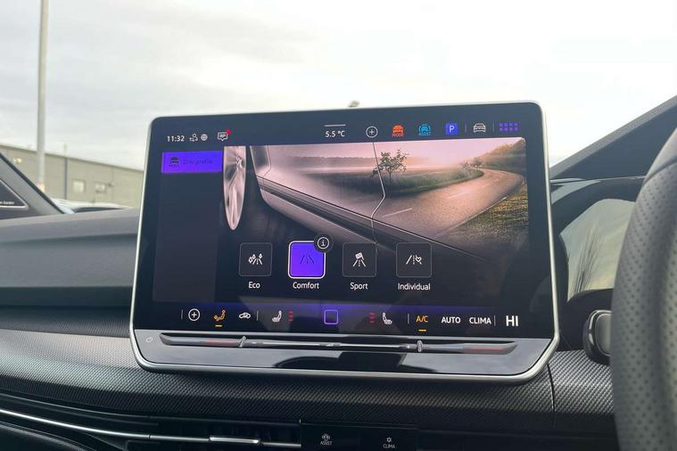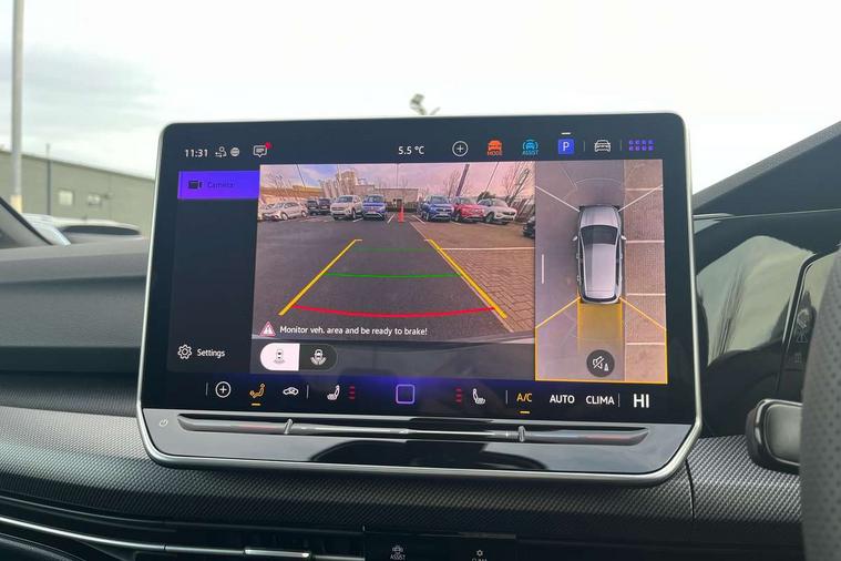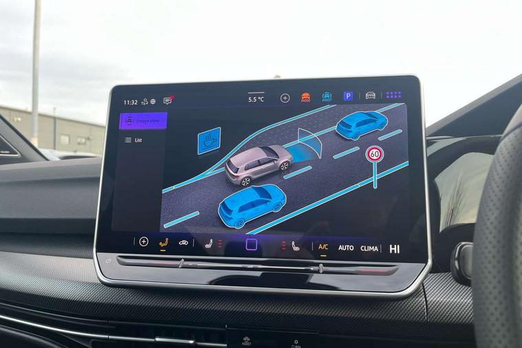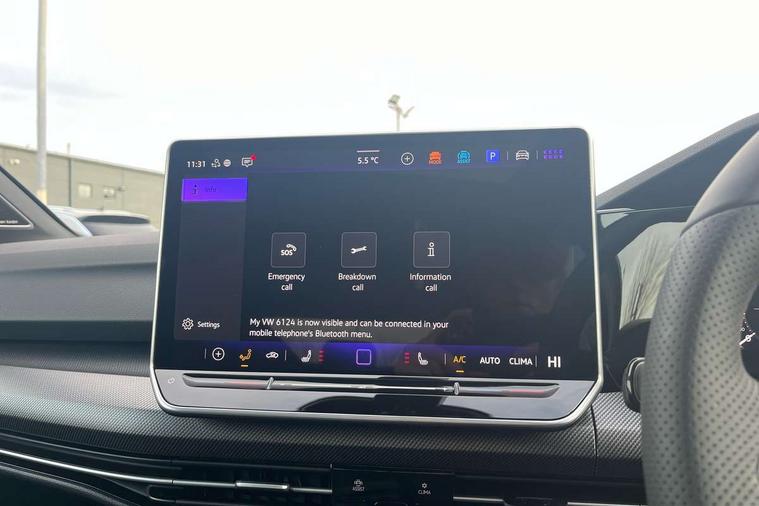Activated carbon canister, Adaptive cruise control (ACC), Advanced driver attention and drowsiness monitor, Dynamic road sign display, Dynamic steering, E-Sim card for online connectivity, eCall emergency call system, Multi-color Digital cockpit pro, selection of different info profile possible, Multifunction front facing camera for distance control, Navigation system, Oncoming vehicle braking when turning including swerve support, Speed limiter, Speedo, rev counter, electronic odometer, trip, service interval display, exterior temperature and fuel gauge, Traffic jam assist, Voice enhancer and voice control, Warning signal and warning light for front and rear seatbelts not fastened, We connect plus preparation, We connect preparation, Wireless app connect, Hybrid propulsion system, Petrol Particulate Filter, Start-stop system with battery regeneration (recuperation - energy recovery during braking), XDS electronic differential lock for improved traction and handling, 2 USB C ports in front, 2 USB charging sockets on the centre console in the rear charging capacity upto 45W, Digital radio reception (DAB), Diversity antenna for FM reception, Gaming platform via car app, Infotainment system with 12.9" display, Mobile phone interface with inductive charging feature, 3rd brake light, Auto dimming rear view mirror, Automatic headlamp activation with Coming home and Leaving home feature, Body colored bumpers in R-Line style, Body colour door handles, Exterior ambient lighting, Exterior mirrors convex on the left and aspherical on the right, Front and rear electric windows, Heat insulating windshield made of laminated glass, LED separate daytime running light, Rain sensor, Rear exhaust tailpipe, Rear fog light on one side and reversing lights on both sides, Rear side wing doors, Rear windscreen washer and wiper with interval delay, Remote electrically foldable door mirrors, puddle lights and reverse activated passenger's door mirror, Volkswagen logo in front, illuminated lighting animation with wake up/goodbye scenario and illuminated door handles, Welcome light with surround lighting, 12V socket in front centre console, 12V socket in luggage compartment, 3 rear head restraints, 3 seat bench in 2nd row, Ambient lighting with 30 colour including LED light unit in front footwell with selectable light colour, Black roof lining, Brushed stainless steel pedals, Chrome plated radiator grille inserts, air vent surrounds and light switch surrounds, Door insert, side trim panel and arm support in leatherette, Front + rear black carpet mats, Front centre armrest, Front seat lumbar support adjuster, Integrated front head restraints, ISOFIX anchors for child seats on outer rear bench seats and on front passanger seat compatible for i-Size, Luggage compartment lighting, Manual height adjustable front passenger seat, Manually height adjustable driver seat, Plastic gear knob, Premium sports seats in front, Rear cupholder and loadthough, Sardegna cloth upholstery with front and outer rear seats Art Velour inner sides of bolsters, Single front passenger seat, Split folding backrest with centre armrest and unsplit rear seat bench, Sun visors with illuminated vanity mirrors, Titanium black instrument panel, Black exterior Styling package with Matrix LED headlights - Golf, Winter package - Golf DSG Estate/Hatchback, 3 point height adj front seatbelts + pretensioners, 3 rear three point seatbelts, ABS, Autonomous emergency braking front assist with pedestrian and cyclist monitoring, Child locks on rear doors, Driver and front passenger airbag with front passenger airbag deactivation, Electronic parking brake with auto hold, ESC (Electronic Stability Control), Extended pedestrian protection measures, Hill start assist, Rear disc brakes, Two tone horn, Tyre pressure loss indicator, Volkswagen roadside assistance, Anti theft wheel bolts, Preparation for alcohol interlock, Decorative inserts carbon grey for dashboard and front door trim panels, 18" Leeds alloy wheels, Tool kit for tyre mobility set, Tyre mobility kit Includes 12V compressor and tyre sealant,