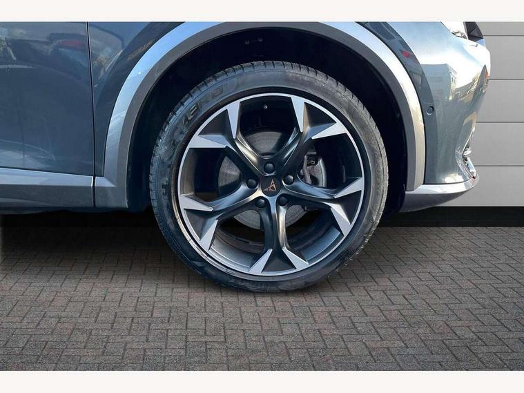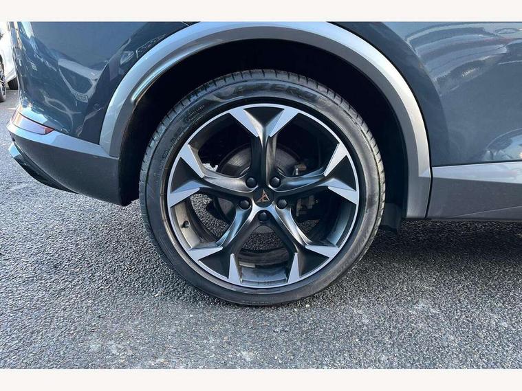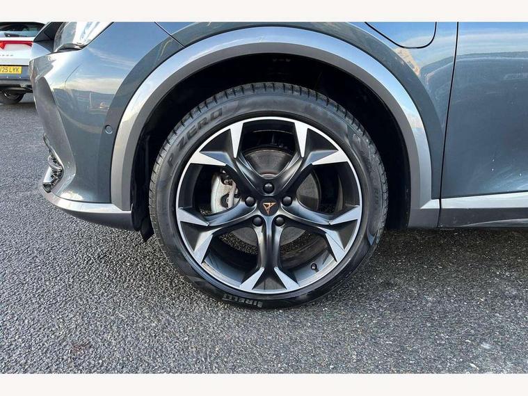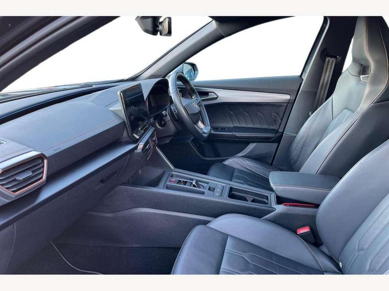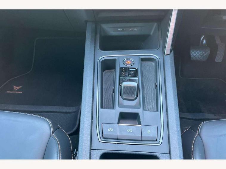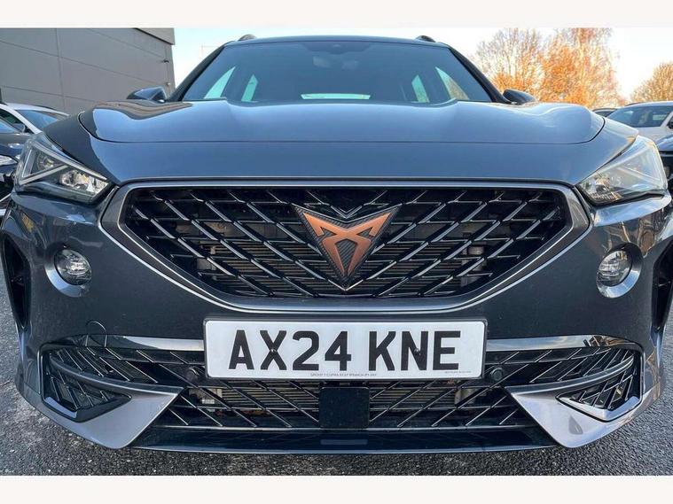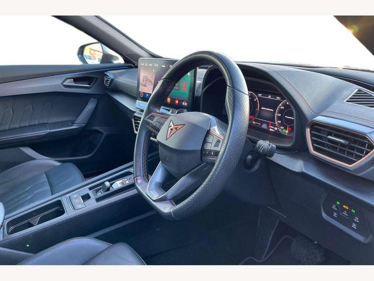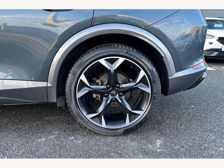 Digital cockpit and configurable dashboard, Driver alert system, Driving profile selection, Forward collision warning with automatic braking, Lane assist, Navigation system with 12'' Touchscreen Display, Park assist (inc front/rear parking sensors), PAS, Predictive adaptive cruise control with speed limiter, Rear view camera, RPM, trip computer, outside temp gauge, instrument light brightness, low fuel warning light, lights on reminder, gearshift indicator, Service interval indicator, Start/stop system with regenerative braking, Voice control system, Wired Android Auto, Wireless apple carplay, Wireless phone charger, 10 amp mode 2 charging cable, 16 amp mode 3 charging cable, 3.6 kw On-board charger, Electronic locking differential and dynamic traction support, Standard suspension, 2 front and 2 rear USB type C sockets, DAB radio, Auto dimming rear view mirror, Body colour door handles, Body coloured bumpers, Dark grey wing mirror, Daytime running light with automatic headlight control and coming home feature, Dynamic headlight range control, Electric front/rear windows, Electrically adjustable heated and folding door mirrors with memory function, Front fog lamps with cornering function, Gloss black roof rails and window surrounds, LED Headlights, LED Taillights with dynamic indicator, Rain sensing wipers, Rear diffuser with black simulated exhaust pipes, Rear side wing doors, Rear wash/wipe, Third brake light, Tinted rear windows, Welcome lights, 12V socket, 2 front and 2 rear reading lights, 3 seat bench in 2nd row, 60/40 split rear bench seat with armrest and mechanical seat release, Black headlining, Dust/pollen filter, Front and rear head restraints, Front centre armrest, Height/reach adjust steering wheel, Illuminated interior front door sills, Illuminated sunvisor with mirror, Isofix, Leather multi function heated steering wheel with gear shift paddles, Single front passenger seat, Three zone climate control with control panel in rear, Wraparound lighting, Genuine Nappa leather Pack - Cupra, 3 point seatbelts on all rear seats, ABS, Brake control system - ESC and brake booster, Child proof door locks, Driver and front passenger airbags with front passenger airbag de-activation, Electronic parking brake, Front and rear disc brakes, Front side curtain airbags, Hill hold control, Public e-call, Seat belt reminder for front and rear seats, Tyre pressure monitoring system, Anti theft alarm system, Keyless entry and start system (KESSY), Locking wheel bolts, Copper and aluminium interior detailing, 19" 'Exclusive' machined sport matte black and silver alloy wheels, Tyre repair kit,