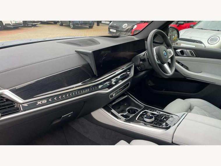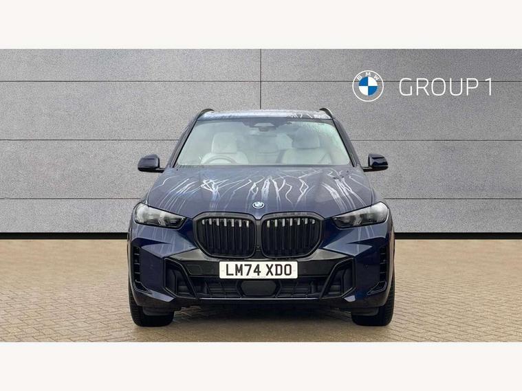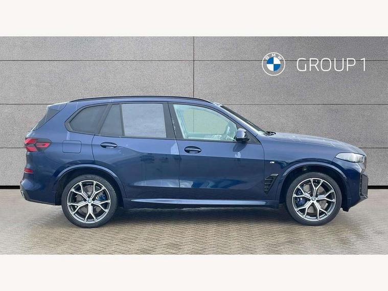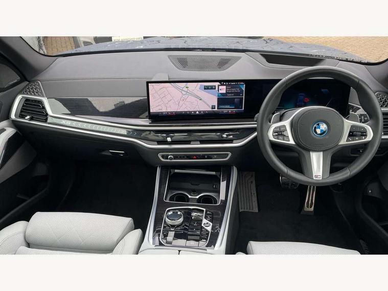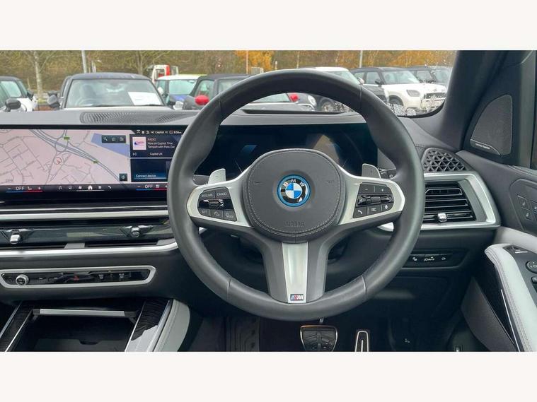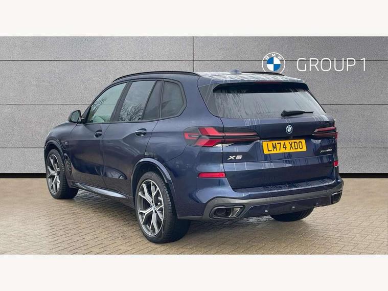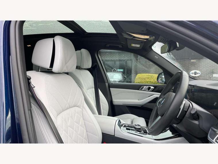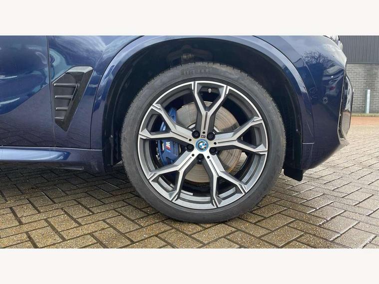 Attentiveness assist, Automatic tailgate operation, BMW ConnectedDrive online services, BMW live cockpit + with curved 12.3 instrument cluster/14.9 central display, nav/Tuner with diversity reception, RDS/4GLTE/remote software upgrade, BMW Teleservices, Condition based service, Cruise control with brake assist, eCall emergency call system, Enhanced bluetooth with wireless charging, Integral active steering, Integrated owner's handbook, PAS, Speed limiter, Wi-Fi hotspot, AC Fast charging preparation (Maximum charging power 11kW), Adaptive 2-axle Front and rear air suspension, Drive performance control with ECO PRO comfort + sport mode, Eight speed steptronic sport automatic transmission and gearshift paddles on the steering wheel, Hi-Fi loudspeaker system, Adaptive LED Headlights, Front and rear electric windows, High beam assistant, High gloss black shadow line roof rails, LED daytime running lights, Rain sensor, Rear side wing doors, Third brake light in rear spoiler, Variable intermittent rear wash/wipe, 12V - Power sockets with 2x centre console and 1x luggage compartment, 3 seat bench in 2nd row, Foldable rear centre armrest with 2 cupholders and storage compartment, Front and rear side armrest integrated into door trim, Headrests for all seats, Luggage compartment separating net, Single front passenger seat, Three spoke sport M leather steering wheel, Velour floormats, Ambient light interior pack - X5, Driving assistant pack with radar based driver assistance system - X5, Expanded exterior mirror pack - X5/X5 M, M aerodynamics pack - X5, 3 rear seatbelts, Acoustic protection for pedestrians, Active protection, Airbags - driver/front passenger, rear and side, first and second row seats head airbags, front passenger seat airbag deactivation + knee airbag, Anti-lock braking system (ABS), Automatic Stability Control (ASC), Brake energy regeneration, Cornering brake control (CBC), Crash sensor activating central locking release, hazard warning lights, fuel cut off, interior lighting + activation of safety battery terminal clamp, DSC - Dynamic Stability Control, Dynamic Traction Control - DTC, Electromechanical parking brake with automatic drive away release and auto hold function, Electronic brake force distribution, Hill start assistant, M Sport blue painted brake calipers with 'M' designation, Mechanical child proof lock on rear doors, Tyre pressure monitoring system, Tyre pressure sensors, Ventilated front and rear disc brakes, Warning triangle and first aid kit, Alarm system, Closing system with central locking, Comfort access system, Locking wheel bolts,