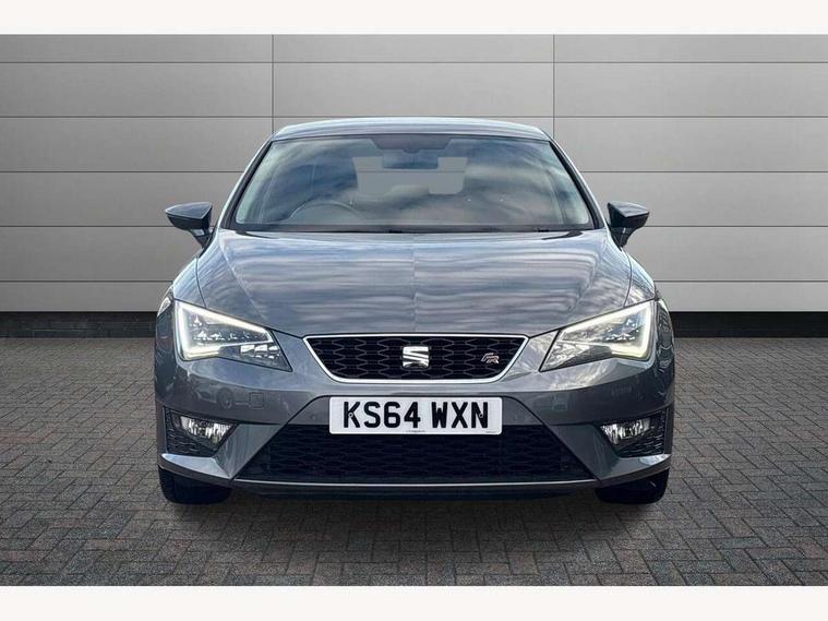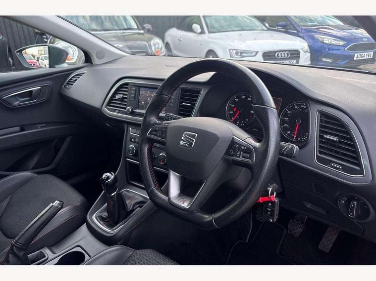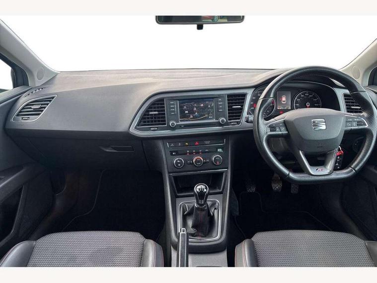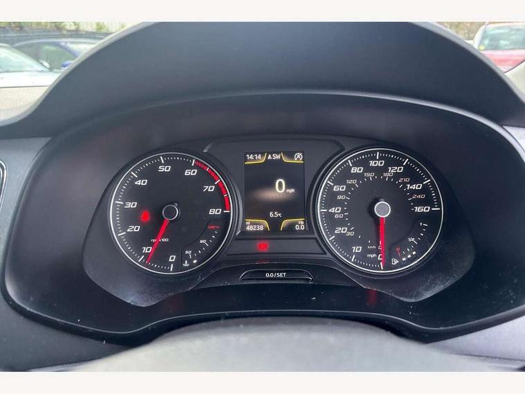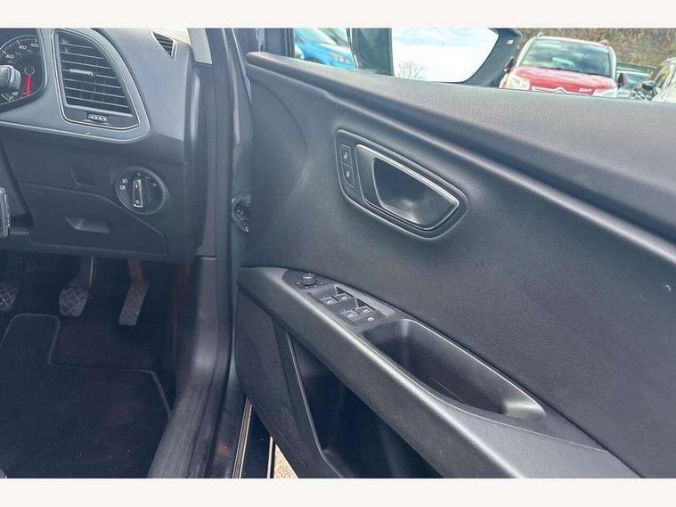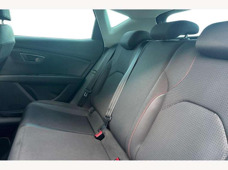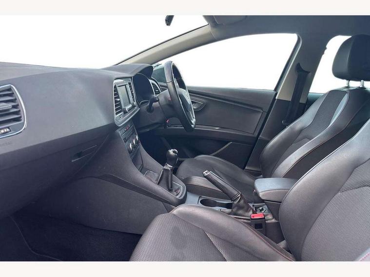 'Lights On' Reminder warning buzzer, Bluetooth Handsfree Phone Connection, Digital clock and outside temperature display, Front and rear parking sensors, Low fuel warning light, Multi function display, Remote fuel flap release, SEAT Drive profile, SEAT logo boot release, Service interval indicator, Touch screen display, Trip computer, Sports suspension, XDS electronic differential lock, Auxiliary input socket, Bluetooth audio streaming, DAB Digital radio, Radio/CD + MP3, SD card slot, Steering wheel mounted audio/phone controls, USB port, Aluminium front door sills, Body colour door handles, Body coloured bumpers, Chromed centre radiator grille surround, Coming home headlight function, Dark tinted rear windows, Electric adjustable/heated/folding door mirrors, Electric front/rear windows with one touch/auto up/down, Electric headlamp adjustment, LED indicators in door mirrors, Rear wash/wipe, Reverse activated kerb-view adjustment on passenger's door mirror, Tinted windows, 12v power point in centre console, 3 height adjustable rear headrests, Active head restraints, Additional heating and ventilation outlet in rear of centre console, Ambient lighting, Driver/passenger sunvisors with illuminated vanity mirrors, Dual zone climate control, Dust/pollen filter, Front adjustable head restraints, Front armrest with storage box, Front cupholders x 2, Front map reading lights, Front seat and rear pockets, Front/rear floor mats, Height/reach adjust steering wheel, Illuminated boot, Illuminated glovebox, Leather handbrake, Luggage tie-down hooks, Passenger seat height adjuster, Passenger seat lumbar adjust, Perforated leather steering wheel with red stitching + gear knob, Rear reading lights, Rear top tether child seat ISOFIX attachment, Split folding rear seat, Full LED headlight pack - Leon, Seat navigation pack - Leon FR/Cupra, 3 point seatbelts on all rear seats, ABS + traction control, Child proof door locks, Curtain airbags, Driver/Front Passenger airbags, Drivers knee airbag, ESP+EBA, Front seatbelt pretensioners, Front side airbags, Hill hold control, Manual passenger airbag deactivation function, Seatbelt warning, Tyre pressure monitoring system, Engine immobiliser, Locking wheel bolts, Remote central locking + deadlocks, Second remote key, Volumetric alarm with back up horn, Chrome interior trim,