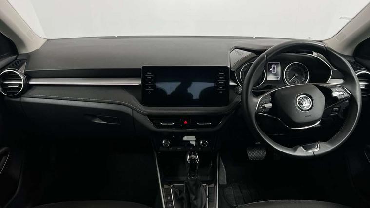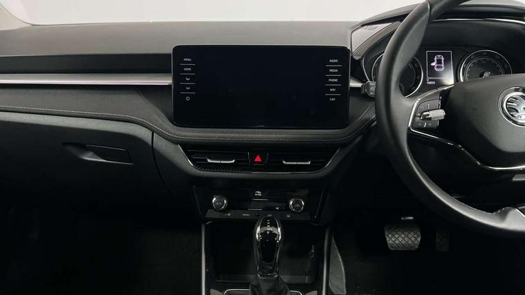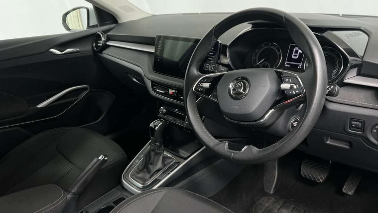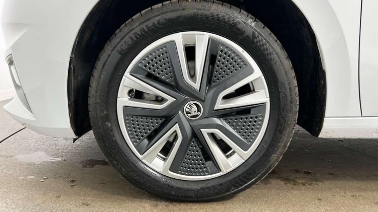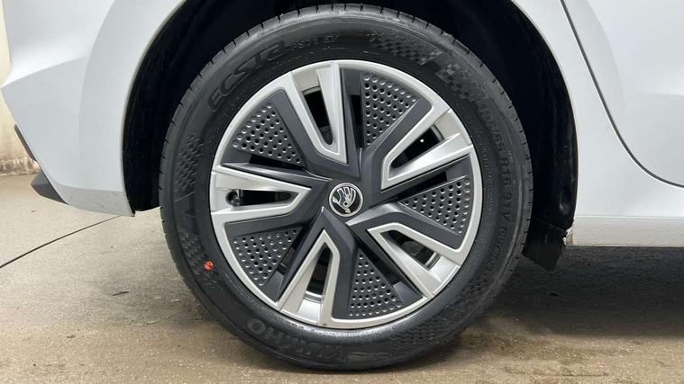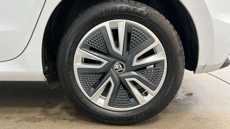 Bluetooth connection, Driver alert system - DAS, Electromechanical power steering, Exterior temperature gauge, Service interval indicator, 2x USB-C in the front (for data transmission and charging), 6 Speakers (4 in front and 2 in rear), Auxiliary socket for external MP3 player, DAB digital radio reception, Web radio, Auto dimming rear view mirror, Basic LED Headlights, Body colour door mirrors, Body coloured bumpers, Chrome window surround, Door mirror integrated indicators, Electrically adjustable and heated door mirrors, Front and rear electric windows, Front fog lights, Front window wiper intermittent control, Headlight range control - Automatic, Ice scraper in fuel cap, LED daytime running lights with coming and leaving home feature, Rain sensor, Rear LED fog light, Rear side wing doors, Rear window wiper with washing nozzles, Roof mounted spoiler, SKODA tailgate lettering in chrome, Third brake light, 3 rear headrests, Backrest split and folding, Central console with fixed cup holder and storage box, Chrome handbrake release button, Comfort seats, Fabric upholstery, Front centre armrest, Gearshift knob/handle in leather, Hand brake lever handle in leather, Height adjustable front headrests, Height adjustable front seats, Height adjustable steering wheel, ISOFIX and TopTether anchorage points to the outer rear seats, ISOFIX and TopTether on the front passenger seat, Luggage compartment lighting, Manually adjustable lumbar support in front seats, Pollen filter, Rear seat bench unsplit, Removable cup holder, Single front passenger seat, Storm grey headlining, Sun visors with mirror and airbag label on passenger side, Textile floor mats, Ticket holder, Umbrella in drivers door, 3-point height adjustable front seats belts with pretensioner and force limiter, Automatic warning lights in case of crash, Driver and passengers airbag with switch off function, e-Call+, ESC including ABS, MSR, ASR, EDS, HBA and XDS, Front and rear seat belt warning, FRONT ASSIST (AEB City and AEB Inter Urban), Front side airbags, Head airbags, Hill hold assist, One tone horn, Pedestrian protection, Three rear 3-points safety seat belts with pretensioner and force limiter including stop function for outer rear seat belts, Tyre pressure monitoring system, Anti-theft alarm system including immobiliser, interior monitoring, backup horn, and towing protection, Central locking with radio remote control, interior controls, SAFE function and 2 foldable keys, KESSY - Keyless engine start/stop, Chrome edged air vents, Satin black door and side trim panel in front, Anti-theft wheel bolts protection, Super-low rolling resistance tyres,