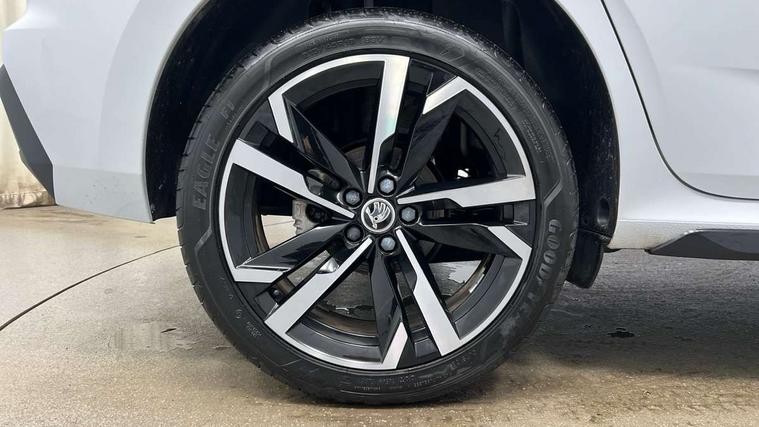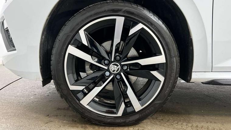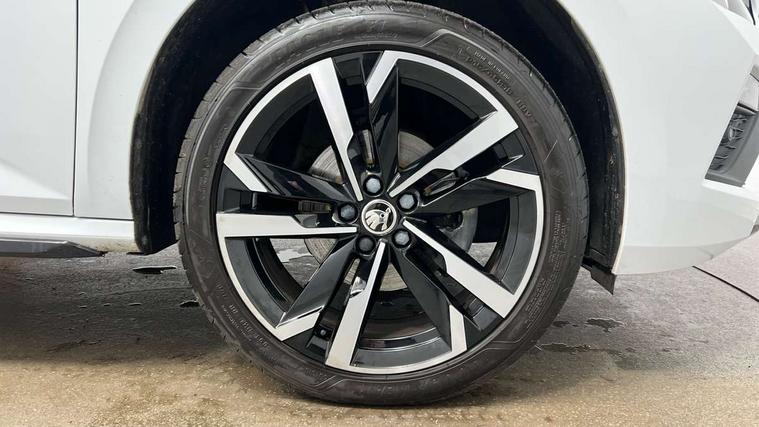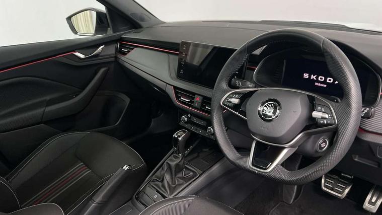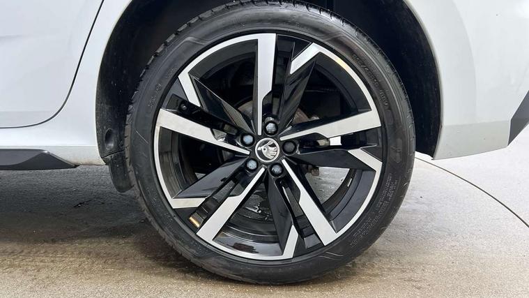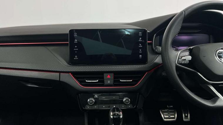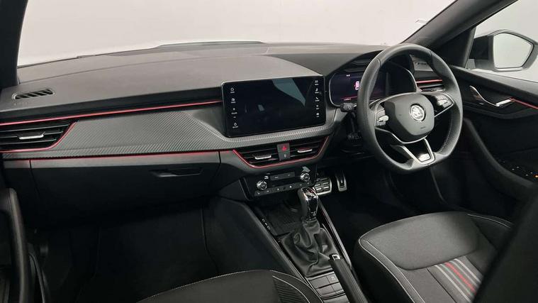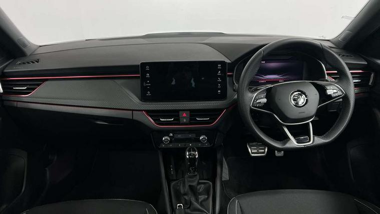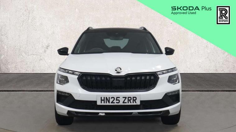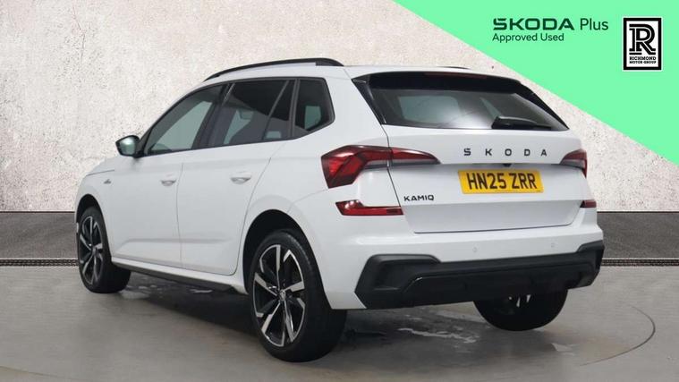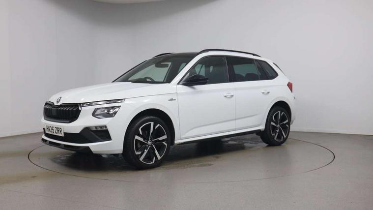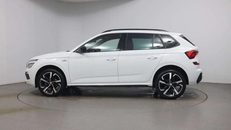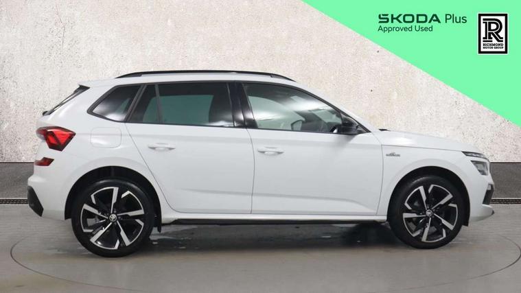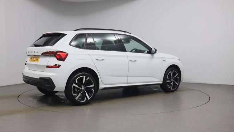 Advanced driver attention and drowsiness monitor, Bluetooth system, E-call, Front assist system, PAS, Rear parking sensors, Rear view camera, Service indicator, Speed limiter, Traffic sign recognition, Virtual cockpit with 10.25" display, Voice control system, Wireless smartlink, 4 USB C ports, 8 Speakers, 9.2" Skoda navigation display, DAB Digital radio, Auto dimming rear view mirror, Automatic headlight control with coming home and leaving home feature, Black door mirrors, Black radiator grille, Black rear diffuser, Black roof spoiler, Body colour bumpers, Body colour door handles, Boot lettering in black, Extended tailgate glass, Fixed panoramic sunroof with black roof rails, Front and rear electric windows, Heated rear window, LED daytime running lights, LED high beam, LED low beam, LED third brake light, Light sensors, Monte carlo plaque, Privacy glass, Rear side wing doors, Rear wiper, Ticket holder inside windscreen, 12V socket in luggage compartment, 3 seat bench in 2nd row, Aluminium pedals, Ambient lighting in white/red, Art leather carbon decor inserts, Art leather carbon door inserts, Black roof lining, Cargo elements, Chrome inner door handles, Driver and passenger sun visors with vanity mirror, Dual zone climate control, Front and rear roof lights, Front centre armrest, Front head restraints, Glove compartment with illumination, Height adjustable driver seat, Height adjustable front passenger seat, Ice scraper, Inner circulation control with pollen filter, ISOFIX on front passenger seat, Isofix preparation for back seats, Leather gearknob and handbrake lever, Manual lumbar support for front seats, Monte Carlo cloth upholstery, Net package and top tether hooks in boot space, Net under rear shelf, Pocket on the back of both front seats include mobile phone pockets, Rake/reach adjustable steering wheel, Reading lights, Rear centre armrests, Red hotstamping, Single front passenger seat, Sports seats, Textile floor mats, Third rear headrest, Top tether for front passenger seat, Umbrella in driver's door, Light and view plus package - Kamiq, 3x3 point rear seatbelts, Airbags - driver and front passenger, Disc brakes, ESP, Extended and predictive pedestrian/cyclist protection, Front passenger airbag deactivation switch, Front side airbags with curtain airbags, Hill hold control, Manual leather parking brake, Manual rear child locks, One tone horn, Seatbelt reminder for driver an co-driver, Traction control, Tyre pressure monitor, Anti-theft alarm system with interior monitoring, backup horn, towing protection and remote central locking with SAFE system, Anti-theft wheel bolts, Electronic engine immobilizer, 18" Ursa black diamond cut alloy wheels,