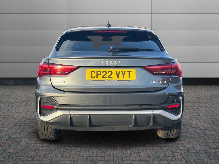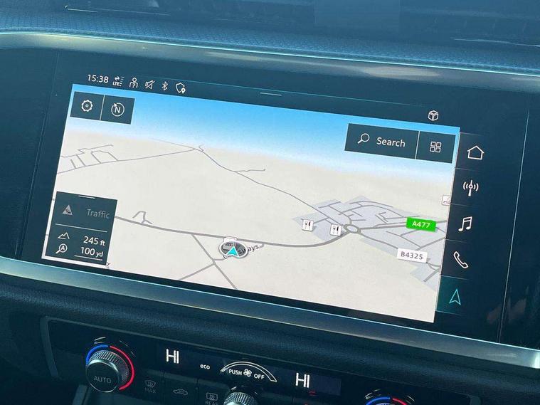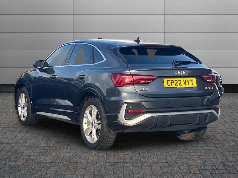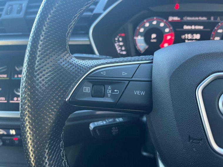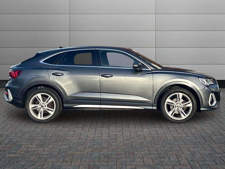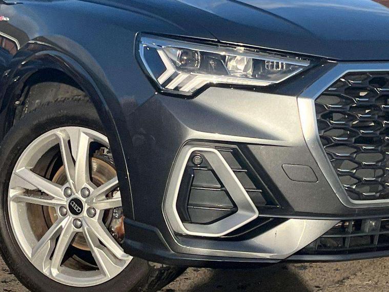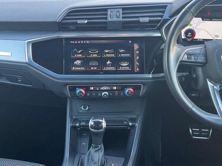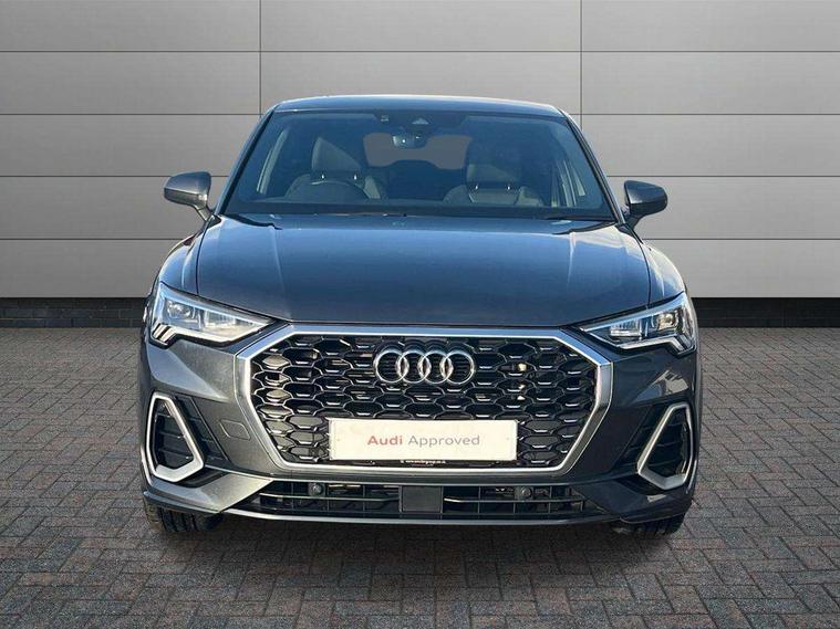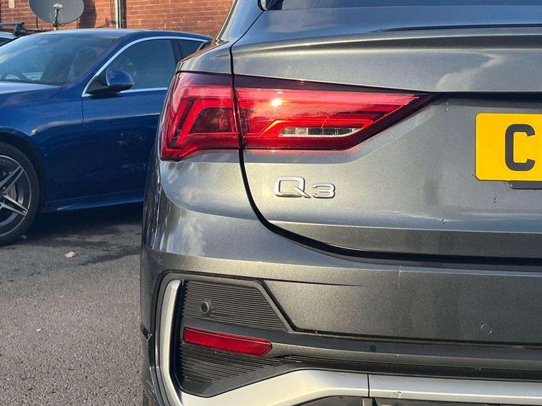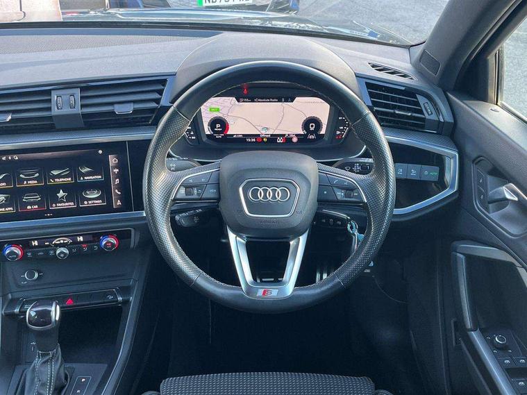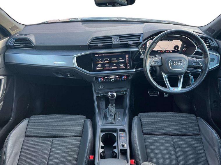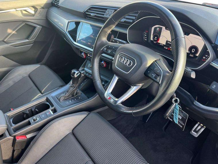 Audi connect safety and service (e-call), Audi drive select, Audi lane departure warning, Audi Virtual Cockpit - 10.25" display, Bluetooth interface, Camera based traffic sign recognition, MMI Navigation Plus with high resolution 10.1 inch touchscreen colour display, Power operated tailgate, Progressive steering, Service interval indicator, Smartphone interface includes wireless Apple carplay/Android Auto, Start stop system with recuperation, Voice control system with natural language interaction, 48V Mild hybrid technology, Sports suspension, 2 USB-C ports with charge and data functions, 6 passive loudspeakers, DAB digital radio module, Acoustic windscreen, Aluminium window trim, Auto dimming frameless rear view mirror, Diffuser grille in grained matt black, Diffuser trim in selenite silver, Electrically folding, adjustable and heated door mirrors with integrated LED side indicators and kerb view function for passenger side, Front and rear electric windows, Front fog lights, Front side air inlets in selenite silver, Front underbody protection in manhattan grey paint finish, Grille surround in aluminium silver matt, High gloss black finish B and C pillars, LED headlights with LED daytime running lights, LED rear lights, LED third brake light, Privacy glass dark tinted rear and rear-side windows (from B-pillar backwards), Radiator grille in titanium black with inlay in matt aluminium silver, Rain and light sensors, Rear side wing doors, Rear underbody protection in matt black, Rear wiper, S line badges on front wings, Side skirt insert in matt Platinium grey, Variable front intermittent wipers, 12V socket in rear centre console, 3 seat bench in 2nd row, 40:20:40 folding with manual adjustment for 60:40 forwards/backwards position and backrest angle, Adjustable rear seat bench/backrest with centre armrest and cupholder, Black cloth headlining, Dual zone electronic climate control, Front and rear black floor mats with contrast stitching, Front and rear headrests, Front and rear roof module including reading lights, Front centre armrest, Glove compartment lighting, Height and reach adjustable steering wheel, Illuminated door sill trims with S logo, ISOFIX child seat mounting for front passenger with airbag deactivation and outer rear seat including top tether attachment point for outer rear seats, Luggage compartment light right in white, Luggage compartment sill protection in stainless steel, Manual front seats with height adjustment, Perforated leather gearknob, Single front passenger seat, Stainless steel pedals, Non smoking pack - Q3, 3x3 point rear seatbelts, 6 airbags - Driver, front passenger, curtain and side windows, Audi pre-sense front with pedestrain and cyclist recognition, Electromechanical parking brake, Electronic stabilisation control including ABS, ASR and EDL, Front seatbelt reminder, Hill descent control, Hill hold assist, Manual child lock in rear doors, Pre sense basic, Seatbelt monitoring, Tyre pressure warning, Warning triangle and first aid kit, Anti theft alarm, Anti theft wheel bolts, Immobiliser, Remote central locking, Black dashboard, Dark matt brushed aluminium inlay, Detail dashboard around MMI touch colour display in glass look, black with surround in aluminium look, Leatherette door armrest, Tool kit, Tyre repair kit,