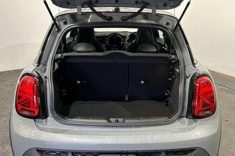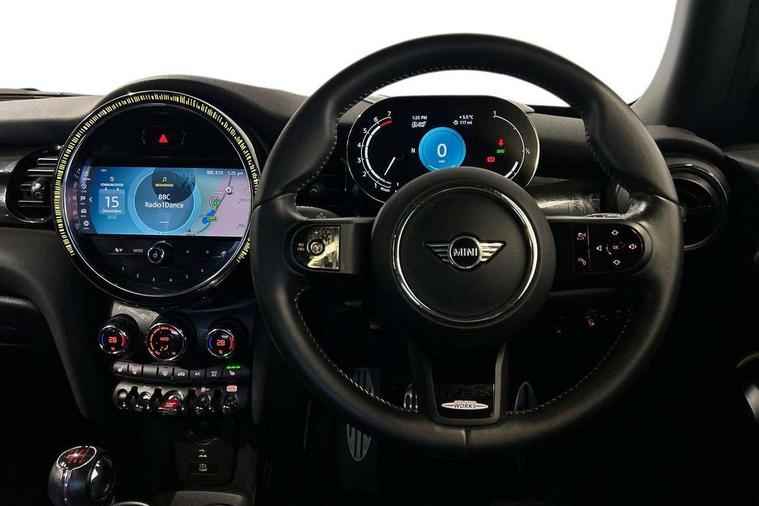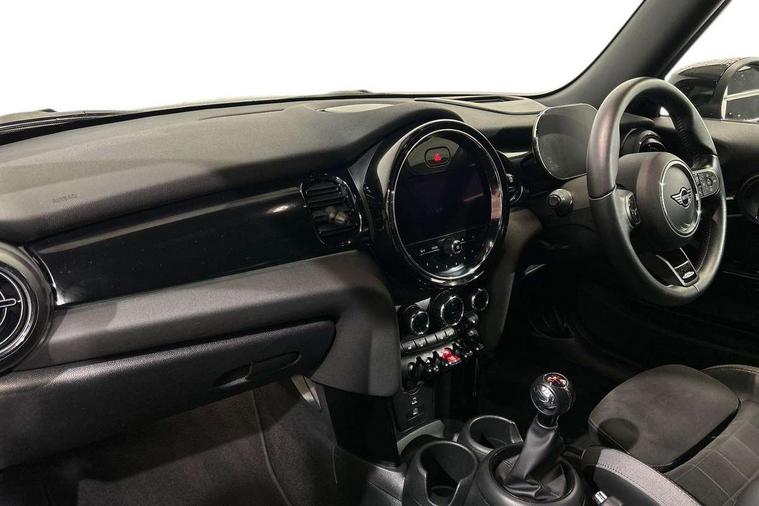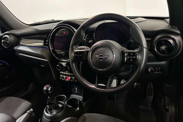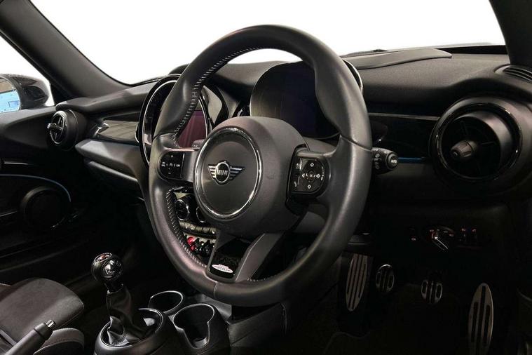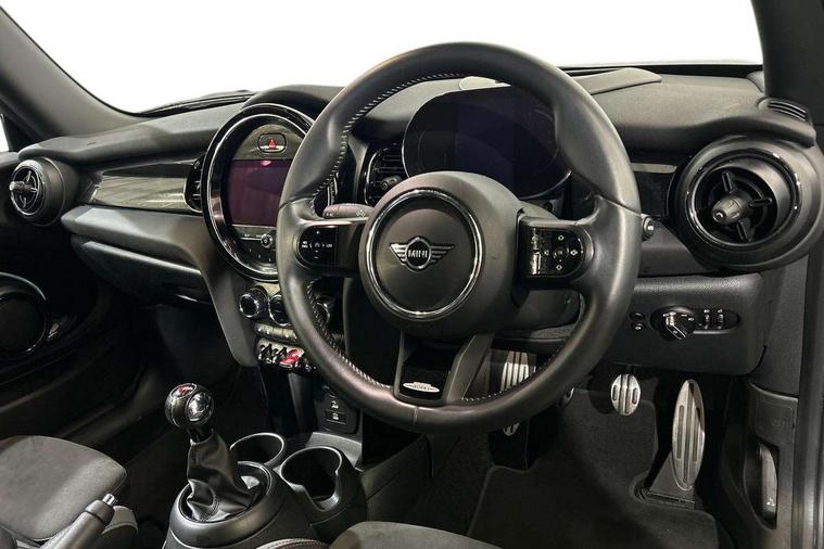 Apple CarPlay, Automatic start/stop function with brake energy recuperation, Compatible mobile phone bluetooth with audio streaming, Cruise control with brake assist, Electro-mechanical speed dependant steering assistance, Flexible car sharing preparation, Instrument cluster, MINI Driving Modes - centre toggle switch to control driving setting (sport, mid and green), Mini E-call, MINI TeleServices, On board computer, Rear park distance control, Service interval indicator, 6 Speed manual transmission including gear change indicator display, Double Vanos system, Fully variable valve control, High precision injection, Intelligent adaptive suspension, Performance Control, 8.8" touchscreen with LED ring, FM tuner and DAB digital radio, 3rd brake light, Automatic headlight activation switch, Bonnet scoop, Dynamic brake lights, Electric front windows, Heated rear window, Heated windscreen washer jets, JCW Aerodynamic kit - Front and rear bumpers with sporty JCW styling and part-painted side sills with MINI John Cooper Works door sill finishers, John Cooper Works rear spoiler, LED headlight with closed ring and daytime driving lights, Metal door sill strips with Cooper S, Model logo Cooper S on right of tailgate, Radiator grille chrome border with honeycomb structure including S Badge, Rain sensor window wipers, Rear fog lights, Rear LED lights with union jack design, Rear window wiper, Side scuttle panel with integrated indicator, Sun/heat protection glass, Two central exhaust tailpipes with chrome finisher, White indicator lenses, 12V Accessory socket in centre console, 2 seat bench in 2nd row, 4 lashing eyes in luggage compartment, 60/40 split folding rear seat, Anthracite headliner including grab handles and clothes hooks, Carbon black colour line - Knee roll and door armrest, Chrome interior highlights, Cupholders, Front and rear isofix with front passenger airbag deactivation, Front floor mats in velour, Glove compartment, Height and length steering column adjustment, Interior lighting with 12 different colours across the dashboard, underneath door bezel with illuminated laser-engraved design on central display, JCW Sport seats with integrated headrests, adjustable thigh support and John Cooper Works logo, Leatherette gearshift lever and handbrake gaiters, LED reading lights, vanity mirror lights, front foot well light and spotlight on front seats, Manual air conditioning, Mechanical seat adjustment - forward/back & backrest for front seats and driver seat height adjust, Multifunction steering wheel, Passenger seat height adjuster, Single front passenger seat, Storage compartments in doors, Storage pocket on back of front seats, Sunvisors with vanity mirrors, Walknappa leather steering wheel with grey seam and John Cooper Works badge on Piano Black lower steering wheel spoke, Piano black exterior pack - Mini Hatchback Cooper S, 3 point seatbelts on all four seats, 6 Airbags - front, side, head and seat belt tensioners, Anti-lock braking system (ABS), DSC - Dynamic Stability Control, Front and rear disc brakes, Two tone horn, Tyre pressure monitoring system, Alarm system with tilt sensor, monitoring doors, bonnet interior and tailgate, Electronic vehicle immobiliser, Start/stop toggle with keyless go, Piano black interior trim, Tool kit,
