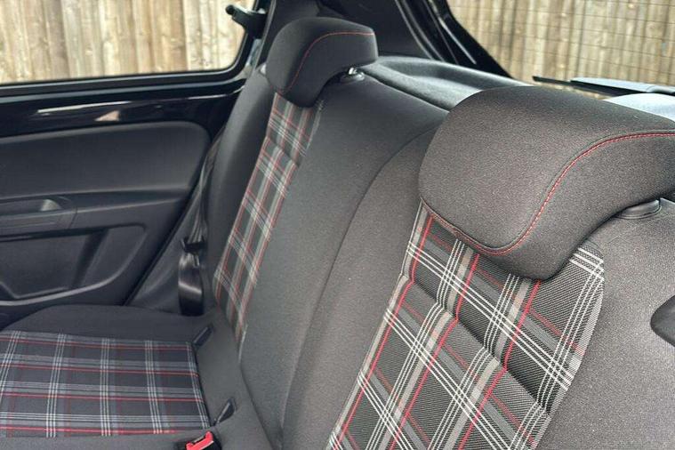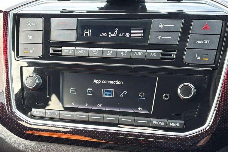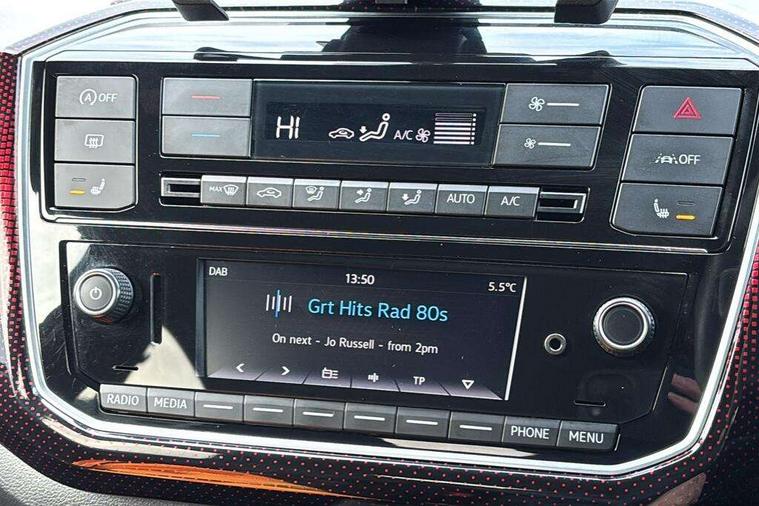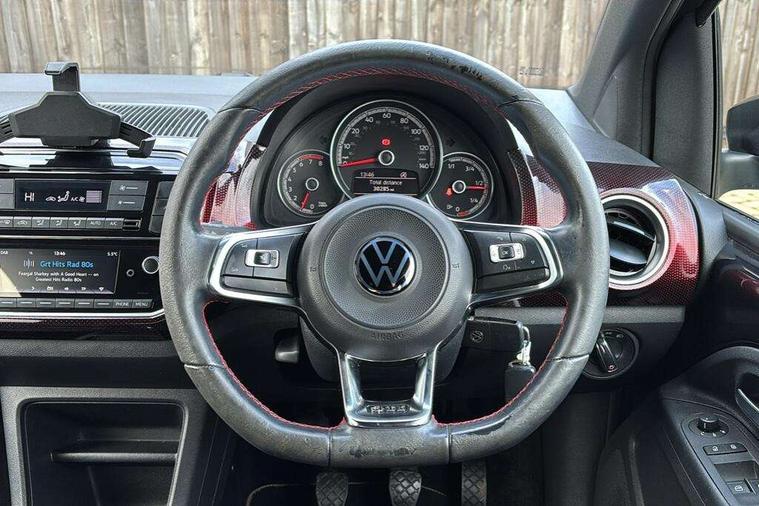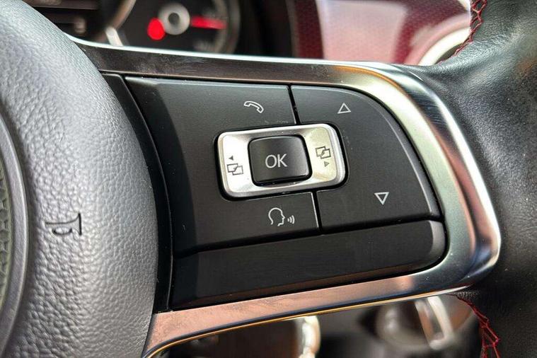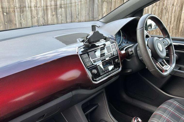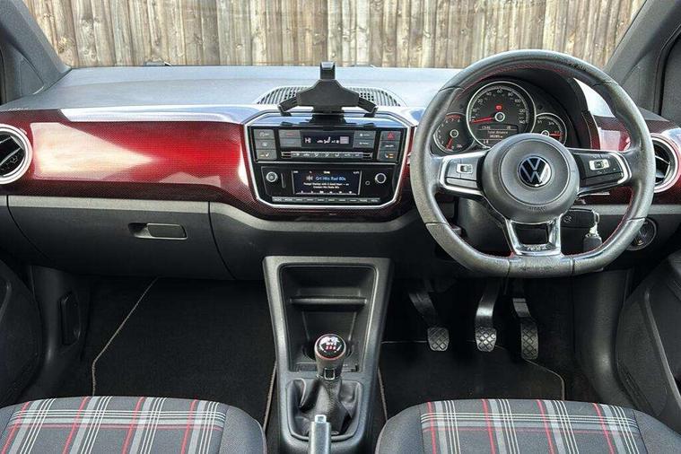 Chrome surrounds to the air vents, radio controls and air conditioning, Matt chrome trim on interior door handles, infotainment system + instrument cluster, Red pixels dash pad, GTI styling pack - Up, Winter pack - Up, 17" Oswald alloy wheels with anti theft wheel bolts, Tyre mobility system, Electronic engine immobiliser, Locking fuel filler cap, Remote central locking with 2 remote folding keys, Composition colour system with 5" screen, DAB, AUX in socket, SD card, MP3/WMA/AAC, 4 X 20W, bluetooth, audio connection and USB connectivity, Smartphone answering button on multifunction steering wheel with audio over the vehicle speaker system, Smartphone interface navigation system, 3 point front seatbelts with pre-tensioners, Anti-lock braking system with EDL, EBD + TCS, Curtain airbags for front and rear passengers, Driver and front passenger airbag with front passenger airbag deactivation, Driver/front passenger side airbags, Engine drag torque control, Front disc brakes, HBA (Hydraulic Brake Assist), High tone horn, Hill hold control, Rear drum brakes, Red brake calipers, Two 3 point rear seatbelts, Tyre pressure loss indicator, Volkswagen roadside assistance, Warning buzzer and light for front and rear seat belts if unfastened, Antenna, Black decals above door sill, Black radiator grille, Body colour door handles, Body coloured bumpers, Chrome trimmed surround on light, Door sill protectors in stainless steel with black honeycomb pattern inset and GTI logo, Electric front windows, GTI badge, Halogen clear headlights with integrated indicators and range adjustable, Heated rear window, High level 3rd brake light, LED rear number plate lights, Left side chrome exhaust tailpipe, Manually dimming rear view mirror, Rear fog lights, Rear tailgate spoiler in gloss black, Rear tinted glass from B pillar backwards, approx 65% tinted, Rear wash/wipe, Red Stripe on lower tailgate, Red stripe with chrome detailing on lower radiator grille, Unique GTI badging on front wings, rear tailgate and front radiator grille, Windscreen wipers intermittent wipe, 12V accessory power point in centre console, 2 cup holders in the front and rear centre console, Ambient lighting red below upper dashpad, Black roof lining, Cooled glovebox, Driver seat height adjust, Drivers and front passengers easy entry sliding seat with memory function, Drivers and front passengers sun visors with vanity mirrors, Easy entry aid for access to rear seats with memory function, Folding front seat backrest release on front passenger seat, Front and rear carpet mats with contrast stitching in red and grey, Front head restraints, Front sports seats, GTI logo and red contrast stitching on steering wheel, Heating/ventilation unit with 4 speed fan, Height adjustable rear seat head restraints with red contrast stitching (x2), Height adjustable steering wheel, Interior light delay, Isofix Preparation 2 Rear child seats, Jacara red cloth upholstery, Jack and tool kit, Luggage compartment cover, Luggage compartment lighting, Multifunction leather trimmed three-spoke steering wheel, gear knob and handbrake grip, Storage compartment in front doors, Two rear seats with 60/40 split folding rear seat backrest, Variable boot floor, Digital clock, Lane assist, Multifunction computer, One touch indicators, Rev counter, Speed sensitive power steering, Speedometer, electronic odometer and fuel gauge, Volkswagen connect, Body lowered sports suspension, Galvanished body, Start/stop function with battery regeneration,