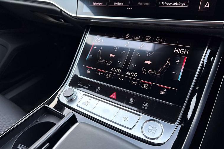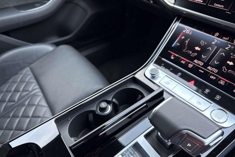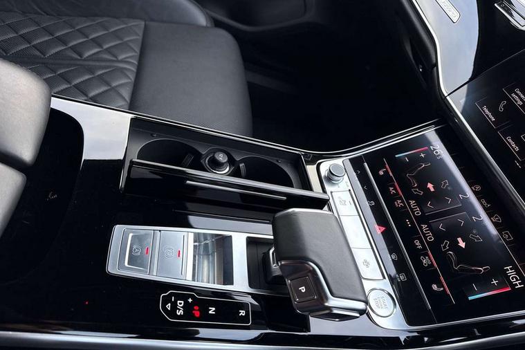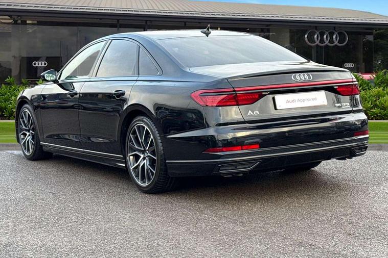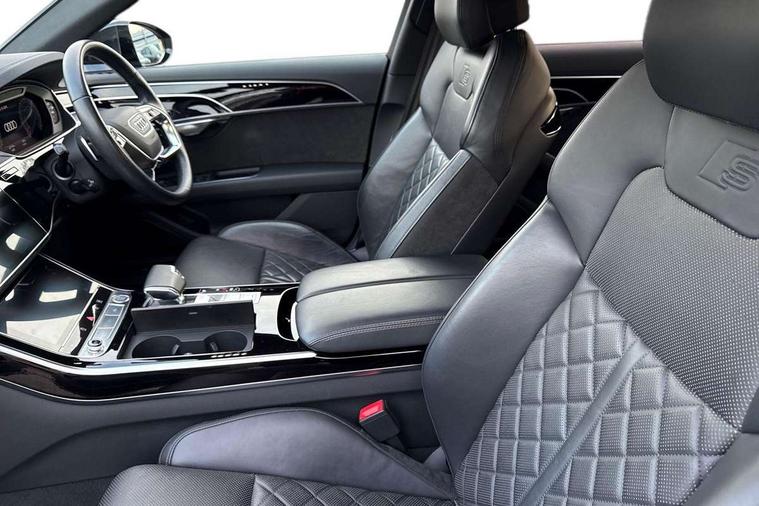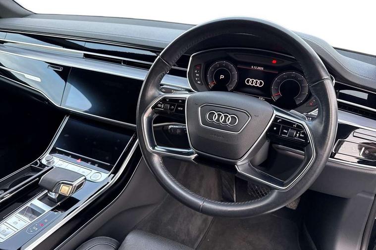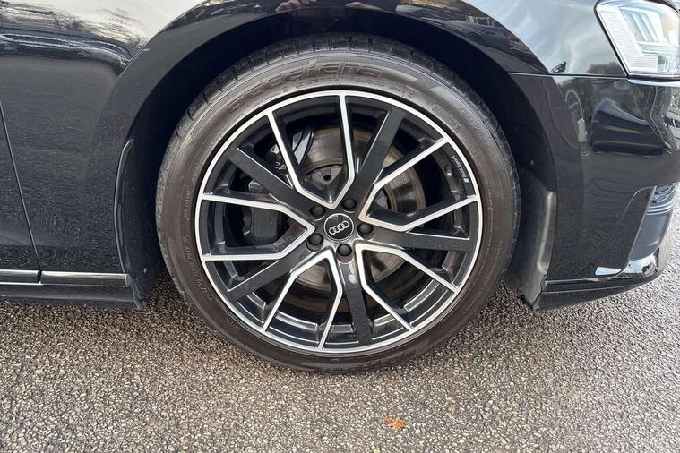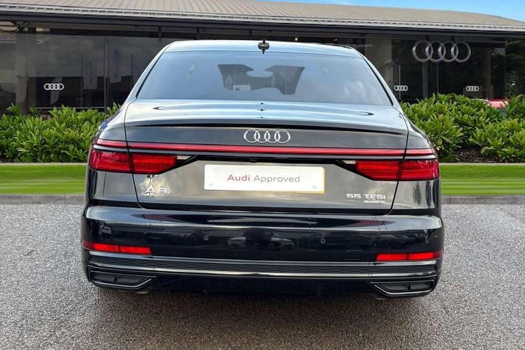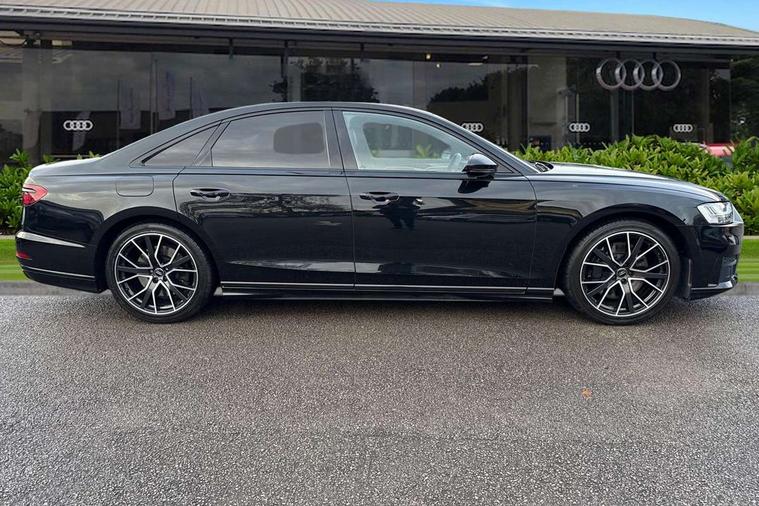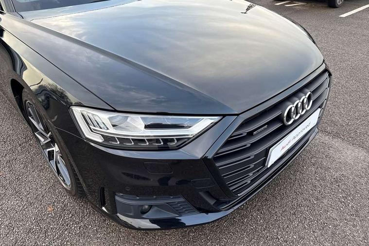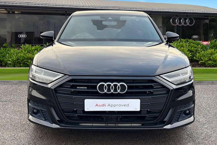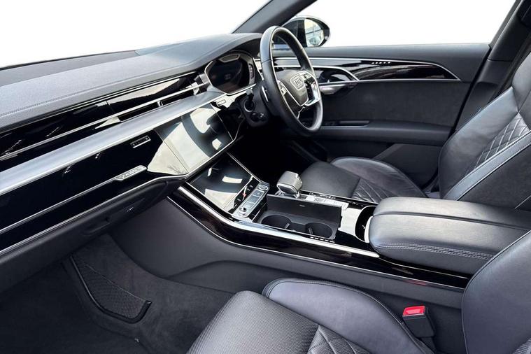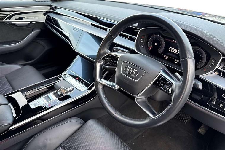 'Lights On' Reminder warning buzzer, Adaptive cruise control with speed limiter, Audi connect safety and service (e-call), Audi drive select, Audi parking system plus with front and rear sensors, Audi phone box with wireless charging, Audi virtual cockpit, Audi wireless smartphone interface, Camera based traffic sign recognition, Colour driver's information system display, Electro - mechanical power assisted steering, Head up Display, Lane departure warning including emergency assist, MMI navigation plus with MMI touch + Twin touch screens with haptic feedback, Operating buttons in black, glass look with haptic feedback including extended aluminium look, Power door closure, Power operated tailgate, Rear view camera, Remote fuel filler release, Service interval indicator, 48V Mild hybrid technology, 8 speed transmission with hill hold assist, Adaptive air suspension, Quattro all wheel drive with self locking centre differential, Audi music interface, Audi sound system, DAB digital radio module, DVD System, Premium MMI radio plus, USB connection, Acoustic double glazing, Audi space frame, Auto dimming rear view mirror, Automatic headlight control system, Body colour bumpers, Body colour door handles, Body colour side protection with aluminium trim strips, Electric front windows, Electric rear windows with isolation switch, Electrically adjustable heated folding + automatically dimming exterior mirrors with memory function and integrated LED indicators, HD matrix healights with LED rear lights + dynamic rear indicators, Heat insulating darkened glass in side and rear windows, Heated rear window, Heated windscreen washer jets, High beam assist, LED brake lights, LED daytime running lights, Privacy glass, Reverse activated kerb-view adjustment on passenger's door mirror, Side skirts, Sports bumpers, 2 zone automatic air conditioning, 3 seat rear bench with centre armrest in 2nd row, 3 seater rear seat system, 4 way electric lumbar support for driver and front passenger, Centre console with cupholders, Climate controlled seats, Comfort centre armrest, Door armrest with storage, Door pockets with bottle holder, Driver and front passenger side sunvisors with illuminated vanity mirrors, Dust/pollen filters, Electric adj front seatbelt height + memory, Electric front seats with memory function, Front/rear floor mats, Glove compartment cooling, Heated front seats, Height/reach electric steering column with easy exit function, Isofix child seat mounting points on outer rear seats, Leather gearknob, Passenger footwell storage net, Reading lights, Rear headrests, Roof mounted sunglasses holder, Twin spoke leather multifunction steering wheel with gearshift paddles, Valcona leather upholstery with front sports seats in diamond quilted with S embossed logo, Black exterior styling pack - A8, Connect package plus - A8, High gloss styling pack - A8, LED ambient interior lighting pack - A8, 3 point seatbelts on all rear seats, ABS/EBD, Active front headrest system, ASR traction control, Audi pre sense basic, Audi pre sense front, Driver/Front Passenger airbags, EDL traction control, Electromechanical parking brake, ESP, Extended pedestrian protection measures, Front and rear side airbags with head airbag system, Front brake discs, callipers painted black, Front passenger airbag deactivation, Rear brake discs, callipers painted black, Rear child proof door locks, Seatbelt reminder + electric contact in buckle + advanced safety equipment, Tyre pressure warning light, Warning triangle and first aid kit, Advanced key, Anti theft alarm tow away protection, Anti-theft wheel bolts and wheel loosening detection, Locking wheel bolts, Remote central locking, Dark matt brushed aluminium lower inlays, Piano black finish upper inlays,
