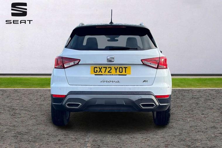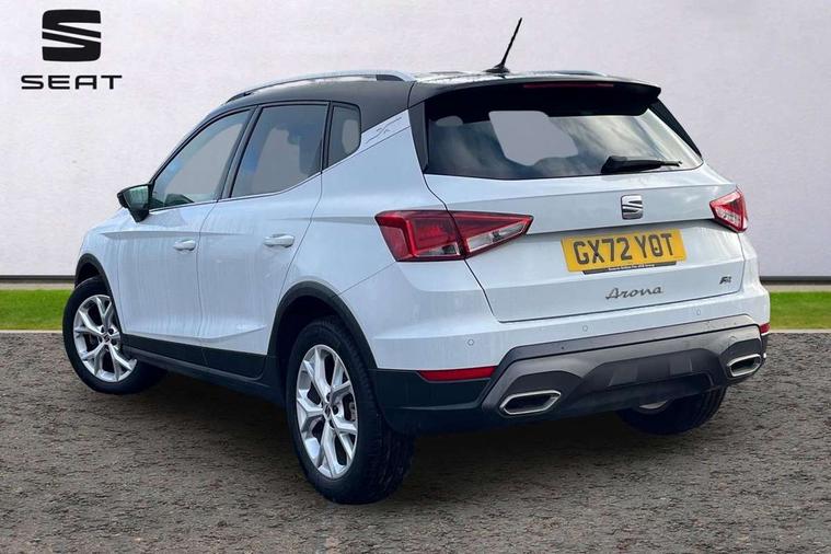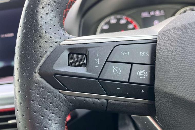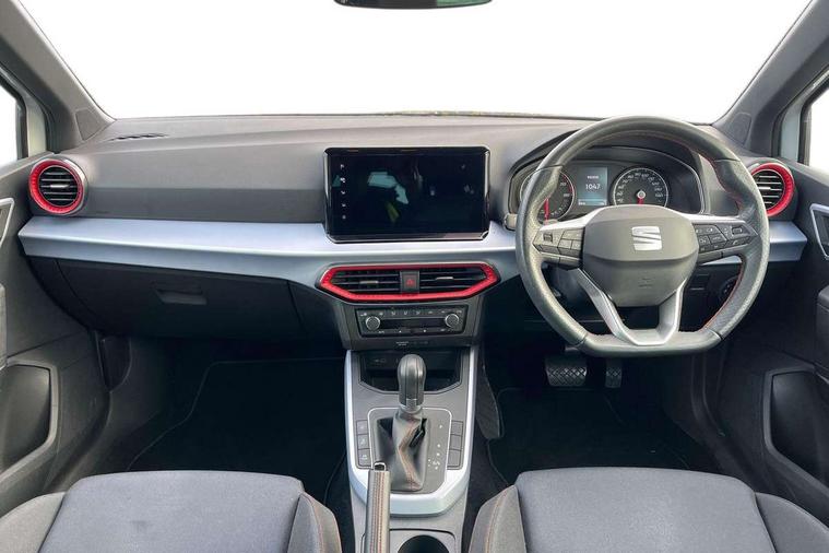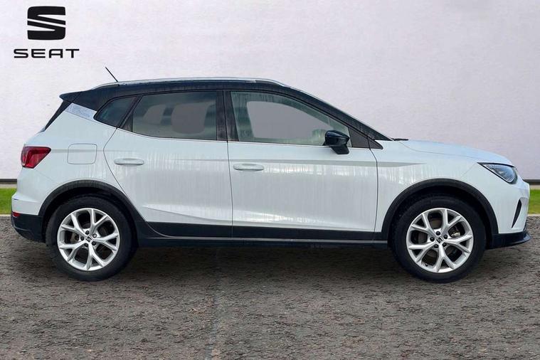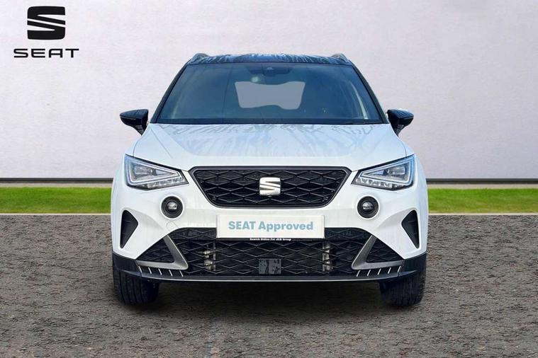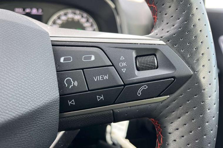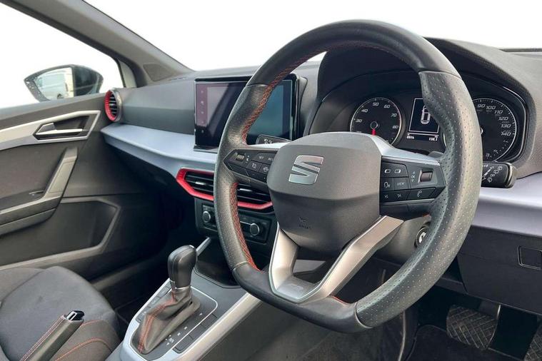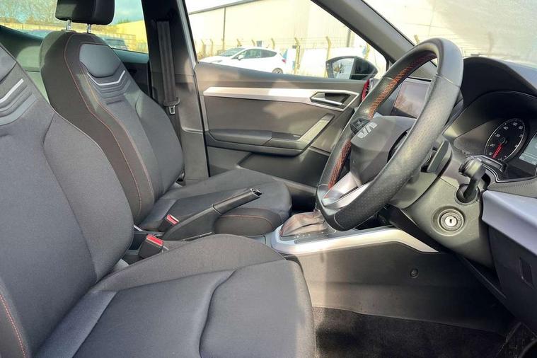'Lights On' Reminder warning buzzer, 8" Digital cockpit, Digital clock, E-call, Electric speed sensitive power steering, Full Link Smartphone Integration with Mirror Link, Apple Car Play, Google Android Auto with USB Type C cable for Apple and Android compatibility, Lane keeping system, Low fuel warning light, Outside temperature display, Rear parking sensor, RPM counter, Seat connect with safety, service, remote and online, SEAT Drive profile - Four different models normal-sport-eco-individual, steering response, throttle response and gear shifts mode, Trip computer, Wireless phone charger, 9.2" colour touchscreen with navigation system, voice control and USB port (type c), Bluetooth interface for hands free and audio streaming, DAB digital radio and AM/FM radio, Steering wheel mounted audio controls, Anti theft roof antenna, Auto dimming interior rear view mirror, Automatic activation of hazard warning lights, Body coloured bumpers, Body coloured door handle inserts, Chrome roof rails and window surrounds, Dark tinted rear windows, Electric front/rear windows, Electrically adjustable, heated and folding door mirrors, Front fog lights with cornering function and rear fog light, FULL LED automatic headlights with dynamic headlight range control, coming and leaving home, LED daytime running lights, LED rear tail lights and licence plate lights, Protective side mouldings, Rain sensing wipers, Rear side wing doors, Rear spoiler, Rear window wash/wipe, Roof colour door mirrors, Third brake light, Twin exhaust pipe styling hidden exhaust pipe, Visible VIN plate, Windshield wiper with intermittent control and potentiometer, 2 cupholders, 3 seat bench in 2nd row, 60/40 split folding rear seat, Aircare filter, Black interior roof, Cloth upholstery, Double boot floor, Driver sunvisor with covered mirror + card holder, Dual zone climate control, Front courtesy light with 2x front and 2x rear reading lights, Front sport seats, Gear shift indicator, Height adjustable front seats, Height/reach adjustable steering column, Illuminated boot, Instrument lighting with brightness control, Interior ambient lighting, Interior light in footwell, central console and door panel, ISOFIX points in outer rear seats with top tether anchorage points, Passenger sunvisor with vanity mirror, Perforated flat bottomed leather steering wheel/gear knob/handbrake with red stitching and FR logo, Single front passenger seat, Steering wheel mounted gearshift paddles, Two front and three rear height adjustable headrests, Interior chrome pack - Arona, 3 point seatbelts on all rear seats, ABS, Active front headrests, Child locks on rear doors, Driver and front passenger airbags with front passenger airbag de activation, front side and curtain airbags, Electronic stability control, Emergency Brake Assist (EBA) and front assist, Front and rear seatbelt reminder, Hill hold control, Multi-Collision braking, Tiredness recognition system, Traction control, Tyre pressure monitoring system, Alarm with back-up horn, Electronic engine immobiliser, Locking wheel bolts, Remote central locking + deadlocks, Tow away protection, Titan black dashboard, 17" Dynamic alloy wheels,