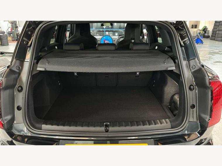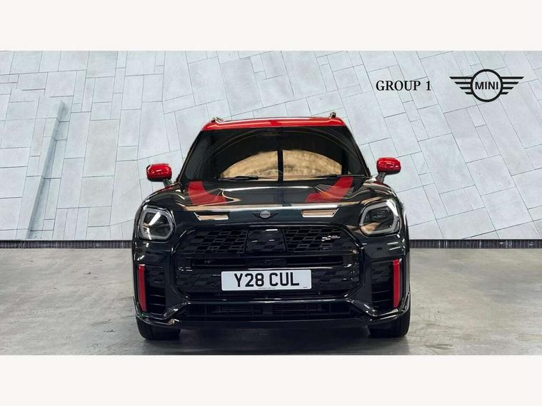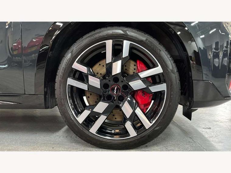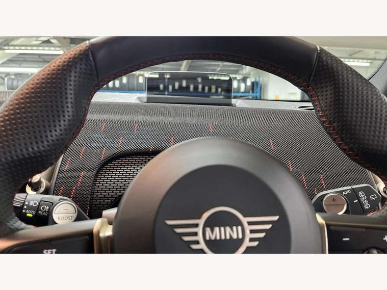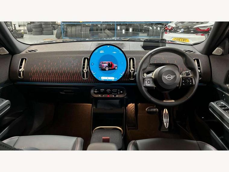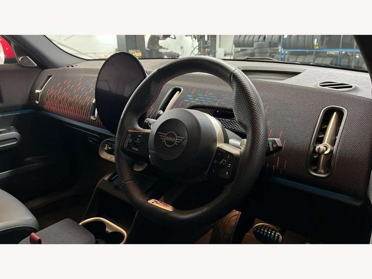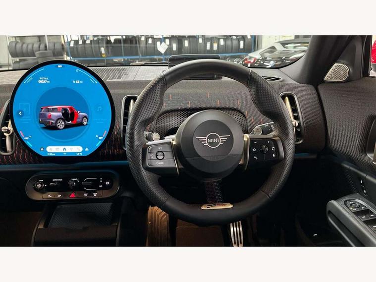 Bluetooth connection, Circular OLED Screen, Compatible mobile phone bluetooth with audio streaming, Cruise Control (DCC), Digital dashboard display, Driving Assistant Plus Preparation, E-call, Electro-mechanical speed dependant steering assistance, MINI Experience Modes, MINI Head up display, Mini navigation system, MINI TeleServices, Parking assistant in camera and ultrasound based assistance system, rear view camera, parking aid and distance control, Double clutch sports transmission, Quad exhaust system, DAB Digital radio, Harman Kardon surround sound system, Personal eSim, Auto tailgate, Electric adjustable heated door mirrors, Front and rear apron, Front and rear electric windows, Heated rear window, High beam assistant, High gloss hexagonal patterned grille surround, Interior rear-view mirror with automatic anti-dazzle function, LED daytime running lights, LED headlights with extended contents including Adaptable light signatures, LED rear lights, LED third brake light, Rain sensor with auto headlights, Rear roof spoiler with airblades, Rear side wing doors, Rear window wiper, Roof rails, 3 seat bench in 2nd row, 60/40 split rear bench seat, Anthracite headliner, Auto air conditioning, Driver and front passenger seat heating, Floor mats, Front armrest, Front headrests, Heated steering wheel, Height and length steering column adjustment, JCW Front sports seats, Lidded storage box in Black/Red knit, Luggage compartment separating net, Perforated Vescin steering wheel, Rear headrests, Seat adjustment for rear seats, Single front passenger seat, Sunvisors with vanity mirrors, Vescin/Cloth upholstery, Wireless charging tray, Interior and exterior mirror package - Mini Countryman, 3x3 point rear seat belts, 6 Airbags - front, side, head and seat belt tensioners, ABS, DSC - Dynamic Stability Control, Electronic handbrake, Electronic Stability Programme (ESP), Front ISOFIX (iSize), Hill descent control, Hill hold assist, Hill start assist, JCW logo in brake calipers, JCW Sport brakes with Chilli Red calipers, Manual rear child locks, Traction control, Tyre pressure monitoring system, Warning triangle, Alarm system with tilt sensor, monitoring doors, bonnet interior and tailgate, Auto drive away locking, Comfort access system, Deadlocking function, Electronic vehicle immobiliser, Locking wheel bolts, Remote control locking, Start/stop toggle with keyless go, JCW Black/Red dashboard knit, 19" JCW Runway Spoke Black alloy wheels, MINI Mobility Kit,