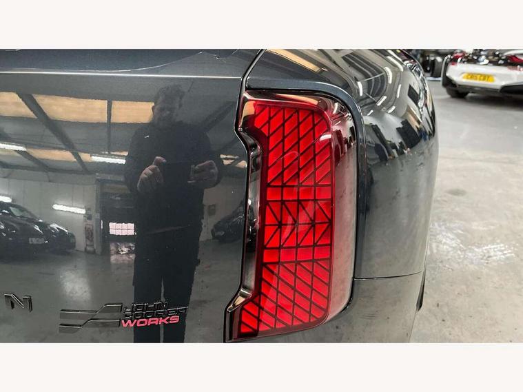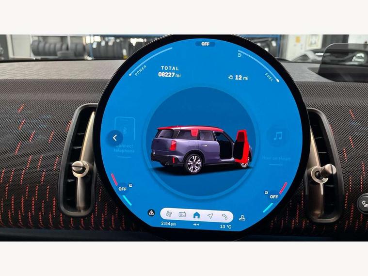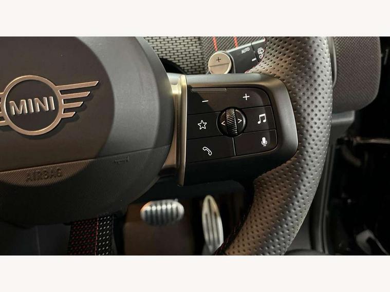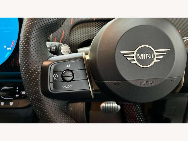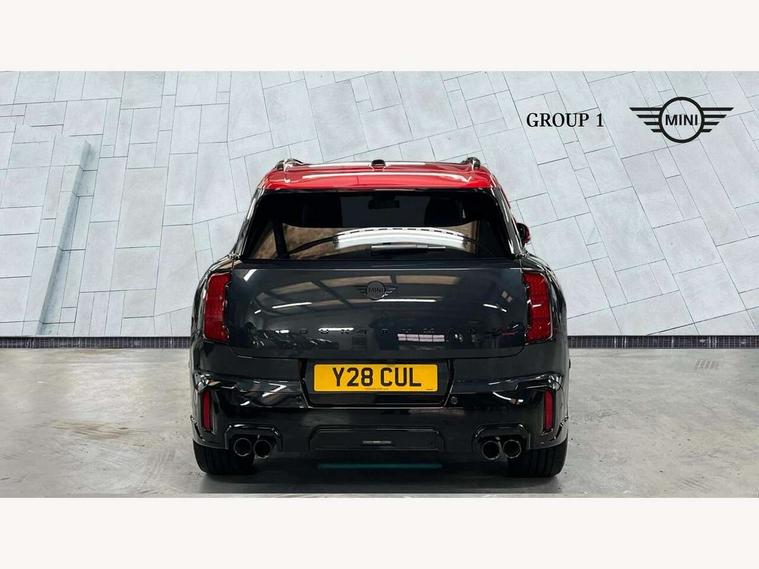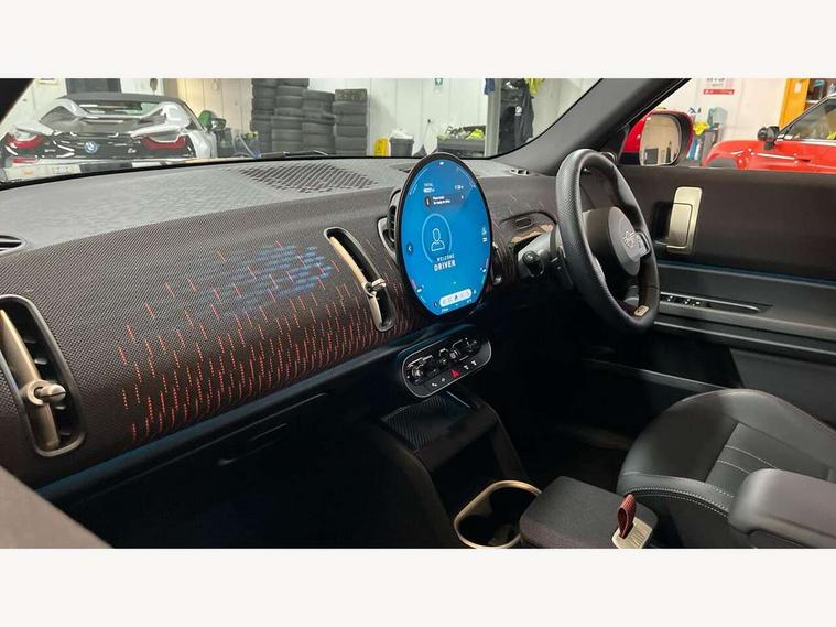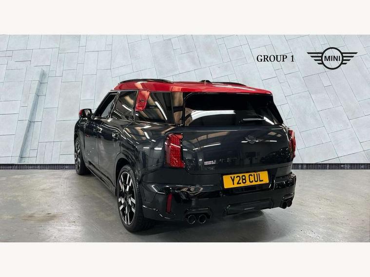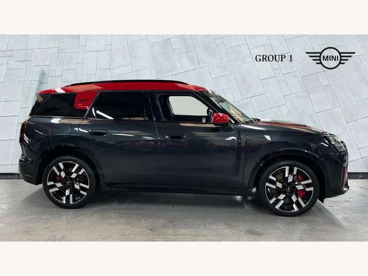 Bluetooth connection, Circular OLED Screen, Compatible mobile phone bluetooth with audio streaming, Cruise Control (DCC), Digital dashboard display, Driving Assistant Plus Preparation, E-call, Electro-mechanical speed dependant steering assistance, MINI Experience Modes, MINI Head up display, Mini navigation system, MINI TeleServices, Parking assistant in camera and ultrasound based assistance system, rear view camera, parking aid and distance control, Double clutch sports transmission, Quad exhaust system, DAB Digital radio, Harman Kardon surround sound system, Personal eSim, Auto tailgate, Electric adjustable heated door mirrors, Front and rear apron, Front and rear electric windows, Heated rear window, High beam assistant, High gloss hexagonal patterned grille surround, Interior rear-view mirror with automatic anti-dazzle function, LED daytime running lights, LED headlights with extended contents including Adaptable light signatures, LED rear lights, LED third brake light, Rain sensor with auto headlights, Rear roof spoiler with airblades, Rear side wing doors, Rear window wiper, Roof rails, 3 seat bench in 2nd row, 60/40 split rear bench seat, Anthracite headliner, Auto air conditioning, Driver and front passenger seat heating, Floor mats, Front armrest, Front headrests, Heated steering wheel, Height and length steering column adjustment, JCW Front sports seats, Lidded storage box in Black/Red knit, Luggage compartment separating net, Perforated Vescin steering wheel, Rear headrests, Seat adjustment for rear seats, Single front passenger seat, Sunvisors with vanity mirrors, Vescin/Cloth upholstery, Wireless charging tray, Interior and exterior mirror package - Mini Countryman, 3x3 point rear seat belts, 6 Airbags - front, side, head and seat belt tensioners, ABS, DSC - Dynamic Stability Control, Electronic handbrake, Electronic Stability Programme (ESP), Front ISOFIX (iSize), Hill descent control, Hill hold assist, Hill start assist, JCW logo in brake calipers, JCW Sport brakes with Chilli Red calipers, Manual rear child locks, Traction control, Tyre pressure monitoring system, Warning triangle, Alarm system with tilt sensor, monitoring doors, bonnet interior and tailgate, Auto drive away locking, Comfort access system, Deadlocking function, Electronic vehicle immobiliser, Locking wheel bolts, Remote control locking, Start/stop toggle with keyless go, JCW Black/Red dashboard knit, 19" JCW Runway Spoke Black alloy wheels, MINI Mobility Kit,