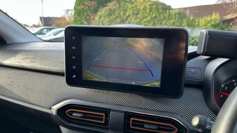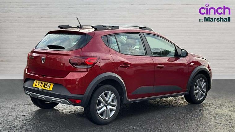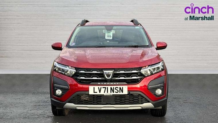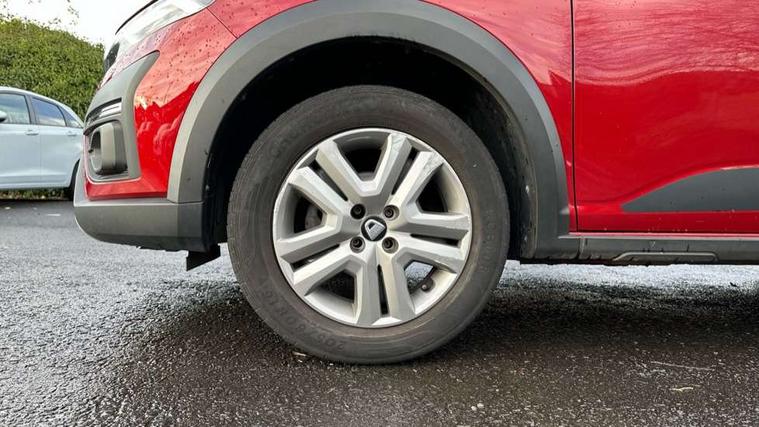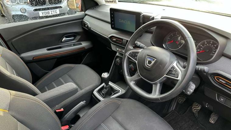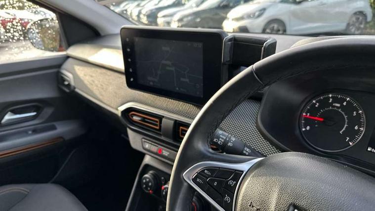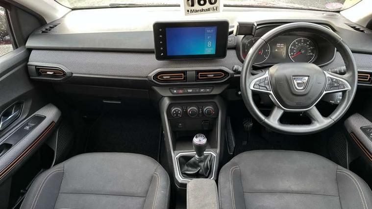 3.5" TFT instrument panel with on-board computer, Cruise control with speed limiter, eCall emergency call system, Eco mode, Electric power assisted steering, Rear parking sensors, Rev counter, Reversing camera, Stop/start system, 8" Media display - DAB radio, smartphone replication, bluetooth, 4 speakers, Apple CarPlay and Android Auto, USB connection for data transfer and charging, USB socket, 3 speed windscreen wipers, Auto lighting, Automatic wipers, Body colour door handles, Body colour door mirrors, Body coloured bumpers, Chrome longitudinal roof bars, Chrome radiator grille, Electrically adjustable and heated door mirrors, Front fog lights, Heated rear window, High level third brake light, LED automatic daytime running lights, LED Y-shape Dacia signature lighting, Modular roof bars, One touch electric front windows, Rear electric windows, Rear wash/wipe, Stepway inscription on radiator grille and roof bars, Tinted windows, 1/3 to 2/3 split folding rear seats, 12 volt front socket, 12 volt rear socket, 3 height adjustable rear headrests, Driver + passenger vanity mirrors, Fabric upholstery, Fixed smartphone holder on dashboard, Front armrest, Gear shift indicator, Height adjustable driver seat, Height adjustable front headrests, Height/depth adjustable steering wheel, Isofix points for child seats in both outer rear seats, Manual air conditioning, Satin chrome interior door handles, Satin Chrome/Copper orange air vents, Soft feel steering wheel, Steering wheel controls, 3x3 point rear seatbelts, ABS and Emergency brake assist, Automatic emergency braking system, Child locks on rear doors, Door open warning, Driver airbag, ESC (Electronic Stability Control), ESP + Hill Start Assist, Front curtain airbags, Front seatbelt pretensioners, Front side airbags, Height adjustable front seatbelts, Passenger airbag, Seatbelt reminder for driver and front passenger, Tyre pressure monitor, Automatic central locking, Immobiliser, Keyless entry, Remote central locking, Decopart on instrument panel and door with textile, 16" Flex wheels with full wheel cap,