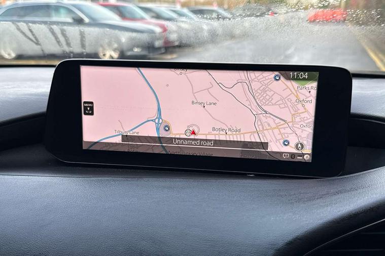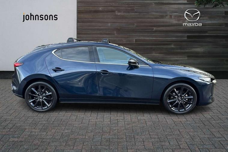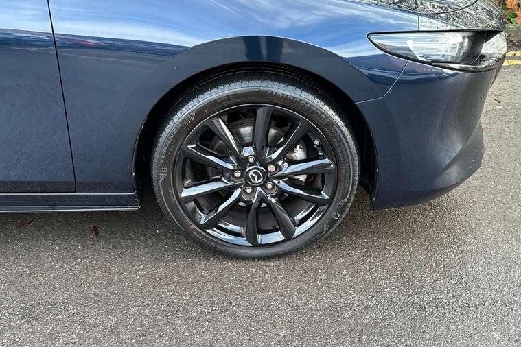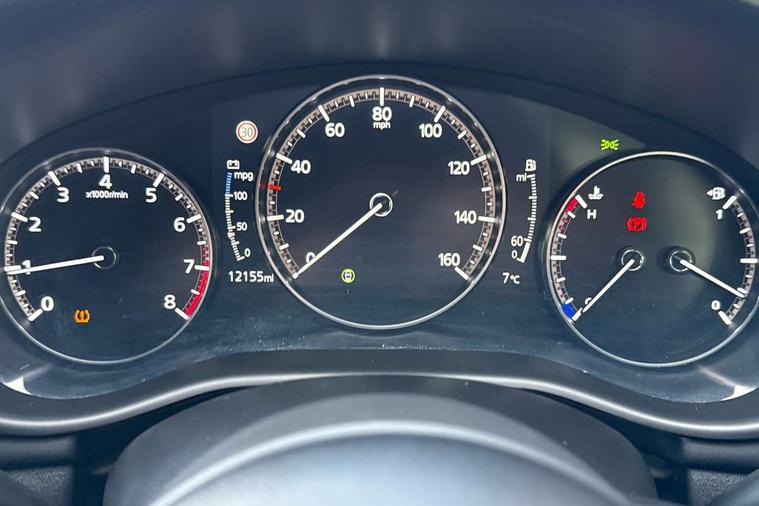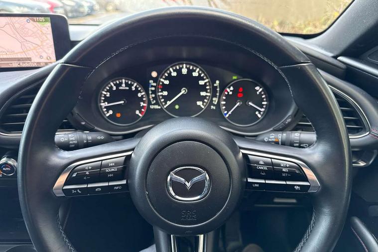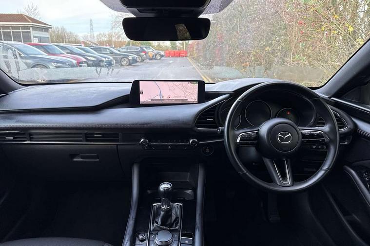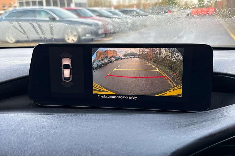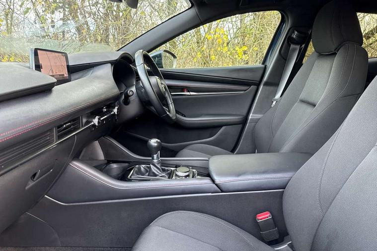10.25" display with Mazda Connect infotainment, 7" colour TFT display, Audio transfer from bluetooth devices, Blind spot monitoring with rear cross traffic alert, Colour active driving display inc Windscreen projected, Traffic Sign Recognition, turn-by- turn navigation and Mazda Radar Cruise Control information, Digital instrument cluster, Driver attention alert system, E-call with GPS, Emergency stop signalling system, Engine start/stop button, Front and rear parking sensor with audible and visual warning, Head up Display, Integrated bluetooth with steering wheel mounted controls, Intelligent speed assist, Lane keep assist system (LAS) with Lane departure warning system (LDWS), Mazda connected services, Mazda Navigation System with european mapping, Mazda Radar Cruise Control, Mobile App interface, Multimedia Commander, PAS, Reversing camera, Service indicator, Tailgate, Traffic sign recognition (TSR), Trip computer, Wireless Apple CarPlay/Android Auto, Wireless charging, Cylinder Deactivation, i-stop, 2 USB-C ports in the front, Mazda Multimedia System with AM / FM / DAB radio with 8 speakers, Auto dimming rear view mirror, B-pillar garnish in piano black, Black door mirrors, Coming/leaving home lighting function, Dark metallic finish signature wing, Daytime running lights, Dual chrome tailpipes tip, Dusk sensing headlights, Electric front/rear windows with one touch/auto up/down, Electrically adjustable, heated auto power folding door mirrors, Front body coloured bumper with black lower bezel, Front kodo turn signal, Gloss black finish front grille, Gloss black rear roof spoiler, High beam control, LED front fog lights, LED headlamps with auto levelling, LED indicator lights, LED rear combination lights, LED third brake light, Privacy glass with dark tinting on rear side windows and rear window, Rain sensing front wipers with adjustable sensitivity and speed, Rear colour coded bumper with gloss black lower moulding, Rear fog lights, Rear side wing doors, Speed adjustable rear wash wiper with intermittent wipe, 12v electrical power outlet, 3 seat bench in 2nd row, 60/40 split fold down rear seats, Black with red stiching steering wheel, gearshift gaitor, dashboard panel, armrest, Cloth upholstery, Dark cloth door panel inserts, Dark roof headlining, ceiling and pillars, Driver seat manual slide, recline, height and seat tilt adjust, Driver, front passenger and two rear door pockets, Driver, Front passenger and two rear grab handles with coathooks, Driver/passenger sunvisors + vanity mirrors (drivers side with ticket holder), Dual zone climate control air conditioning, Folding rear centre armrest with two cup holders, Front and rear courtesy lamps, Front armrest, Front centre storage with two cupholders, Front head restraints, Front passenger seatback pocket, Front passengers seat manual slide, recline and height adjustment, Gear shift indicator, Heated front seats with 3 stage setting, Illuminated glovebox, Interior colouration dashboard and doorcards in black with dark stitching, ISOFIX child seat anchorage points attached on outer rear seats, Leather wrapped gear shift knob, Leather wrapped steering wheel, LED interior light, LED light in luggage compartment, Power outlet in luggage compartment, Roof mounted sunglasses holder, Single front passenger seat, Three height adjustable rear head restraints, Tilt/height adjustable steering wheel, 3 point ELR front seatbelts with pretensioners, 3 rear 3 point seatbelts with ELR, Anti-lock braking system (ABS), Drivers knee airbag, DSC - Dynamic Stability Control, Dual stage driver and single stage passenger airbags, EBD - Electronic brakeforce distribution, Electronic parking brake with auto disengage function and auto hold function, Front and rear curtain airbags, Front passenger airbag cut-off switch, Front side airbags, Front smart city brake support, G-Vectoring control plus, Hill launch assist, Intelligent Traction Control system, Manual child lock in rear doors, Mild Hybrid system with regenerative braking, Seatbelt reminder for driver/front passenger and rear seats, Tyre pressure monitoring system (TPMS), Auto door lock when driving, Remote central locking + deadlocks, Smart keyless entry, Thatcham accredited alarm and immobiliser, 18" Black alloy wheels, Emergency tyre repair kit,