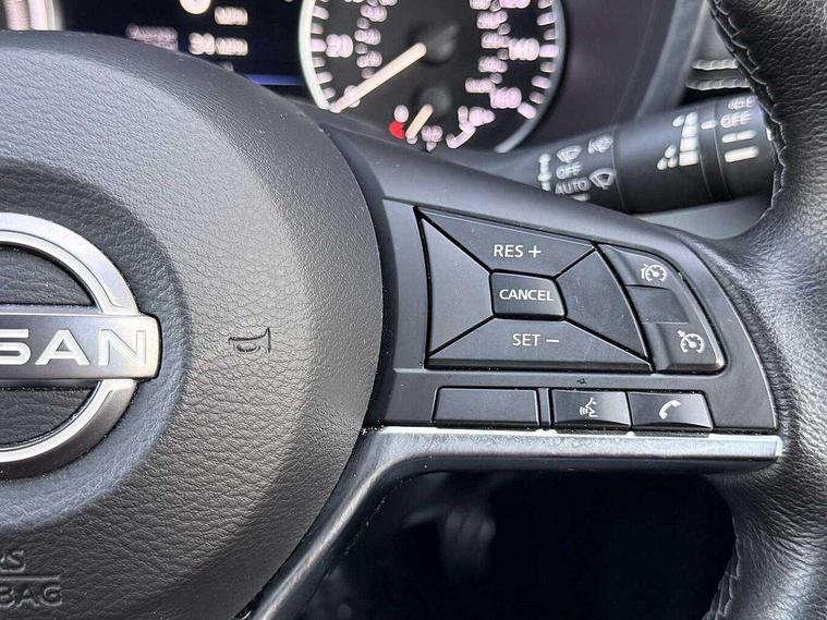 7" full colour TFT screen combimeter, Apple CarPlay and Google Android auto, Drive modes select (Eco, normal and sport), e-Pedal step, Emergency and breakdown call, EV mode selector, Front parking sensor, Intelligent lane intervention, Lane departure warning system, Nissan connect 8" touch screen entertainment system, Nissan connect nav with TomTom traffic, Nissan connect services and Wifi connection, Outside temperature sensor, Power Steering, Rear parking sensor, Traffic sign recognition, Trip computer, Voice recognition, Gasoline particulate filter, 6 speakers, Bluetooth system, USB, Aux-in and 12V socket, DAB Digital radio, Rear console USB port, Auto dimming interior rear view mirror, Auto headlights, Automatic hazard signal with emergency stop signal, Body colour bumpers, Body colour door handles, Electrically adjustable door mirrors with integrated indicators, Follow me home headlights, Front and rear electric window with one touch driver window, Heated and auto folding door mirrors, High beam assist, LED daytime running lights, LED headlamps, LED rear fog lamp, LED rear lamps, Rain sensor windscreen wipers, Rear privacy glass, Rear side wing doors, Rear wiper, Three blink turn signal, 3 height adjustable rear headrests, 3 seat bench in 2nd row, 60/40 split folding rear seat, Automatic climate control, Card holder on driver sunvisor, Cloth upholstery with black and metallic grey syntech leather inserts, Driver and passenger sliding and reclining seats, Driver side rear coat hanger, Driver/passenger sunvisors and vanity mirrors, Front and rear cabin lights, Front armrest, Front door pockets with bottle holders, Front head restraints, Front/rear passenger grab handles, Grey synthetic leather kneepad, Height adjustable driver's seat, Internal chrome door handles, Leather gearshift knob, Leather steering wheel, Luggage board, Luggage space lighting, Monoform sporty seats, Multifunction steering wheel, Rear door bottle holders, Single front passenger seat, Steering wheel mounted gearshift paddles, Telescopic steering wheel adjustment, Two cupholders in front centre console, Two rear isofix child seat anchorage points with top tether, Welcome light and console tray ambient lighting, ABS with EBD and brake assist, Active ride control, Active Trace Control, Driver and passenger airbags, Driver and passenger side airbags, Electric handbrake with auto hold function, Electronic Stability Programme (ESP), Front and rear curtain airbags, Height adjustable seatbelts, Hill start assist, Intelligent emergency braking with pedestrian and cyclist recognition, Rear door child safety locks, Seatbelt reminder for driver/front passenger and rear seats, Single tone horn, Three 3 point rear seatbelts, Traction control, Tyre pressure monitoring system, VDC Dynamic Vehicle Control, Ventilated rear brake discs, Alarm, Immobiliser, Intelligent key and start push button with walk away lock and approach unlock functions, Remote central locking,